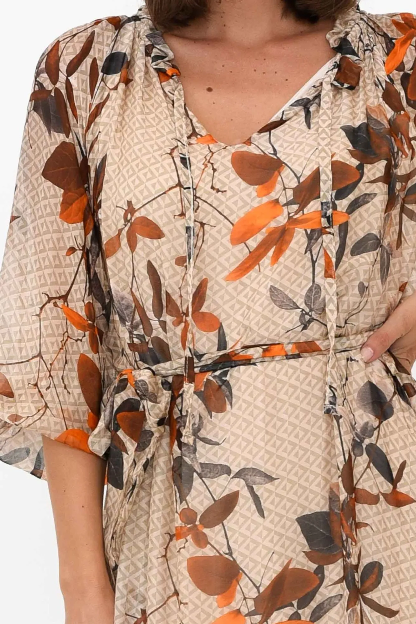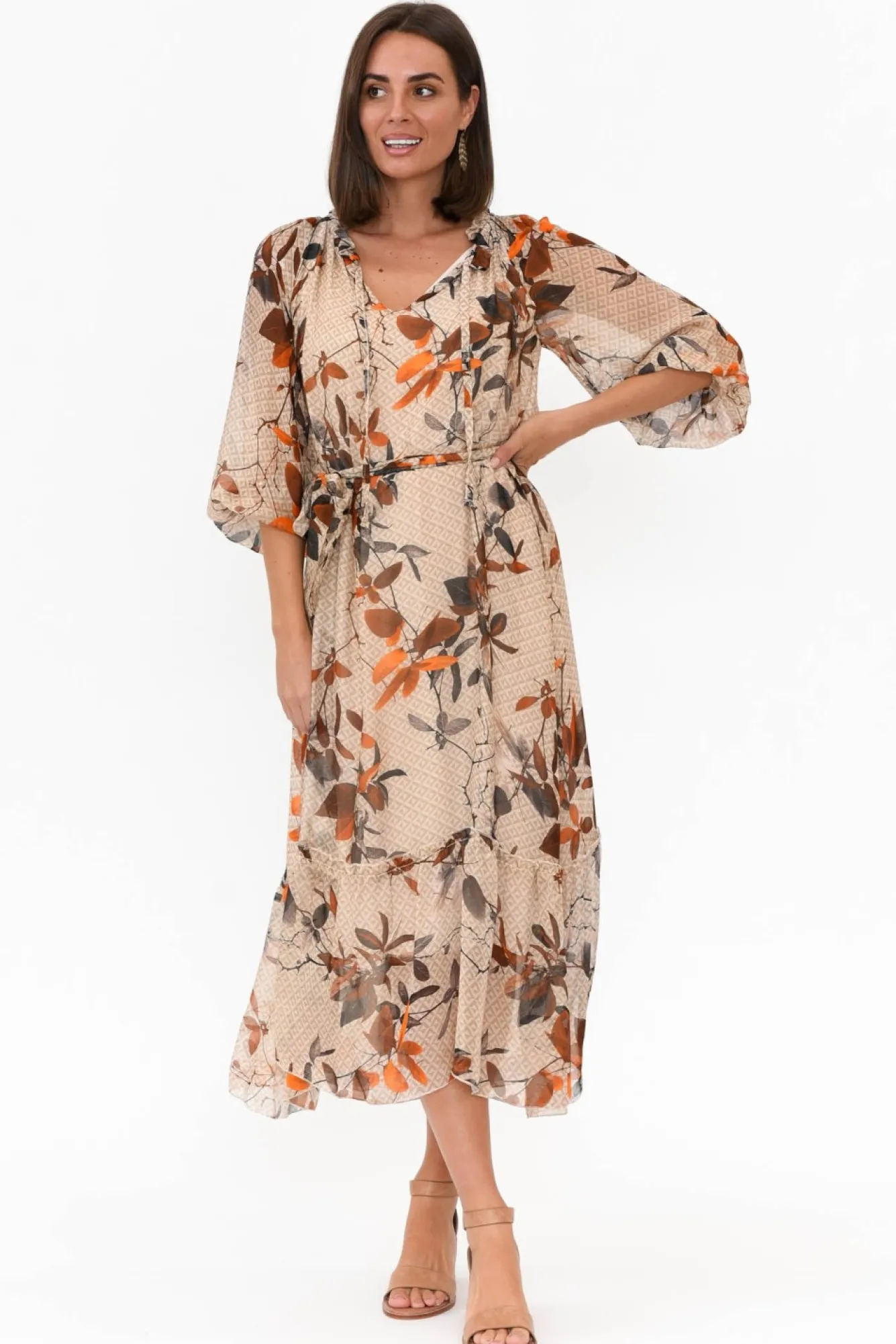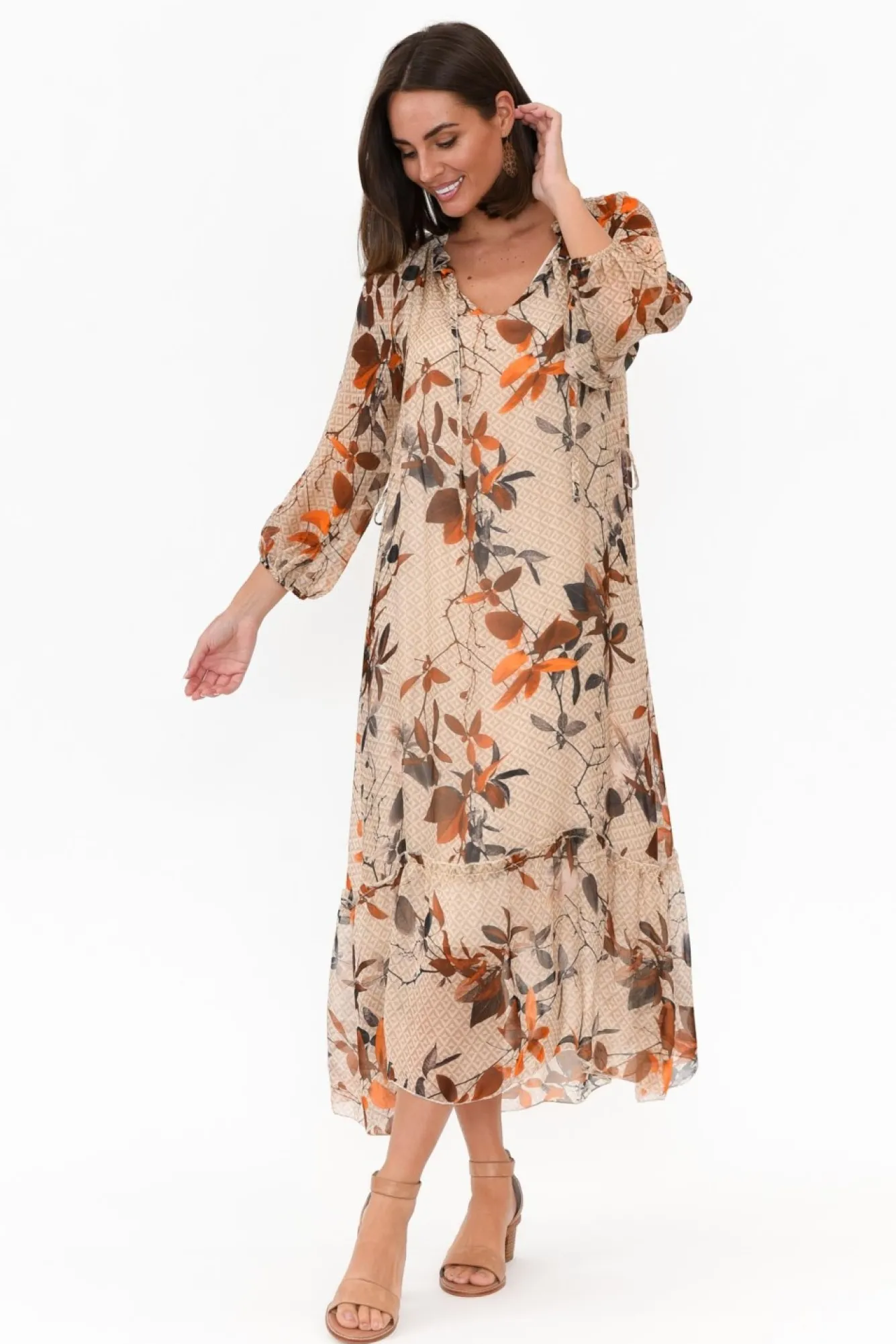 Fit: True To Size. Refer To Size & Fit Tab Below For Specific Size RecommendationNNfabric: Outer: 30% Silk, 70% Viscose Lining: 95% Viscose, 5% ElastaneNa Timeless And Sophisticated Event Style, Crafted In Italy From Luxurious Silk Blend Fabric With A Comfortable Stretchy Lining Nflattering V-Split Neckline Elevated By Ruffle Detail And Adjustable Tie Nbillowy And Sheer Full-Length Sleeves With Elasticated CuffNNclassic A-Line Silhouette With Statement Ruffle TierNfeaturing 168Cm Removable Waist Tie For Figure Definition Ndrapes To Maxi LengthNNNcare: Cool Gentle Hand Wash RecommendedNNcolour: Natural Base With A Stunning Rust Floral Overlay