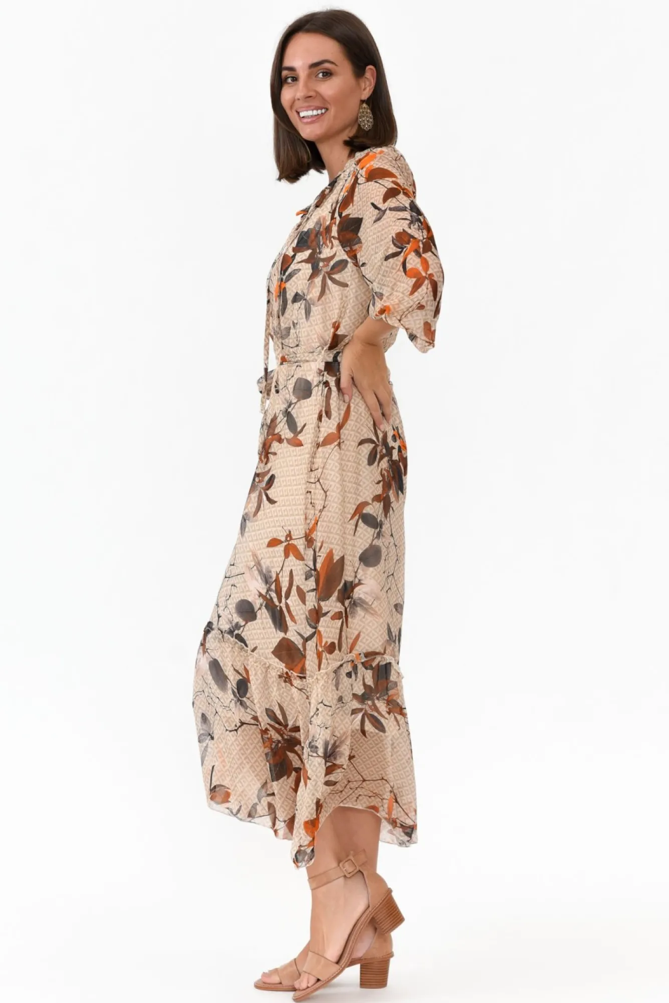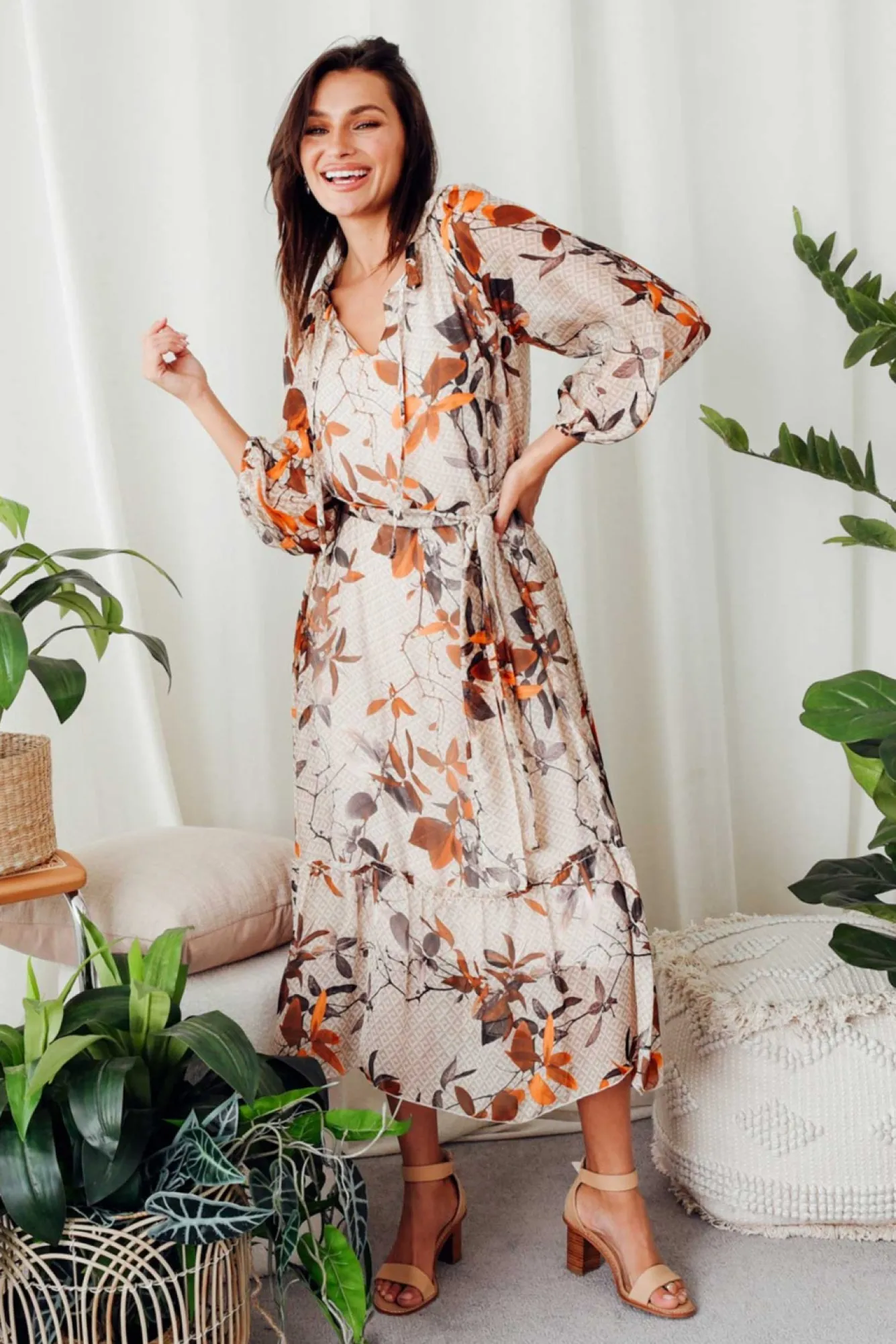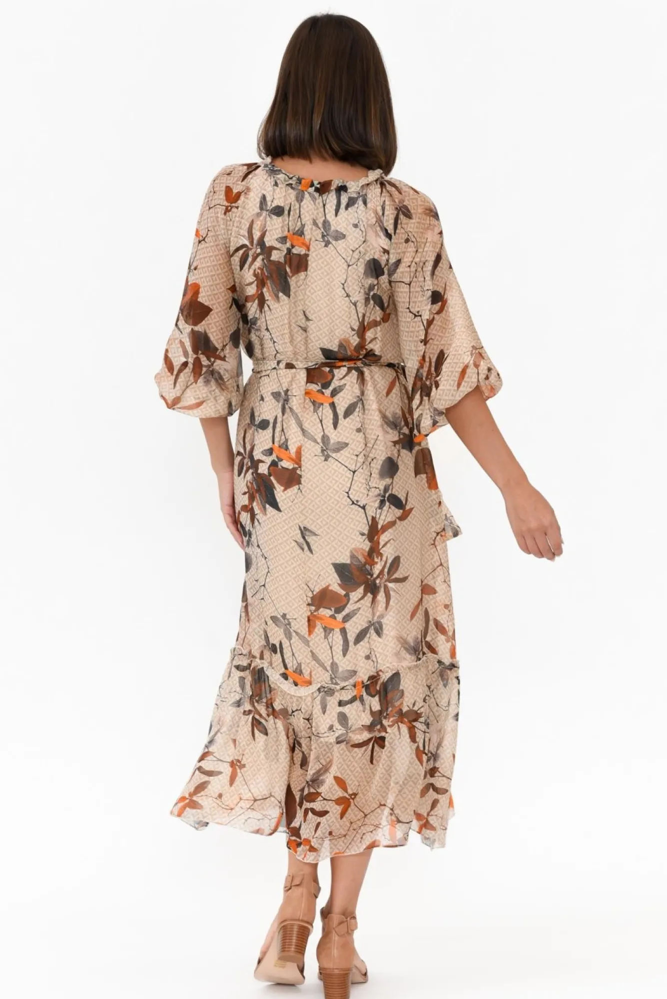 Fit: True To Size. Refer To Size & Fit Tab Below For Specific Size RecommendationNNfabric: Outer: 30% Silk, 70% Viscose Lining: 95% Viscose, 5% ElastaneNa Timeless And Sophisticated Event Style, Crafted In Italy From Luxurious Silk Blend Fabric With A Comfortable Stretchy Lining Nflattering V-Split Neckline Elevated By Ruffle Detail And Adjustable Tie Nbillowy And Sheer Full-Length Sleeves With Elasticated CuffNNclassic A-Line Silhouette With Statement Ruffle TierNfeaturing 168Cm Removable Waist Tie For Figure Definition Ndrapes To Maxi LengthNNNcare: Cool Gentle Hand Wash RecommendedNNcolour: Natural Base With A Stunning Rust Floral Overlay