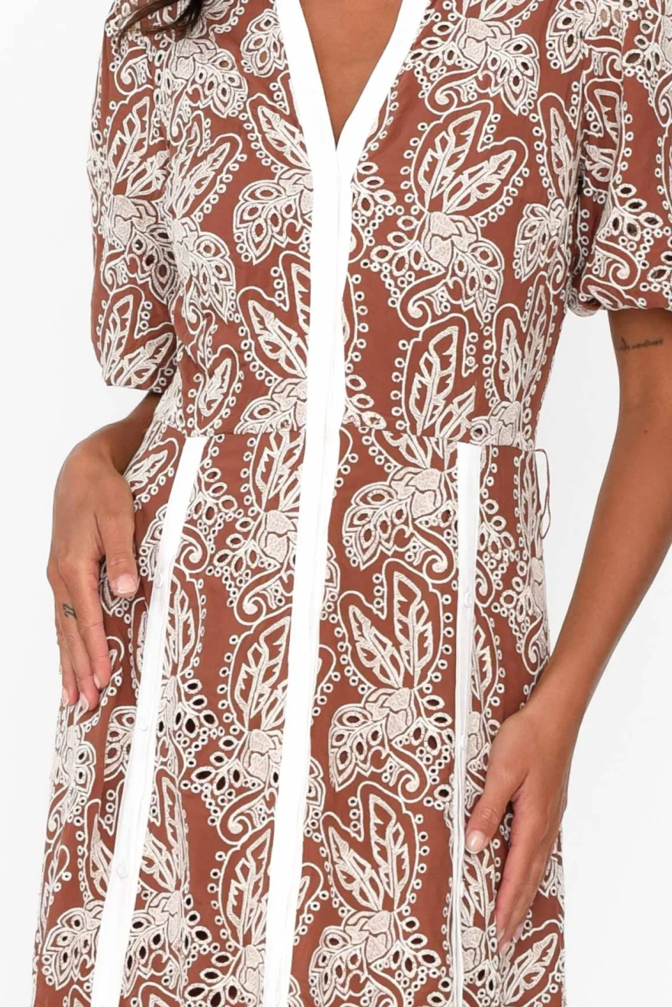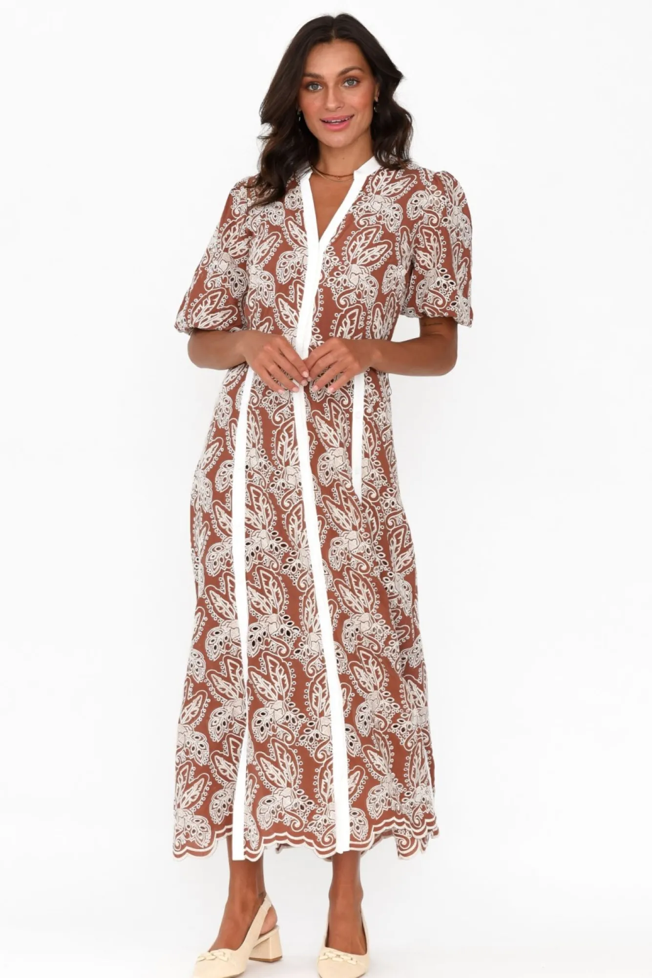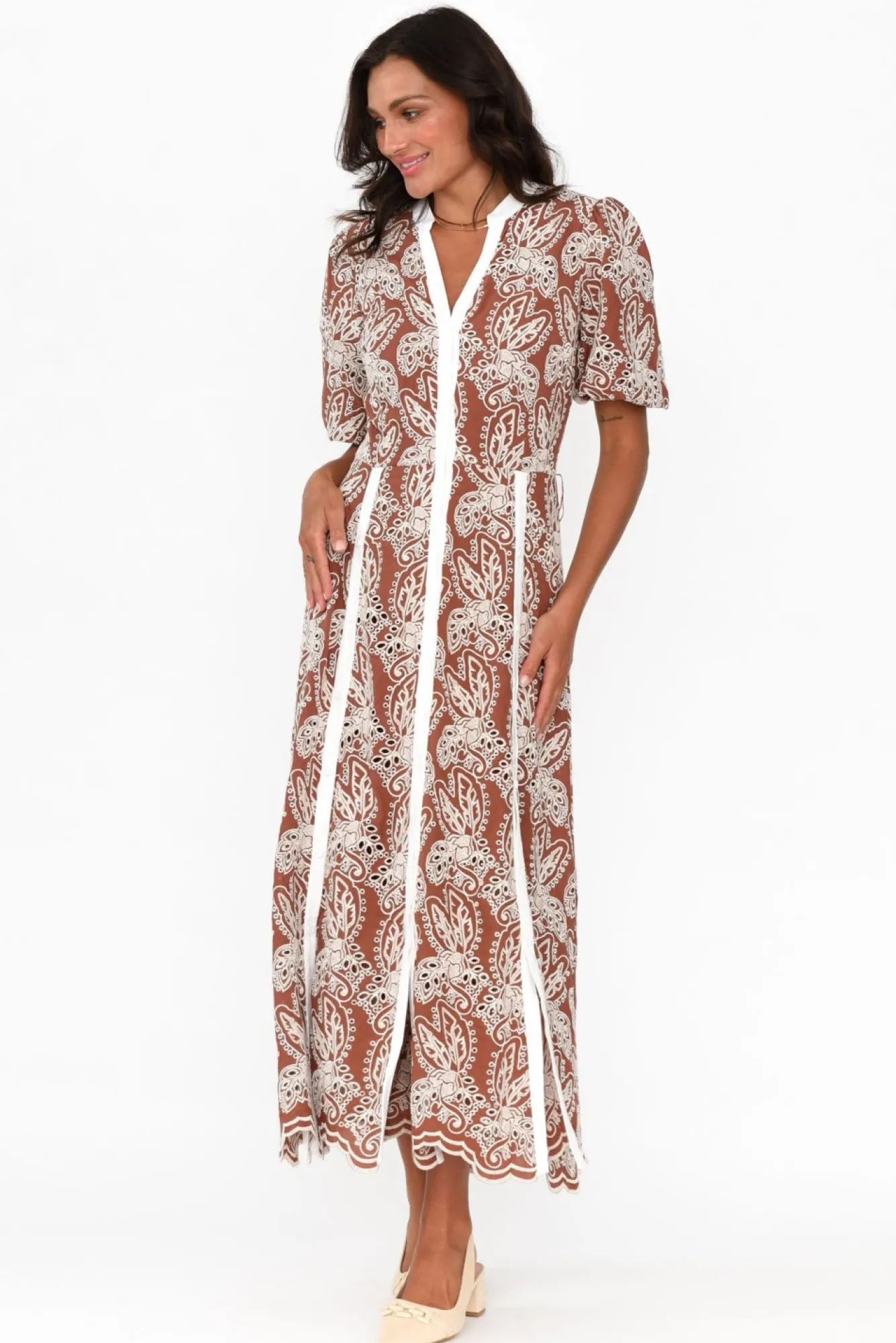 Fit: True To Size. Refer To Size & Fit Tab Below For Specific Size RecommendationNNfabric: 100% ViscoseNluxurious Lightweight And Soft Fabric Adorned With Intricate Embroidery NNchocolate-Hued Separate Knee-Length Slip With Adjustable Straps Nbanded Neckline Leads To V-Split Detail NNfull-Length Button-Front Discreetly Located Behind White Placket Detail Nhalf-Length Puff Sleeves With Hidden Elasticated Cuff NNversatile Shirt Dress Silhouette NNfunctional Button Detailing From Waist Down Featured On Either Side – Option To Create Front Splits At Desired Height!Nmatching Feature Belt Creates Figure Definition NNstraight Hemline Falls To Maxi LengthNNNcare: Cool Gentle Hand Wash RecommendedNNcolour: Bronze Chocolate Shade With Cream Embroidery