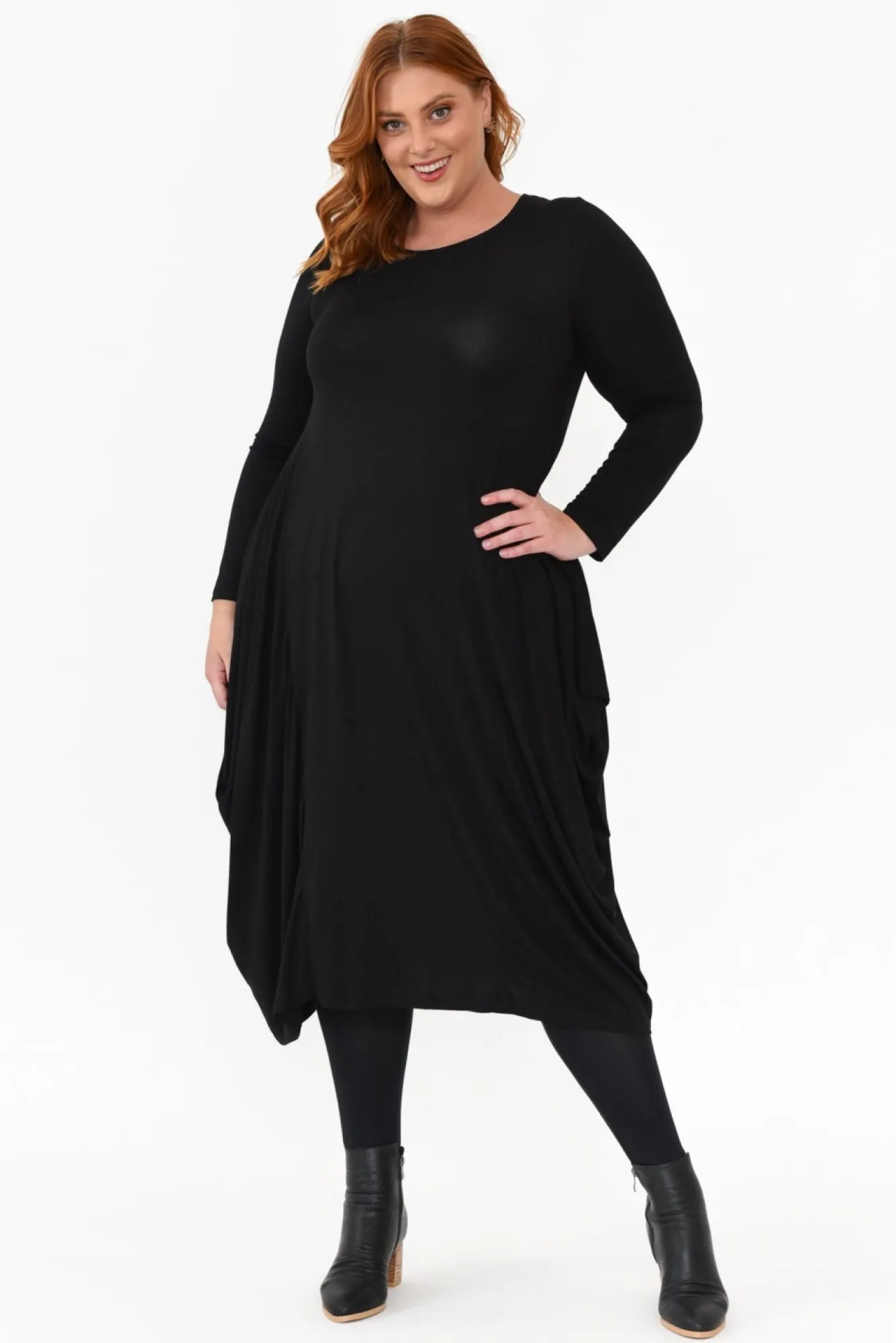 Fit: True. Refer To Size & Fit Tab Below For Specific Size Recommendation NNfabric: 92% Rayon 8% SpandexNlightweight, Soft And Stretchy Rayon-Blend FabricNclassic Round Neckline Flatters The CollarboneNNlong Sleeves Offer Warmth And CoverageNNflattering Balloon Silhouette Accentuated By Fitted Torso And Full SkirtNhemline Falls To Midi LengthNNcare: Cool Gentle Machine Wash RecommendedNNcolour: Timeless Black