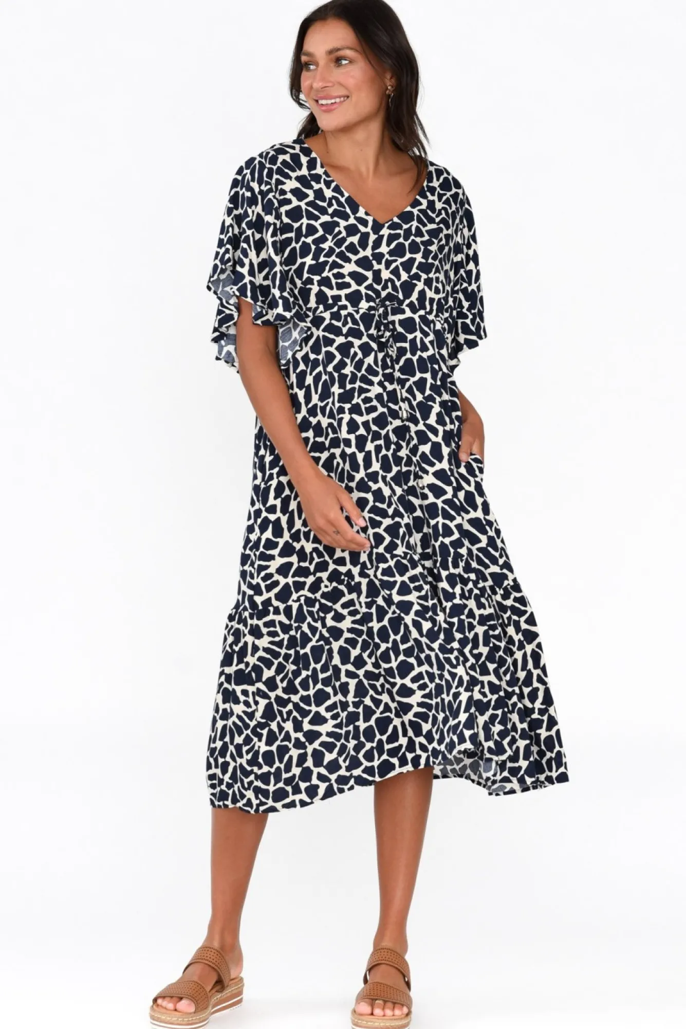 Fit: True To Size. Refer To Size & Fit Tab Below For Specific Size RecommendationNNfabric: 100% RayonNbreezy Lightweight, Non-Stretch Rayon Designed With A Soft Hand Feel NNsharp V-Neckline Highlights The Collarbones NNhalf-Length Flutter Sleeves NNfeature Empire Waist Defined By Adjustable Drawstring Tie Nsubtle Tiered Silhouette With Two Side Seam Pockets NNstraight Hemline Falls Below The Knee NNNcare: Cool Gentle Machine Wash RecommendedNNcolour: Deep Navy Abstract Spot Print Over A Cream Base