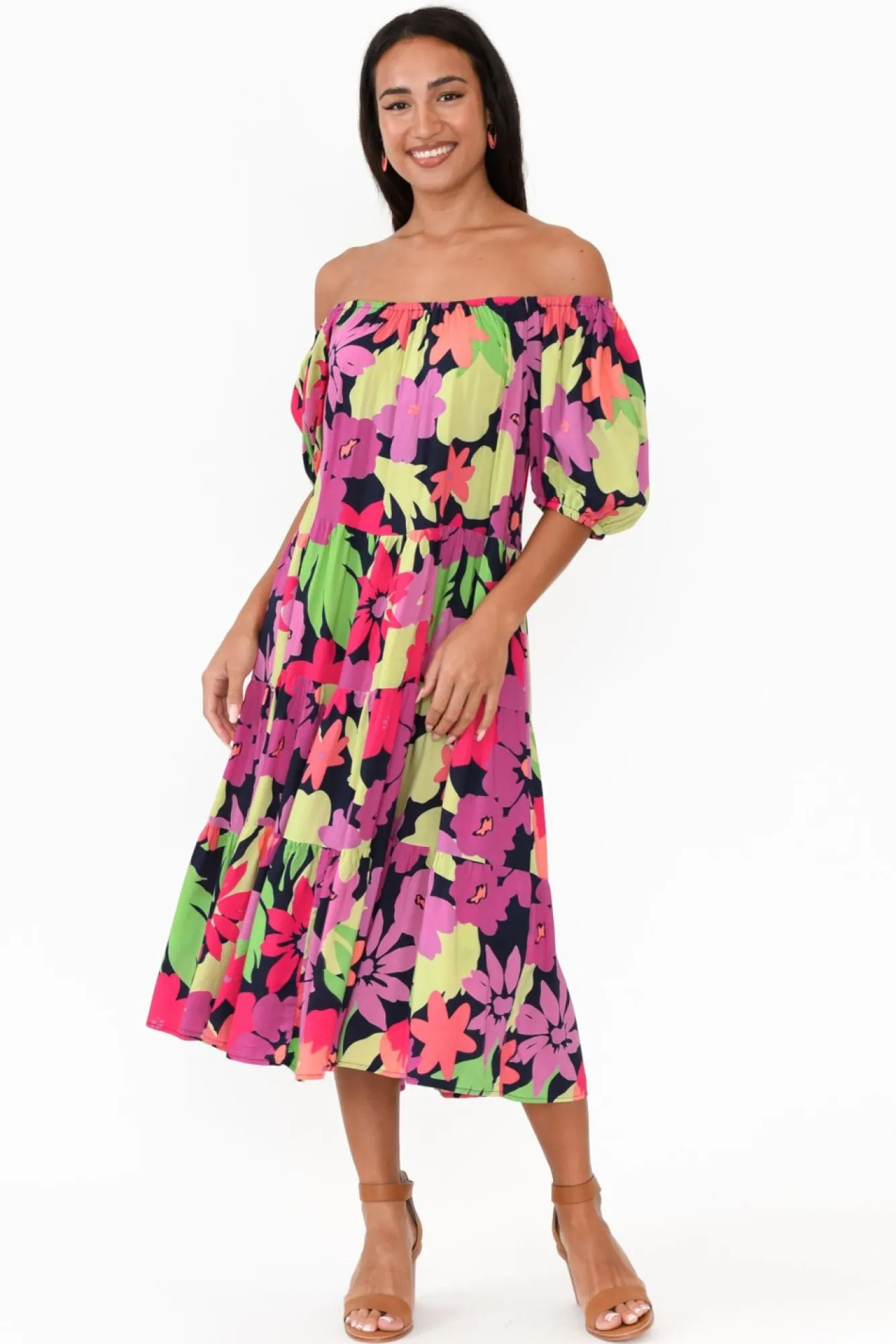 Fit: True To Size. Refer To Size & Fit Tab Below For Specific Size Recommendation NNfabric: 100% RayonNthe Perfect Summer Event-Ready Dress NNlovely Lightweight, Breathable And Soft Fabric Nflattering Off-Shoulder Neckline, Highlights The Decolletage NNcan Also Be Worn On The Shoulders For A More Rounded Neckline Ngorgeous Half Length Puff Sleeve Nrelaxed, Tiered A-Line Silhouette – A Summer Staple Must-Have!Nfrill Hem Falls Below Knee LengthNNNcare: Cool Gentle Hand Wash RecommendedNNcolour: Black Base With Lovely Tropical Floral Print