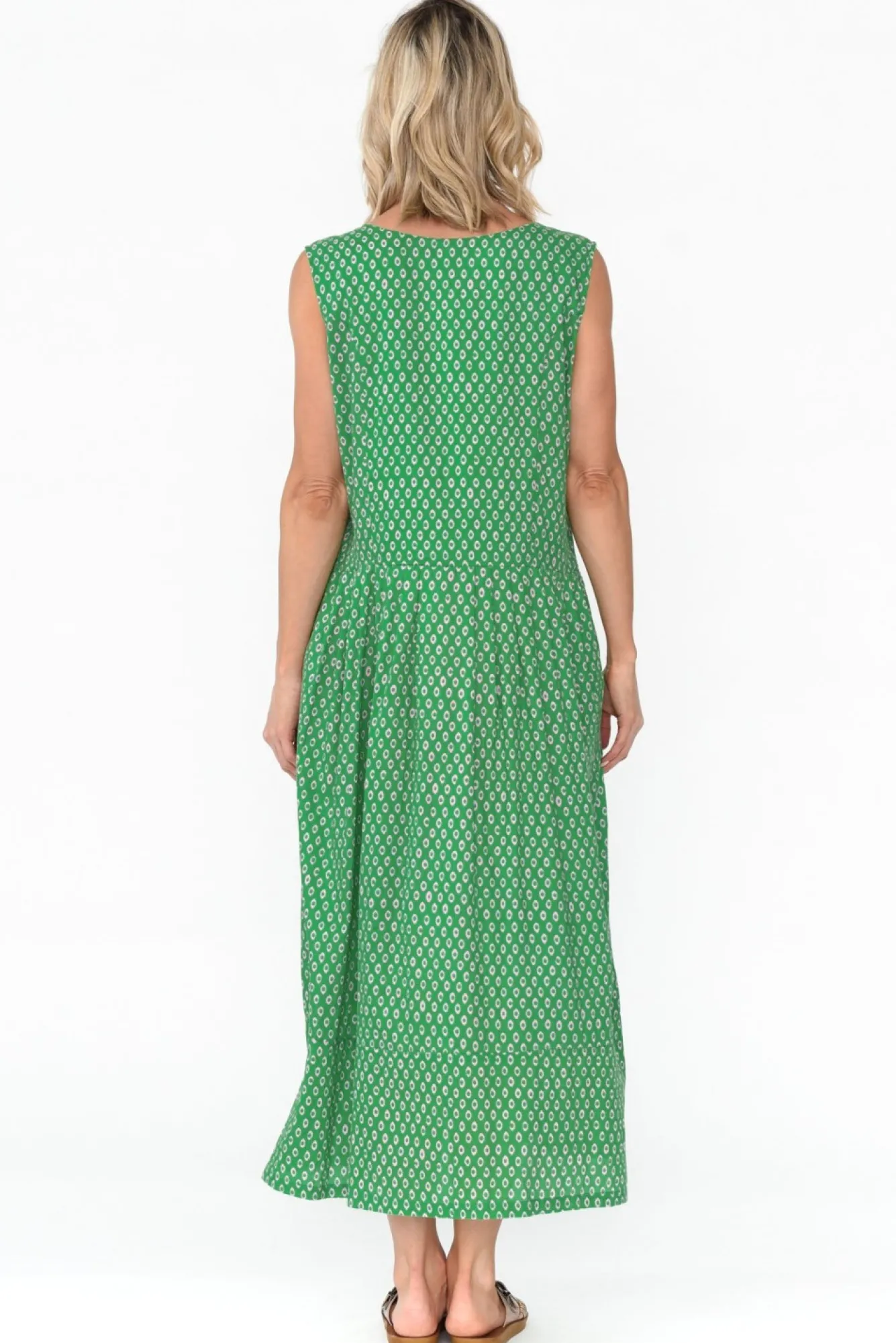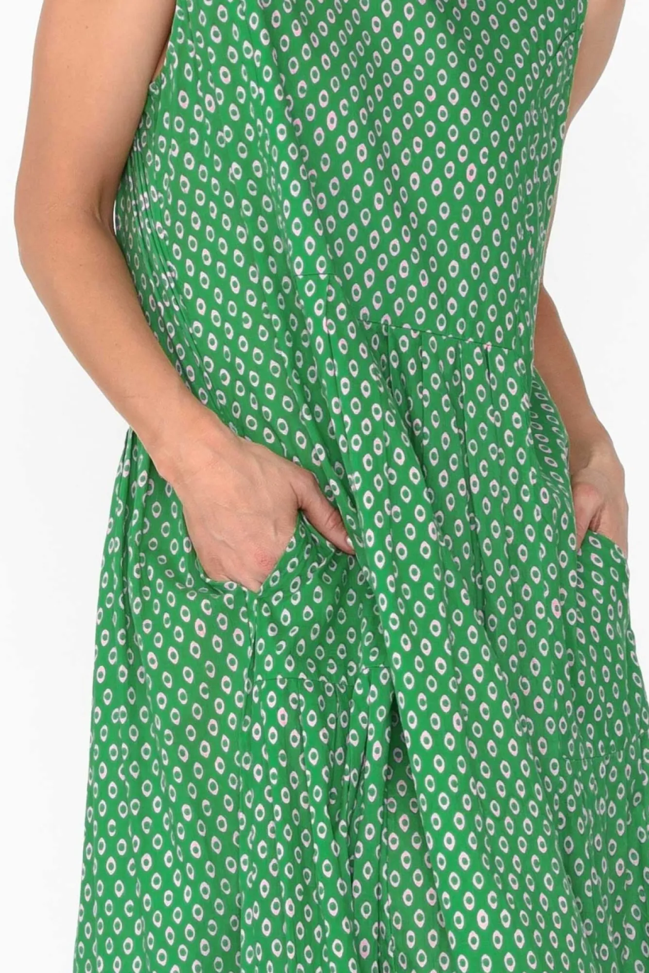 Fit: True To Size. Refer To Size & Fit Tab Below For Specific Size RecommendationNNfabric: 100% CottonNNlightweight, Soft And Wonderfully Breathable FabricNclassic Rounded Neckline Site Below CollarbonesNNsummery Sleeveless Design NNsoft Pleats Fall From The Floaty, Non-Stretch WaistbandNtiered A-Line Silhouette NNtwo Discreet Hip PocketsNNstraight Hem Falls To A Maxi Dress NNNcare: Cool Gentle Hand Wash RecommendedNNcolour: Bright Green With A Sleek, Understated Circle Pattern