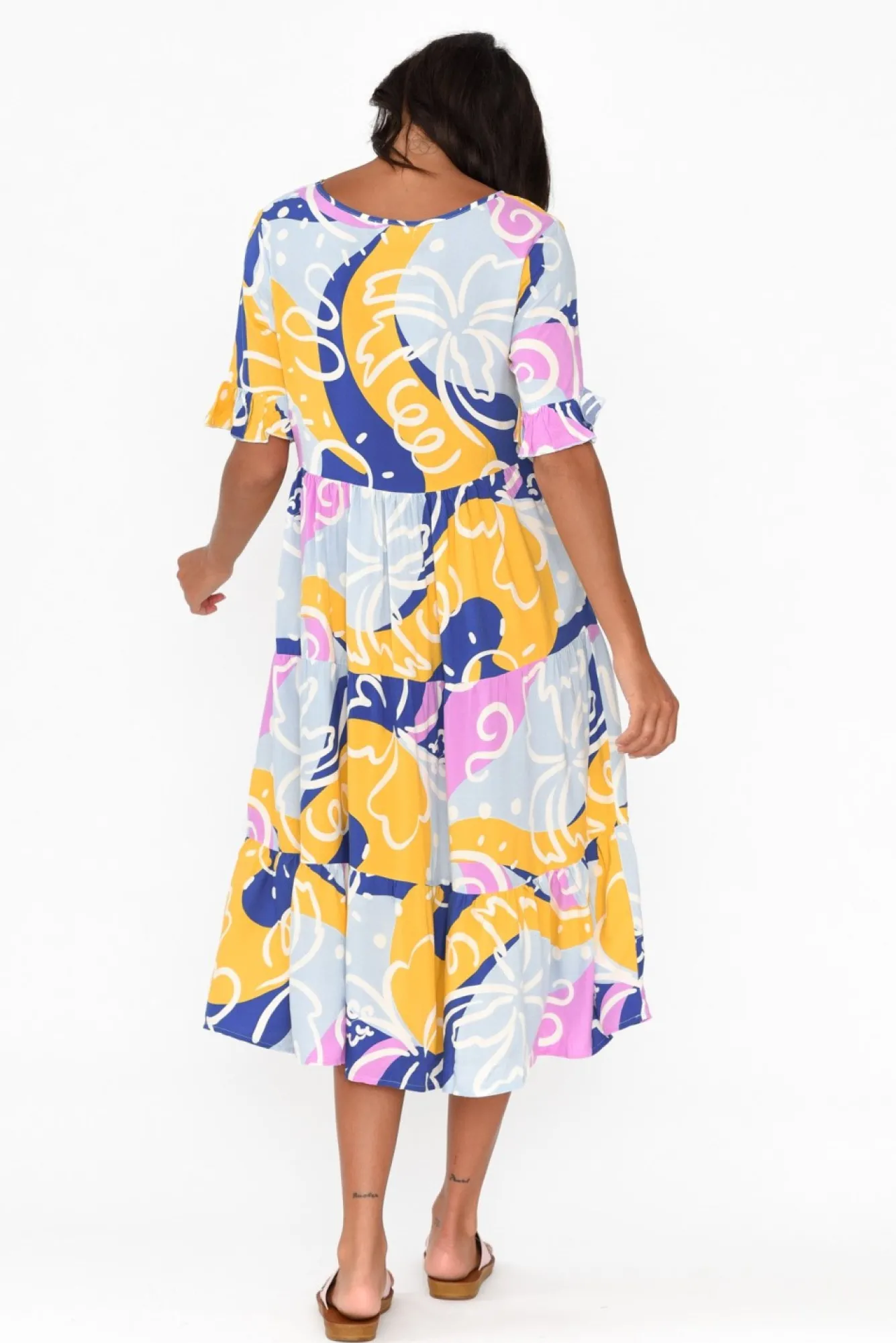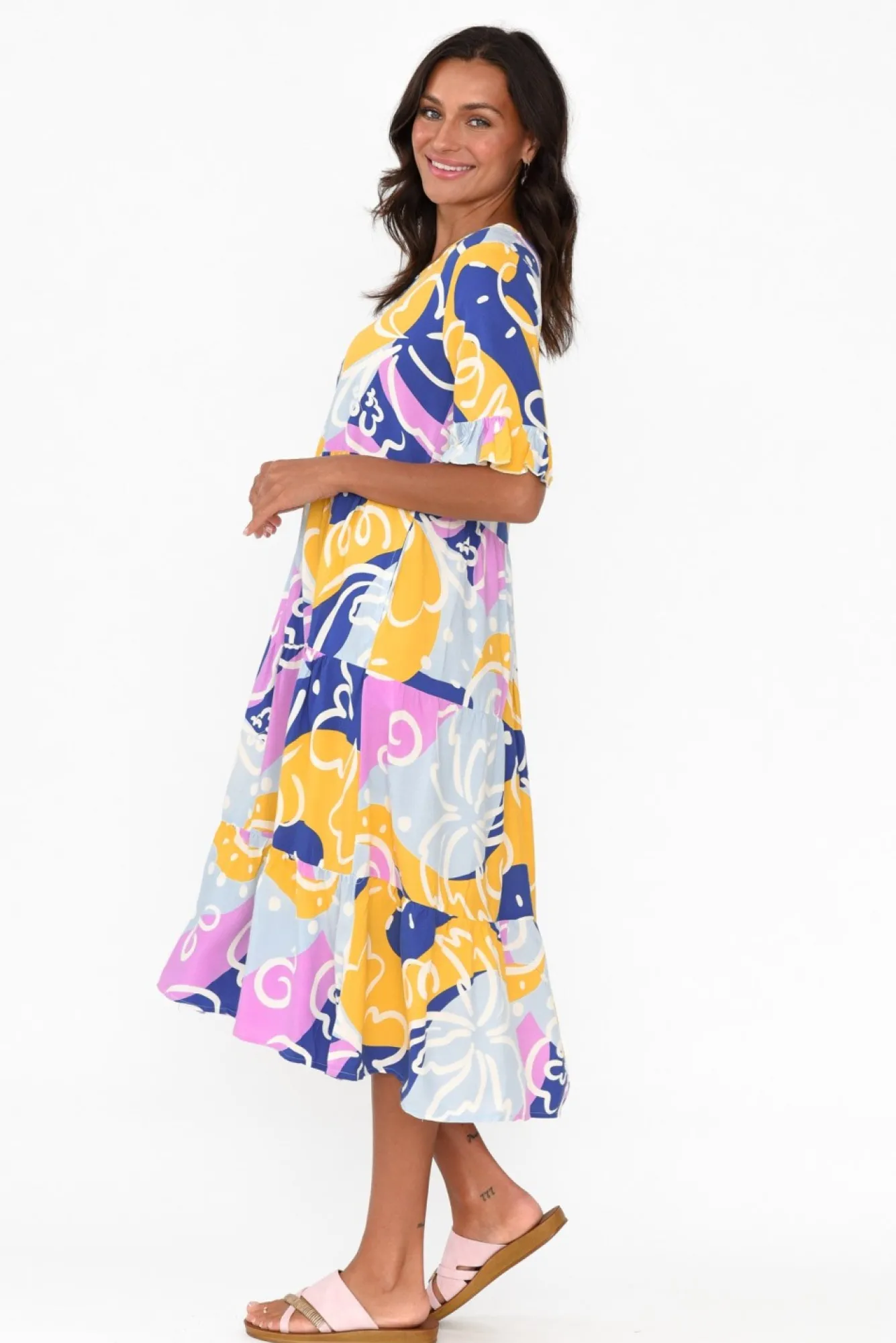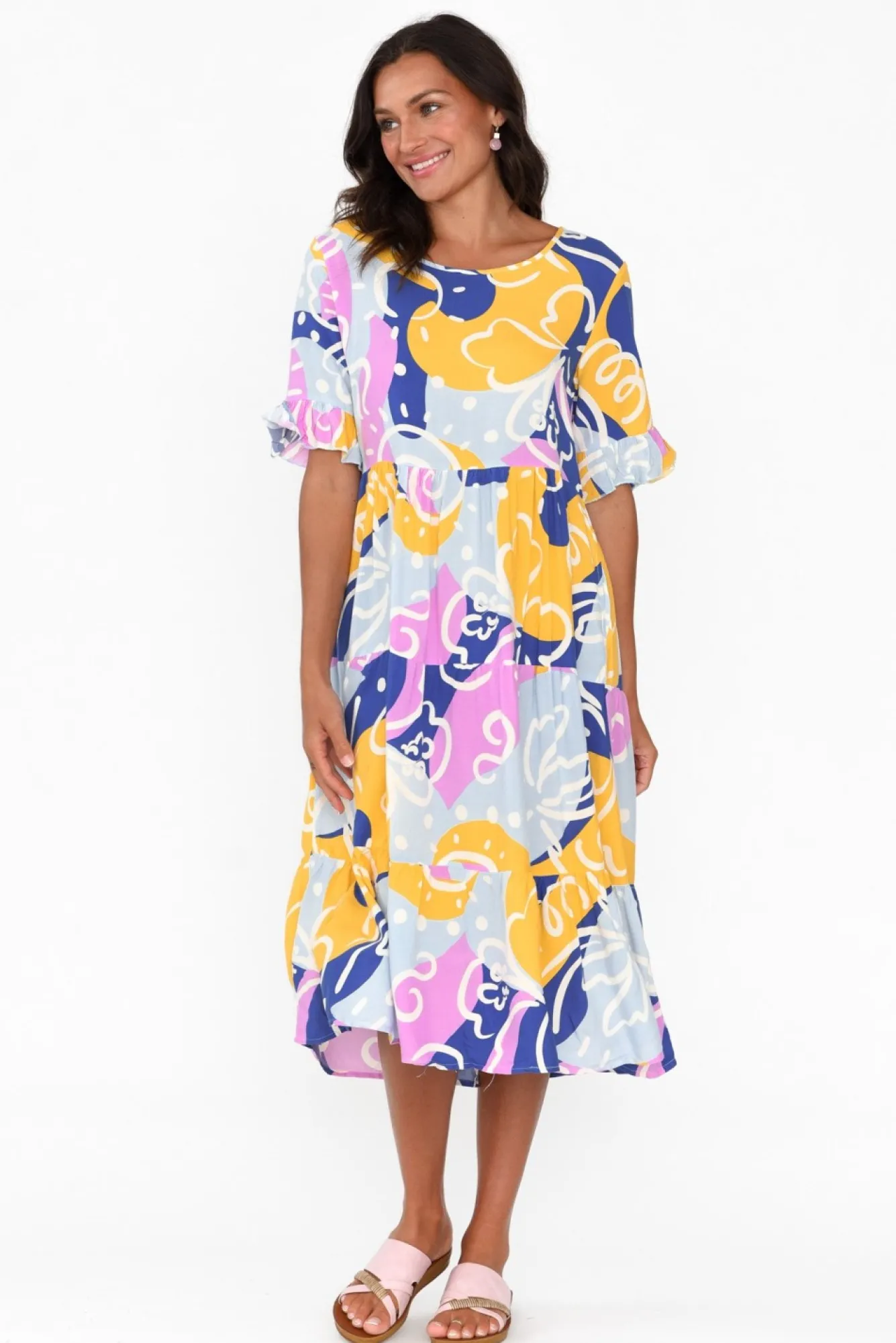 Fit: True To Size. Refer To Size & Fit Tab Below For Specific Size RecommendationNNfabric: 100% RayonNlightweight, Soft And Non-Stretch Rayon With A Lovely Billowy DrapeNNsimple Round NecklineNNhalf-Length Sleeves Elevated With Frill Sleeve NNflattering Tiered A-Line Silhouette Featuring Two Hip Pockets Nfalls To Easy-To-Wear Midi Length NNNcare: Cool Gentle Hand Wash RecommendedNNcolour: Abstract Print Featuring Shades Of Yellow, Blue And Purple NNNfit Tip: This Style Features A Non-Stretch Waist Seam That Must Fit Over Your Bust. If You Have A Larger Bust, We Suggest Sizing Up. Please Consult The Size & Fit Tab Below To Determine The Size Best For You.