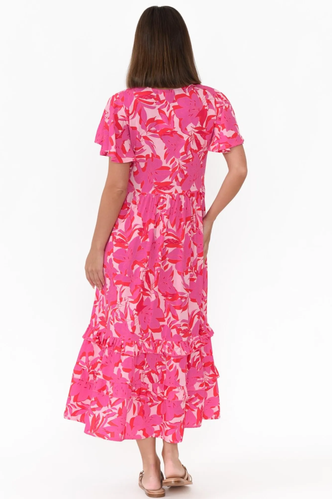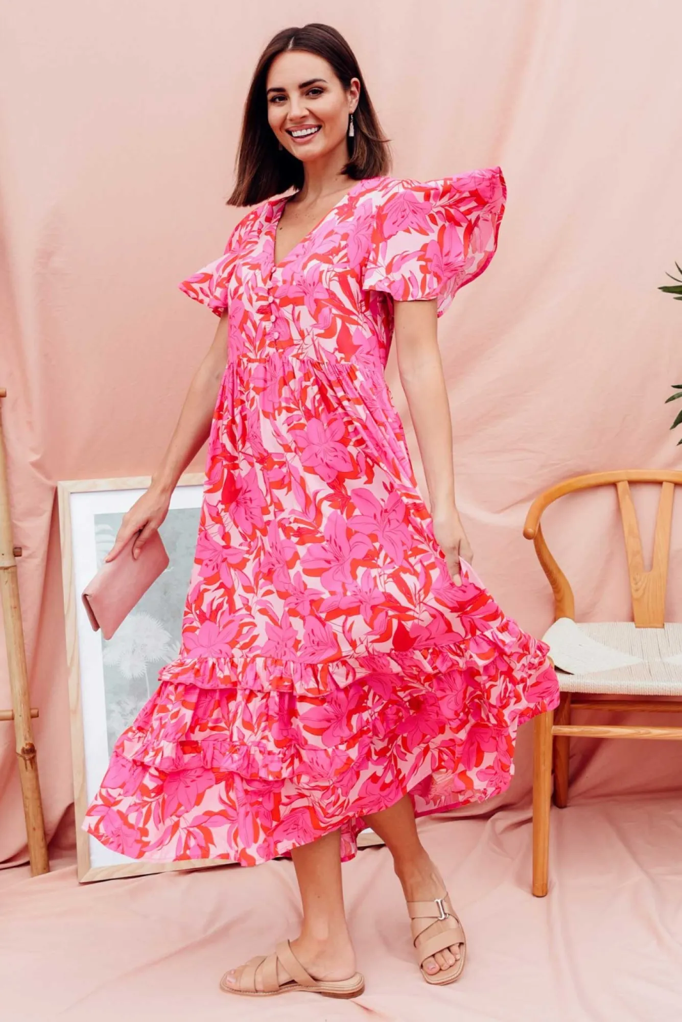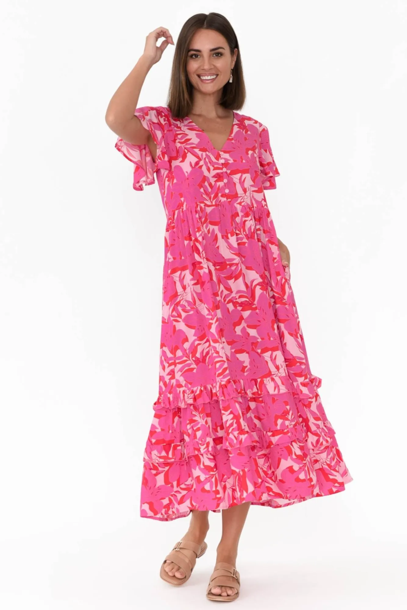 Midi Dresses<New U Collection Akira Pink Tropical Button Tier Dress