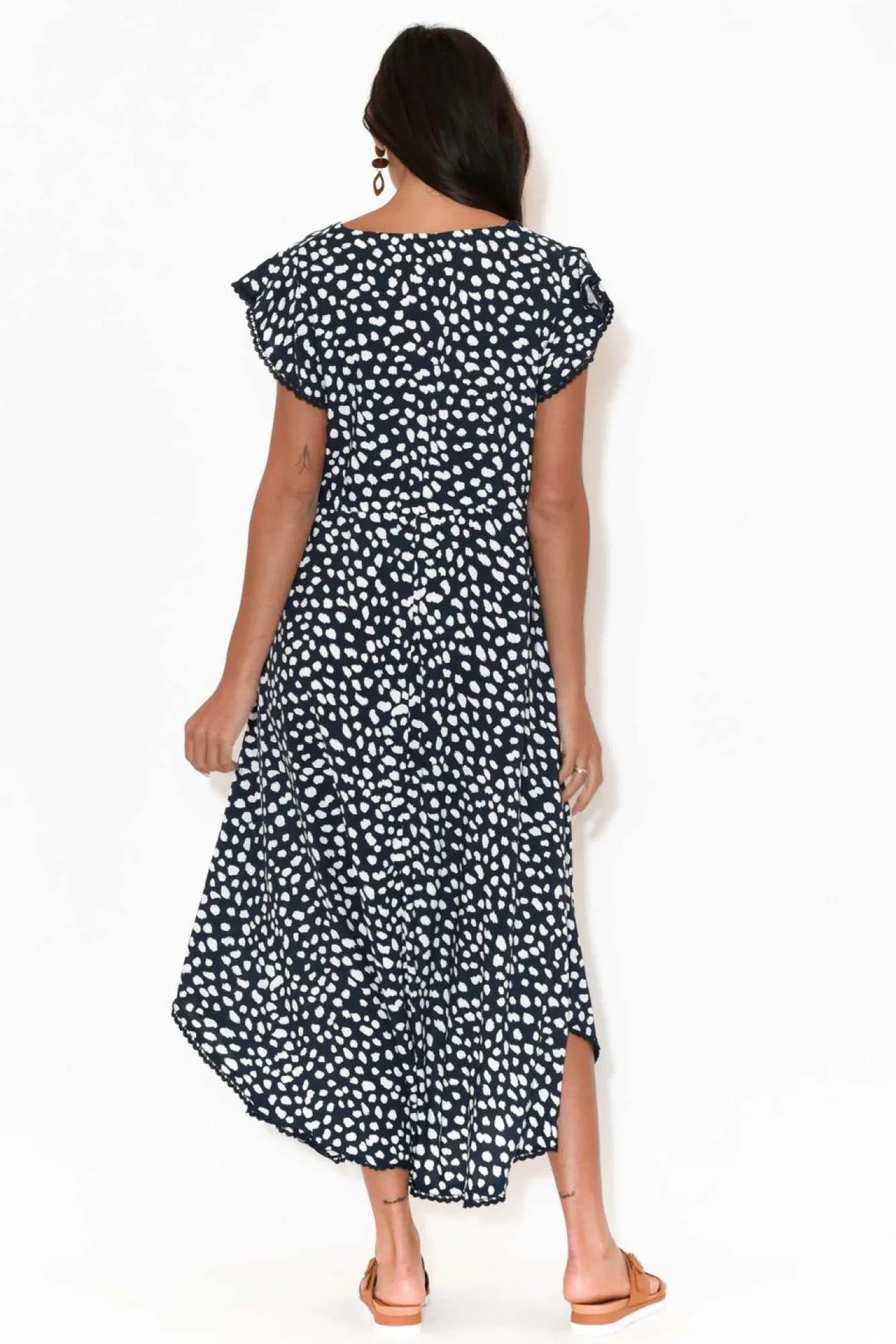 Fit: True. Refer To Size & Fit Tab Below For Specific Size RecommendationNNfabric: 100% RayonNlightweight And Soft Non-Stretch FabricNflattering V-NecklineNshort Flutter Sleeves With Broderie Anglaise TrimNNempire Waist With A Drawstring TieNNtwo Functional Side Hip PocketsNscalloped Hemline With Broderie Anglaise TrimNultra-Trendy Midi LengthNshop The Full Clothing Range From New U CollectionNNNcare: Cool Gentle Hand Wash RecommendedNNcolour: Navy Base With White Spots And Navy TrimNNnote: Please See Photos Rather Than Video For Most Accurate Colour.
