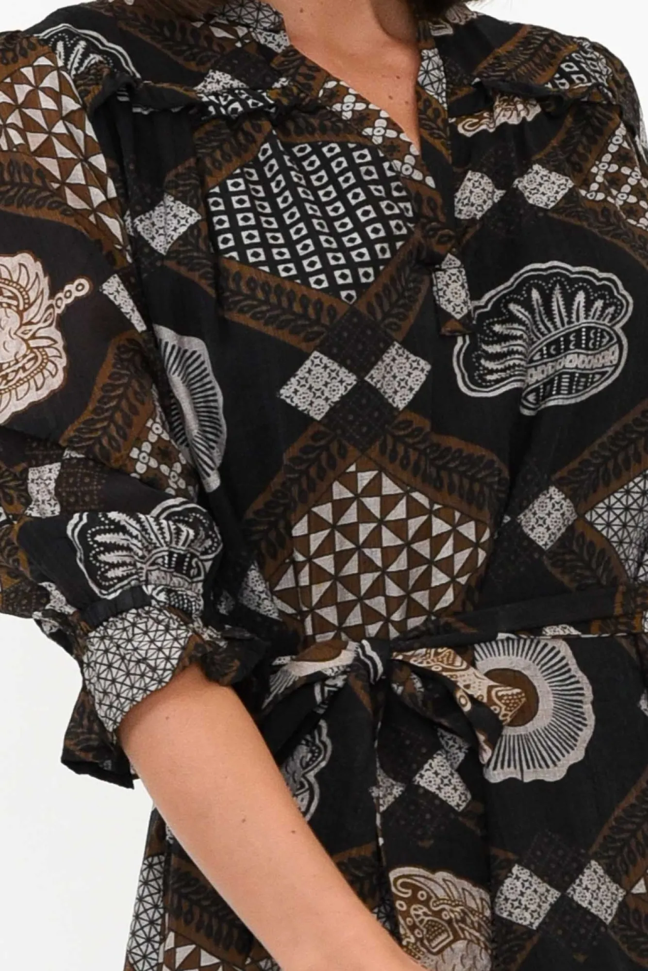 Fit: True To Size. Refer To Size & Fit Tab Below For Specific Size RecommendationNNfabric: Outer: 70% Viscose, 30% Spandex Lining: 100% CottonNlovely Lightweight And Slightly Sheer Outer With A Plain Lining To Provide Extra CoverageNbanded Collar With A V-Split NNhalf-Length Sleeves With An Elastic Cuff And Frilled HemNNdelicate Ruffles Sit Along The Collarbones And Skirt To Elevate This Style Nsimple And Flattering A-Line SilhouetteNdetachable Fabric Belt Can Be Used To Accentuate The Natural Waist NNelegant Midi Length StyleNNcare: Cool Gentle Hand Wash RecommendedNNcolour: Brown Base With An Intricate Geometric Overlay