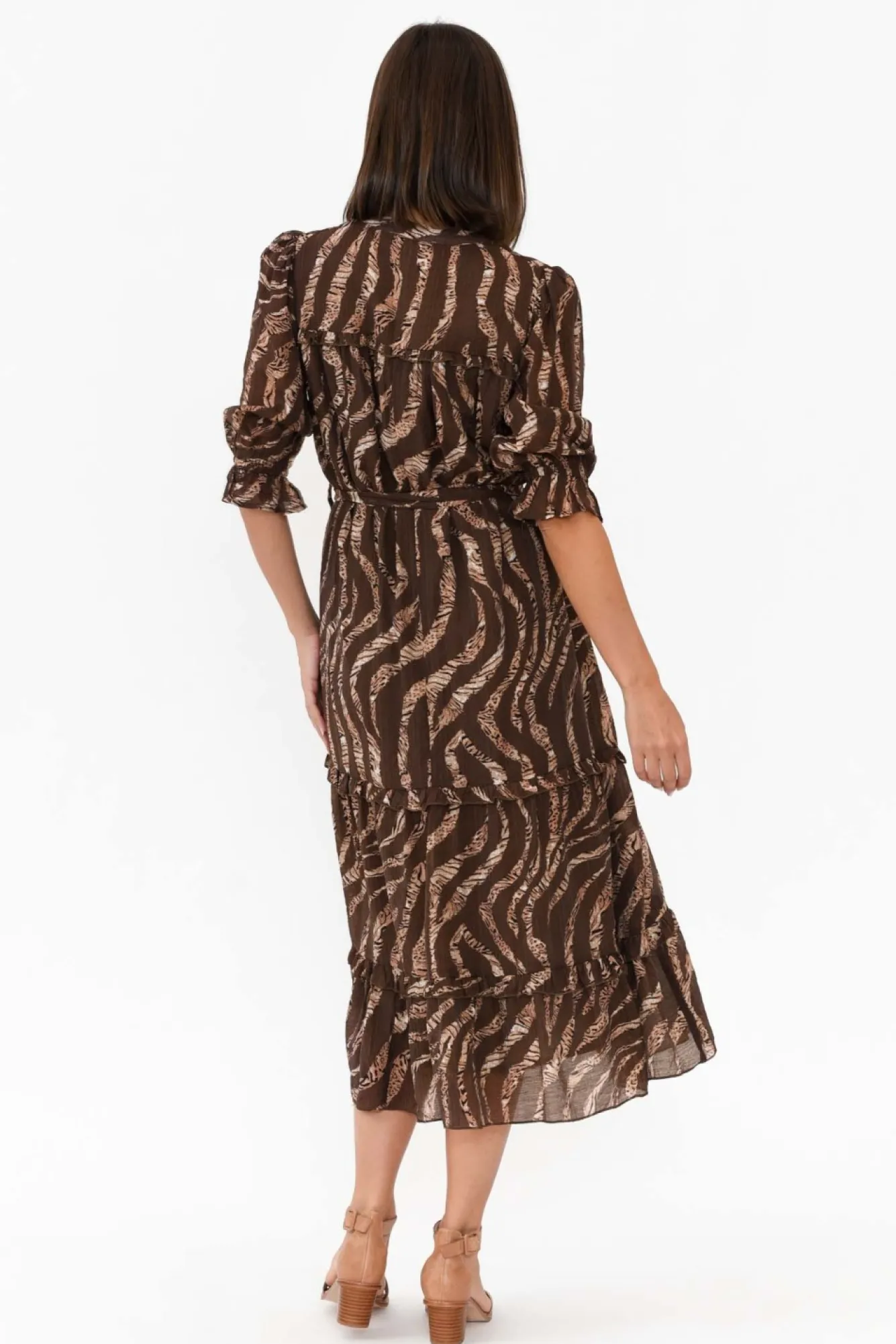 Fit: True To Size. Refer To Size & Fit Tab Below For Specific Size RecommendationNNfabric: Outer: 70% Viscose, 30% Spandex Lining: 100% CottonNlovely Lightweight And Slightly Sheer Outer With A Plain Lining To Provide Extra CoverageNbanded Collar With A V-Split NNhalf-Length Sleeves With An Elastic Cuff And Frilled HemNNdelicate Ruffles Sit Along The Collarbones And SkirtNsimple And Flattering A-Line SilhouetteNdetachable Fabric Belt Can Be Used To Accentuate The Natural Waist NNelegant Midi Length StyleNNcare: Cool Gentle Hand Wash RecommendedNNcolour: Brown Base With A Unique Leopard Overlay