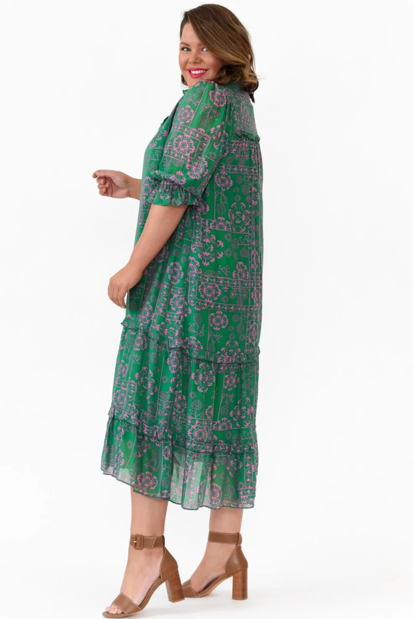 Fit: True To Size. Refer To Size & Fit Tab Below For Specific Size RecommendationNNfabric: Outer: 70% Viscose, 30% Spandex Lining: 100% CottonNlovely Lightweight Outer With A Slight Sheer Sheen, Plain Cotton Lining Provides Extra Coverage Nbanded Collar With A V-Split NNhalf-Length Sleeves With An Elastic Cuff And Frilled HemNNdelicate Ruffles Sit Along The Collarbones And SkirtNclassic And Flattering A-Line SilhouetteNdetachable Fabric Belt Can Be Used To Accentuate The Natural Waist NNelegant Midi Length StyleNNcare: Cool Gentle Hand Wash RecommendedNNcolour: Lush Green Base With A Pink Paisley Print