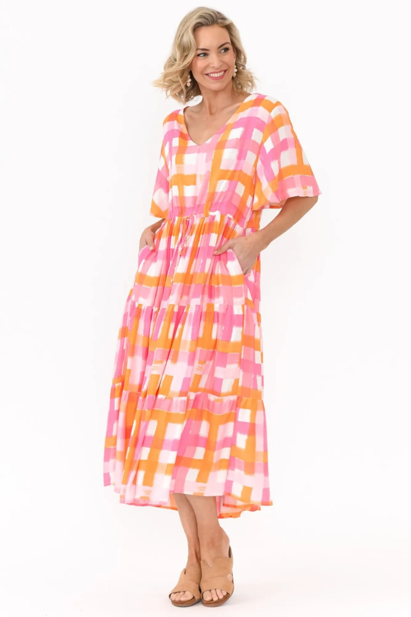 Fit: True To Size. Refer To Size & Fit Tab Below For Specific Size RecommendationNNfabric: 100% RayonNlightweight, Non-Stretch Rayon With A Soft And Smooth Hand Feel NNsharp V-Neckline Highlights The Collarbones NNwide Half-Length Sleeves Drape Beautifully On The ArmNNtiered A-Line Silhouette With An Adjustable Drawstring WaistNNtwo Discreet Side Seam Pockets NNstraight Hemline Falls Below Knee Length NNNcare: Cool Gentle Machine Wash RecommendedNNcolour: Vibrant Orange And Pink Watercolour-Style Check Print