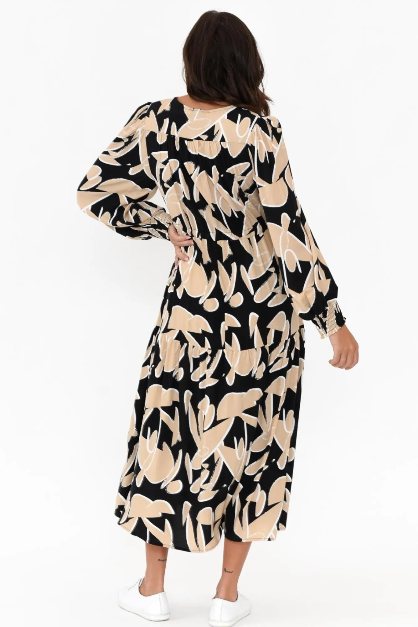 Fit: True To Size. Refer To Size & Fit Tab Below For Specific Size RecommendationNNfabric: 100% Viscose Nultra-Breezy, Lightweight Fabric Designed With A Comfortable Smooth Hand FeelNNstriking V-Neckline Enhanced By Functional Buttons Featured Down The Bust NNfull-Length Billowy Sleeves Featuring Soft Pleating And Elasticated Cuffs NNversatile Tiered A-Line Silhouette With An Adjustable Drawstring Waist For Optional Figure Definition NNtwo Discreet Hip Pockets NNfalls To Stylish Midi Length NNNcare: Cool Gentle Hand Wash RecommendedNNcolour: Oversized Latte Abstract Print With A Classic Black Base