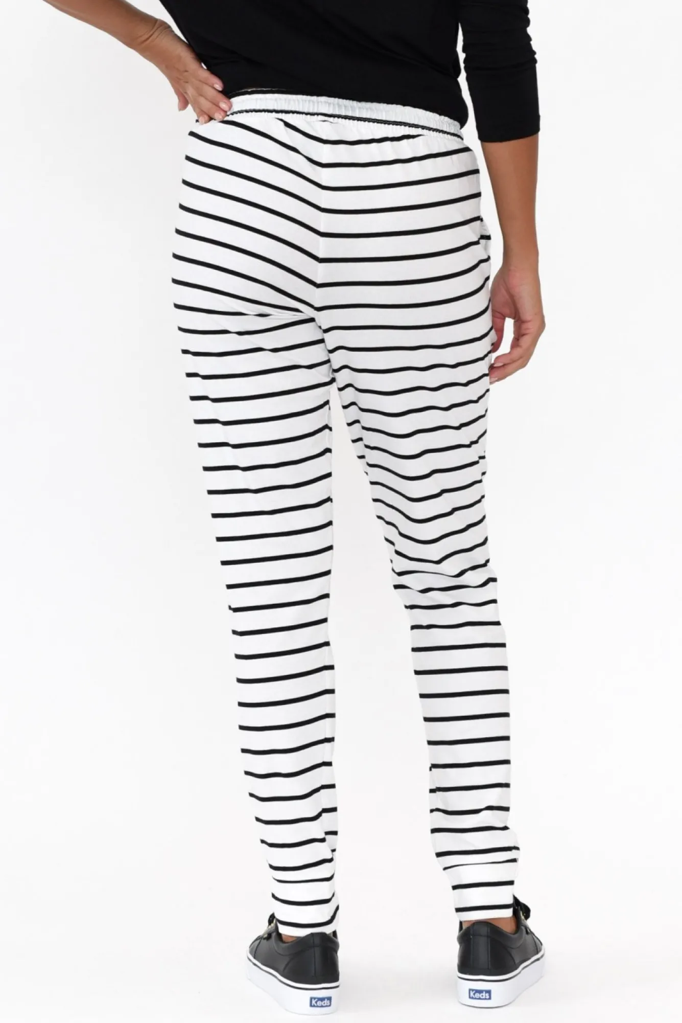 Fit: True To Size. Refer To Size & Fit Tab Below For Specific Size RecommendationNNfabric: Cotton/ElastaneNa Comfortable, Lightweight Pant With Soft, Stretch Cotton FabricNclassic Jogger Pant With Elasticised Waistband And Black Drawstring Tie For AdjustabilityNwear Mid-Rise For An Ultra-Flattering SilhouetteNNtwo Generous Pockets At The HipNfull Length DesignNNstretchy Tapered CuffsNNcare: Cool Gentle Machine Wash RecommendedNNcolour: White With Thin Black StripeNNnote: Measurements Vary Between Colours. Please Refer To Individual Product Measurements To Find Your Perfect Fit.