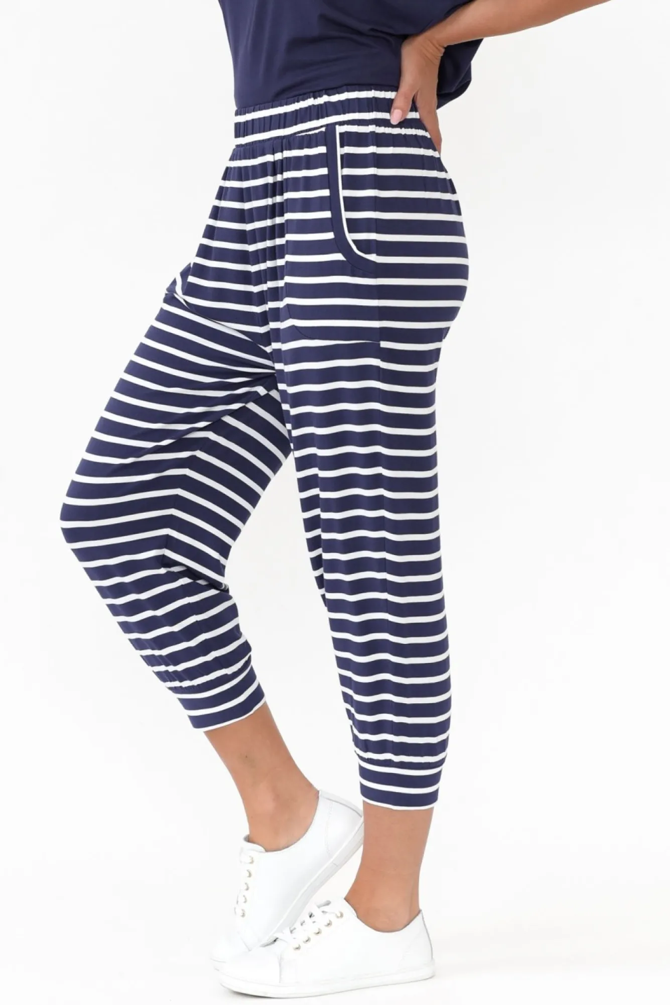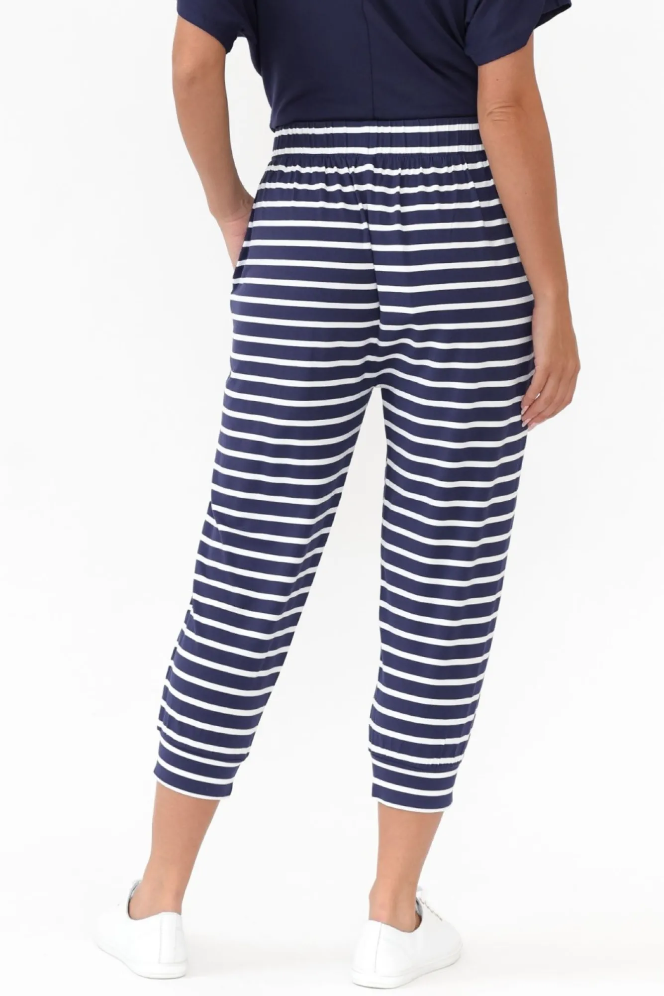Fit: True To Size. Refer To Size & Fit Tab Below For Specific Size RecommendationNNfabric: Viscose/ElastaneNmade From Lightweight, Ultra-Soft And Stretchy Fabric NNgathered Elasticated Waistband Provides Comfortable Stretch Nslouchy-Style Fit Enhances The Relaxed Silhouette Ntwo Handy Hip Pockets With Subtle Stitching DetailNtapered Cuffs Reach A Versatile Cropped Length NNNcare: Cool Gentle Hand Wash RecommendedNNcolour: Washed French Navy With Classic White Stripes