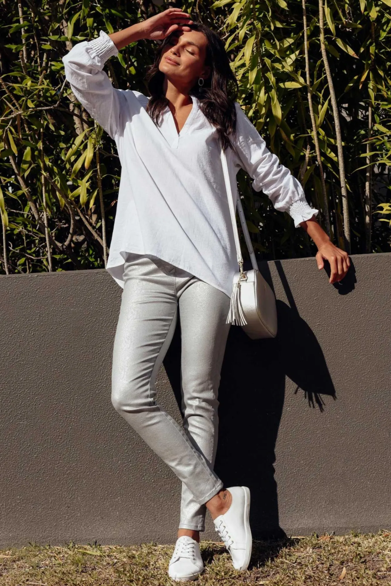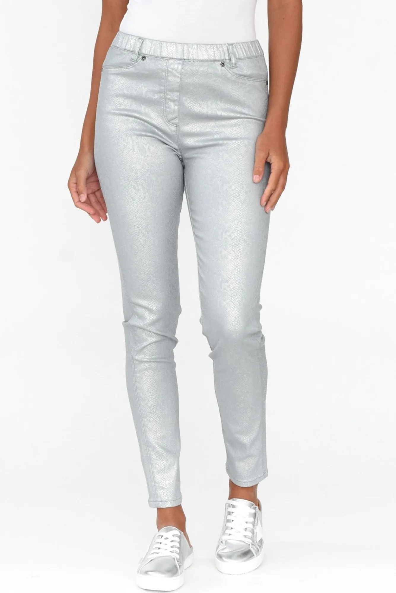Fit: True To Size. Refer To Size & Fit Tab Below For Specific Size RecommendationNNfabric: 86.6% Cotton, 10.6% Polyester, 2.8% Spandex Nstunning Silver Statement Pants Crafted From Soft And Stretchy Cotton Blend Fabric NNmid-Rise Design With An Elasticated Waistband NNtimeless Straight Silhouette Tapers At The HemNNtwo Faux Pockets At The Front And Two Functional Pockets The Back NNfull-Length Style Reaches The Ankle NNNcare: Cool Gentle Hand Wash RecommendedNNcolour: Silver Metallic Animal Print Over A Washed Grey-Blue Base