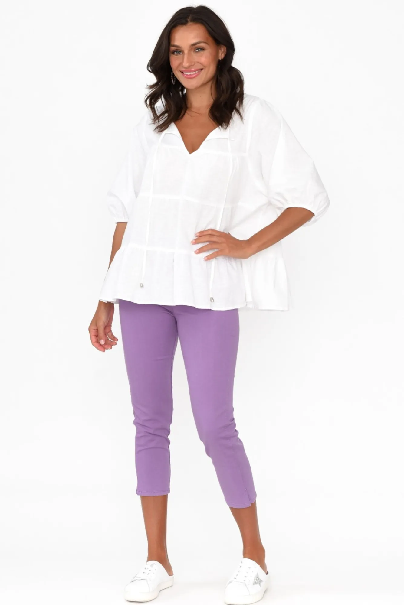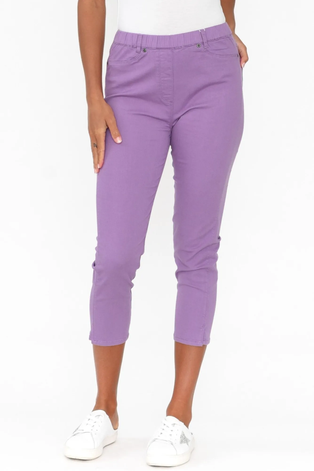 Fit: Oversized. Refer To Size & Fit Tab Below For Specific Size RecommendationNNfabric: 97% Cotton, 3% SpandexNmidweight Stretch Cotton Pant With A Denim-Like TextureNcomfortable High-Rise Design With Firm-Stretch Elasticised WaistbandNbelt Loops And Faux-Fly DetailingNtwo Faux Front Pockets With Two Functional Back PocketsNtrendy Cropped Capri Length With A Slim LegN4Cm Side Hem Splits NNcare: Cool Gentle Hand Wash RecommendedNNcolour: Gorgeous Lilac ShadeNNfit Tip: This Style Is Slightly Oversized, We Recommend Sizing Down. Please Refer To The Size And Fit Guide To Find The Size Which Best Fits You.