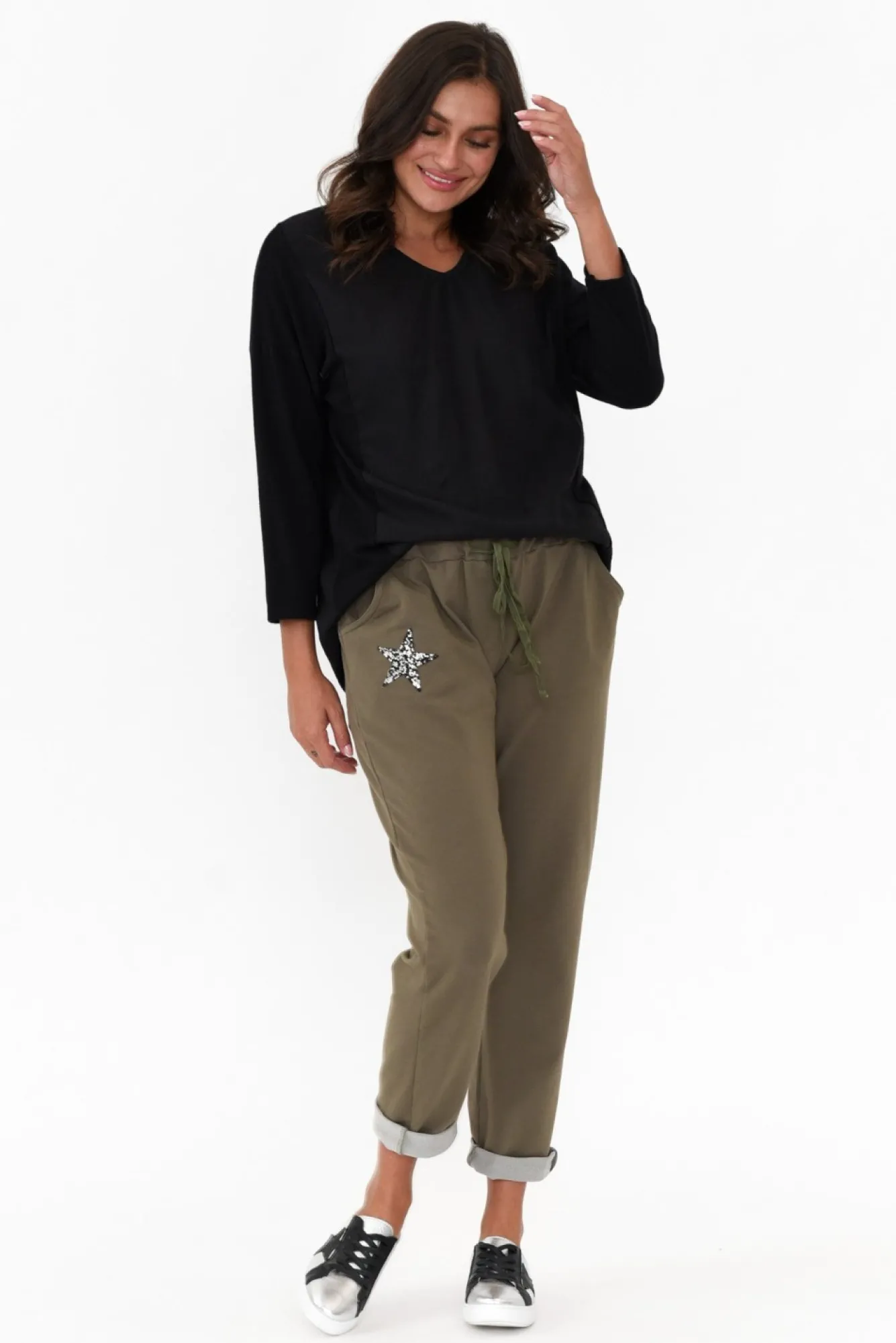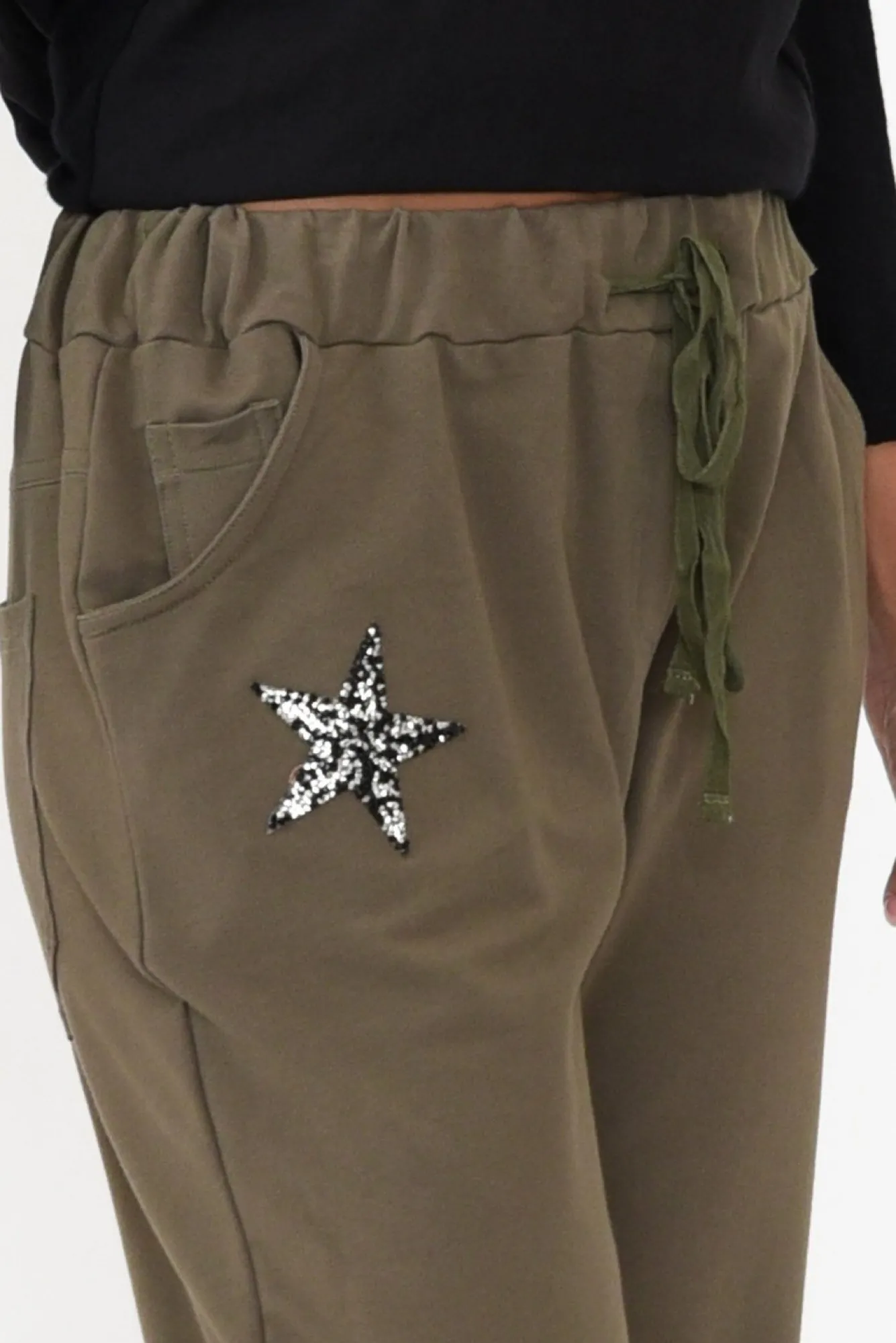 Fit: True To Size. Refer To Size & Fit Tab Below For Specific Size RecommendationNNfabric: 90% Cotton, 10% Spandex Noh-So-Soft And Stretchy Cotton Lounge Pants With A Lovely Midweight And Breathable Feel NNstretch Elastic Waistband With A Matching Khaki DrawstringNfeaturing Star Embellishment With Black And Silver Diamantes Nhandy 5-Pocket Design – Two Hip Pockets, One Coin Pocket And Two Back PocketsNcomfy Jogger Silhouette Perfect For Lounging And Staying Active! NNfull Length Style Grazes The Ankle NNNcare: Cool Gentle Hand Wash RecommendedNNcolour: Lovely Khaki Shade