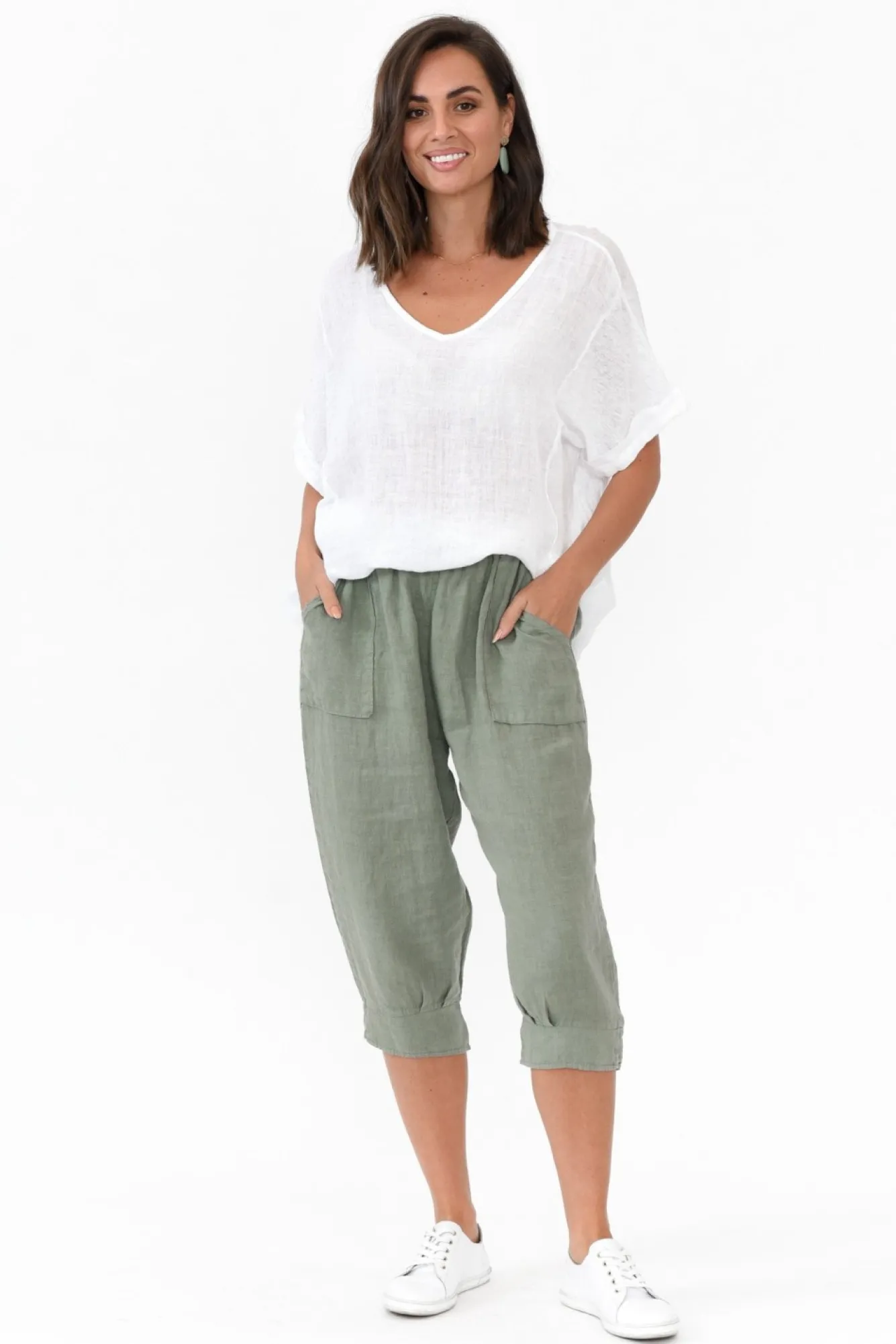 Fit: True To Size. Refer To Size & Fit Tab Below For Specific Size Recommendation NNfabric: 100% LinenNthe Perfect Summer Pant Crafted In Italy From Lightweight, Breathable And Non-Stretch Linen With A Soft Woven FeelNNruched Elastic Waist For Comfort Nstraight-Leg Style With Subtle Tapering Near The Hem NNtwo Large Front Pockets NNcapri Length Perfect For Shorter LegsNNcare: Cool Gentle Hand Wash RecommendedNNNcolour: Light Khaki Green