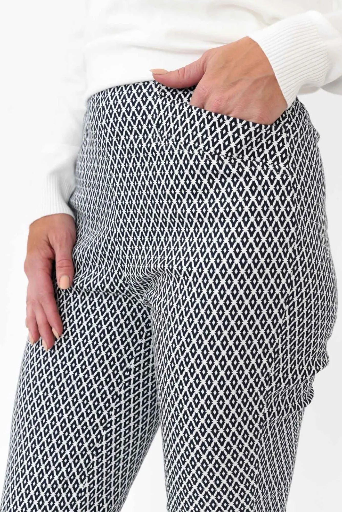 Fit: True To Size. Refer To Size & Fit Tab Below For Specific Size RecommendationNNfabric: 98% Cotton, 2% Elastane Nlightweight And Breathable Cotton Blend Fabric With An Ultra-Comfortable Stretch And A Soft, Smooth Hand FeelNNnon-Stretch Front Waistband With Ruched Elastic At The Back, Creating The Perfect FitNNfitted Straight Silhouette NNtwo Functional Front Pockets Nstraight Hem Reaches A Cropped Length NNcare: Cool Gentle Hand Wash RecommendedNNcolour: Navy Diamond Print Over A White Base