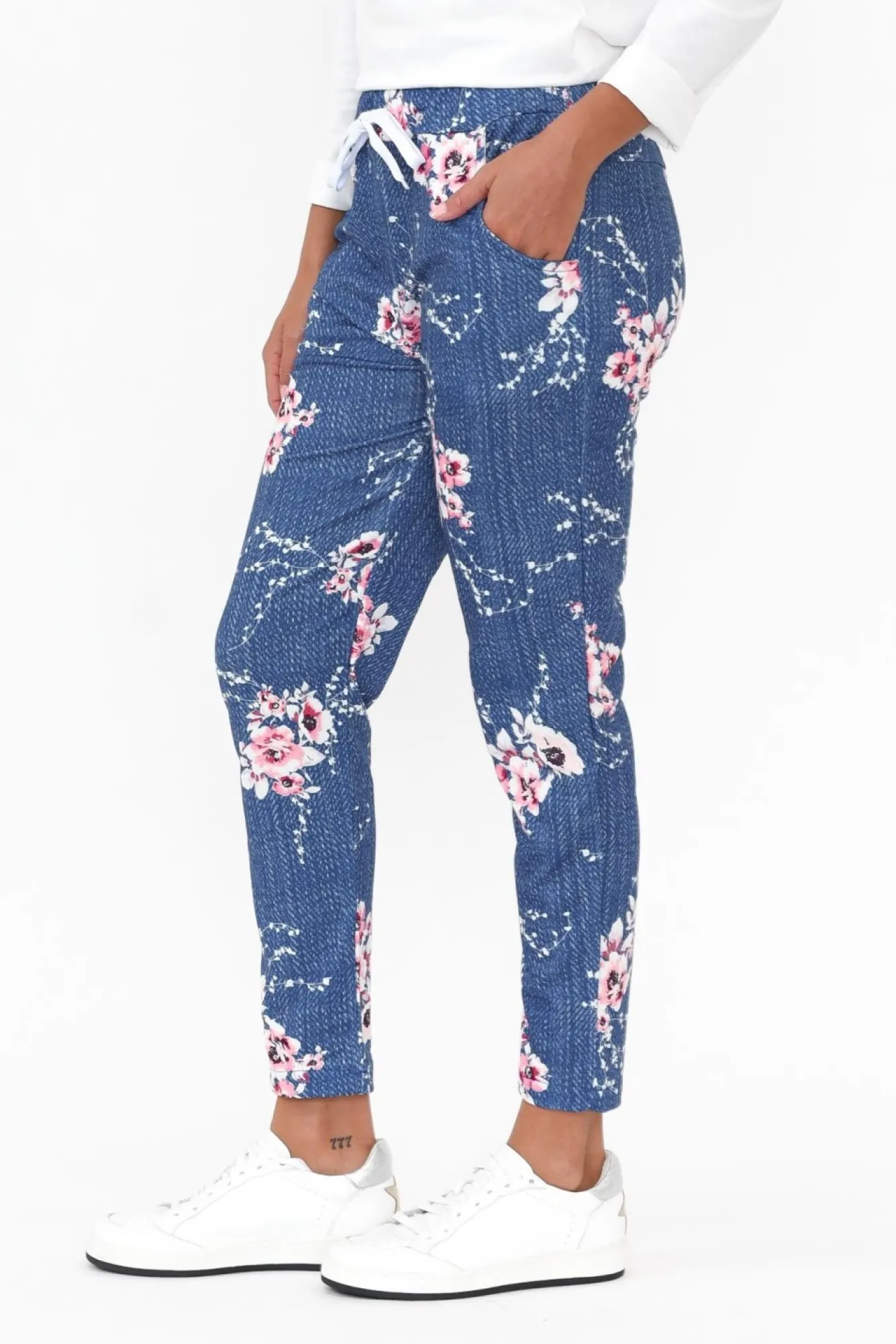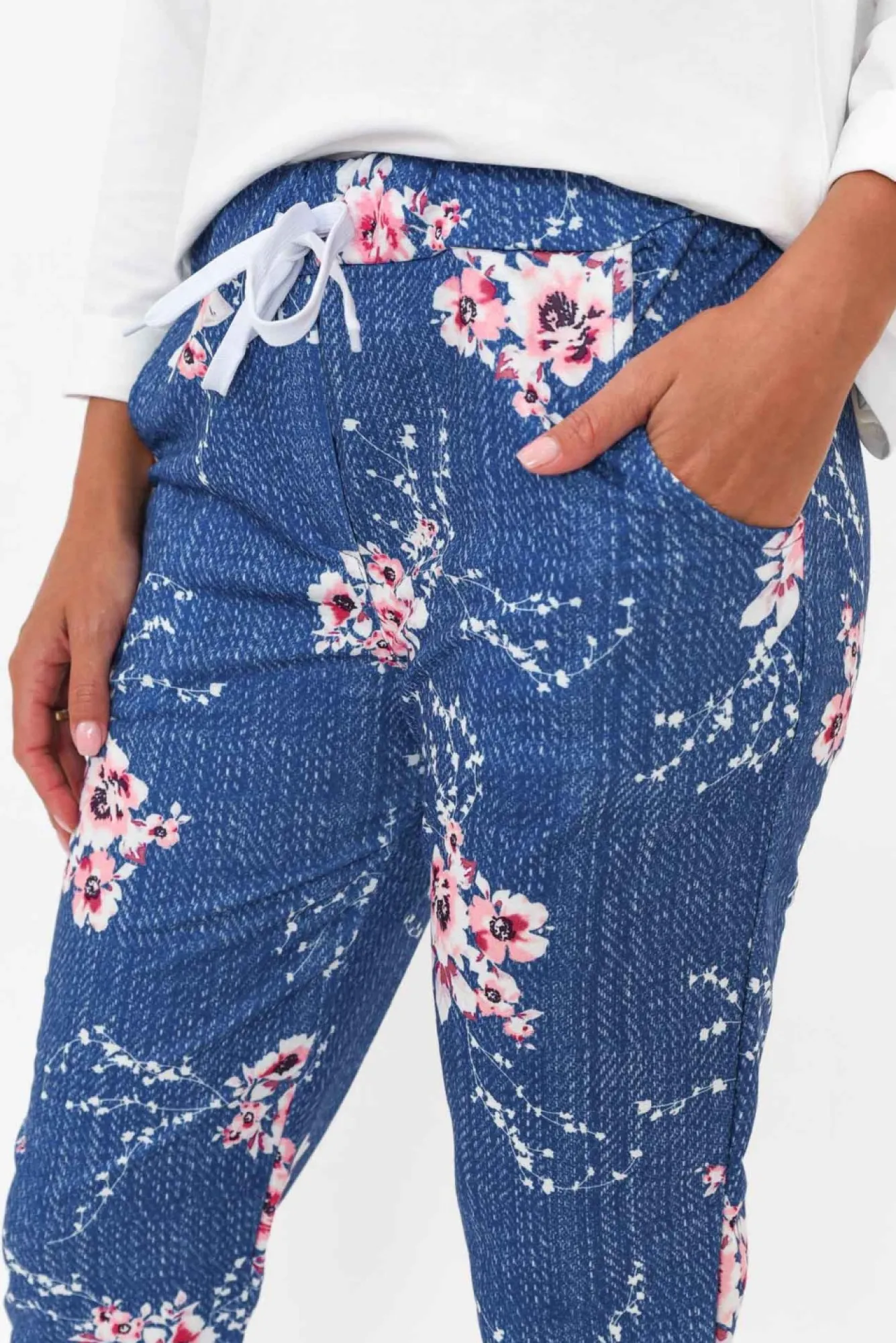 Fit: True To Size. Refer To Size & Fit Tab Below For Specific Size RecommendationNNfabric: 65% Polyester, 35% Cotton Ncomfortable Lightweight Fabric With An External Soft Hand Feel And Lined With A Loopback Finish Creating A Subtle Stretch Nelasticated Waistband With Adjustable Drawstring NNstraight Jogger-Style Silhouette NNtwo Handy Hip Pockets NNfalls Just Above The Ankle Length NNcare: Cool Gentle Hand Wash RecommendedNNcolour: Deep Blue And White Fleck Base With A Delicate Pink Floral Print