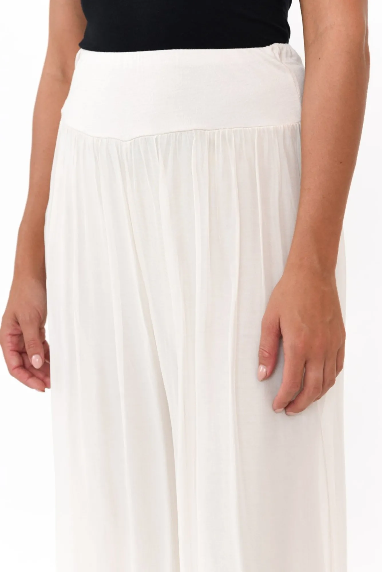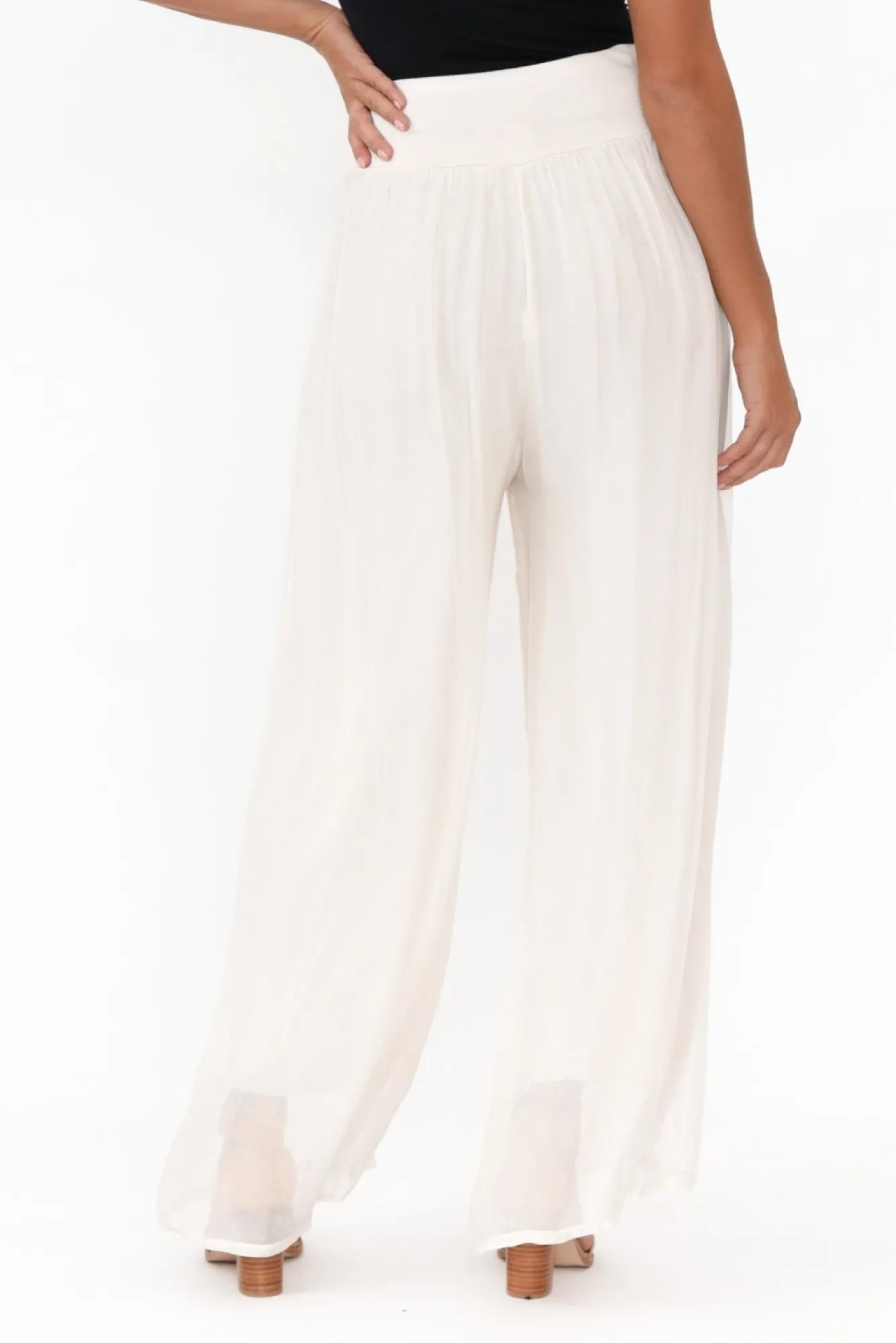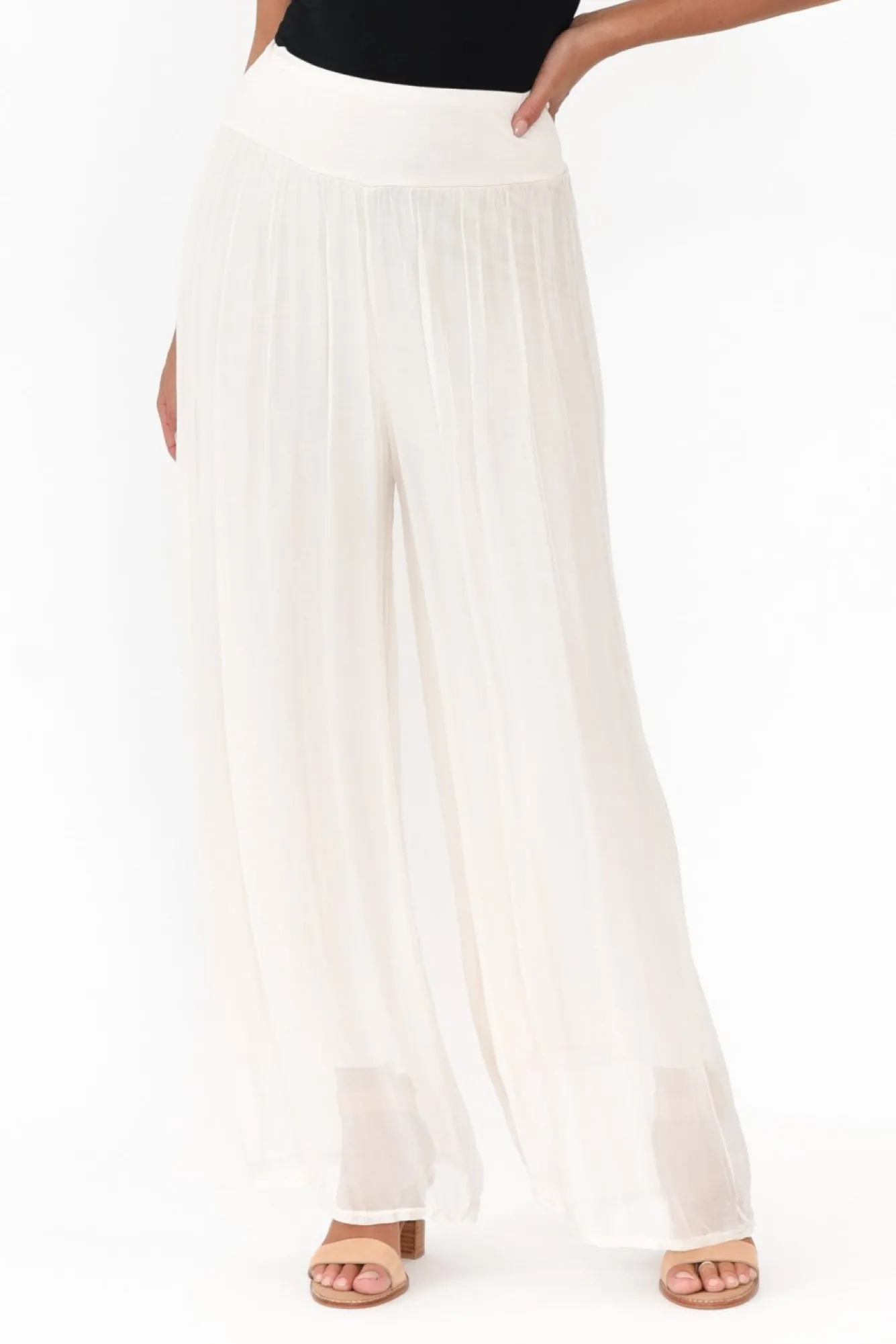 Fit: Runs Large. Refer To Size & Fit Tab Below For Specific Size RecommendationNNfabric: Outer: 70% Viscose, 30% Silk Lining: 95% Viscose, 5% ElastaneNluxurious Lightweight Silky Fabric With A Lovely Soft And Stretchy Lining Nmade In Italy Nsoft And Stretchy, Wide Waistband For Comfort And SupportNNflowy Sheer Silk Overlay With A Complementary Stretchy Lining Ndramatic Wide Leg Silhouette NNfalls To Ankle Length NNNcare: Cool Gentle Hand Wash RecommendedNNcolour: Elegant Ivory Shade