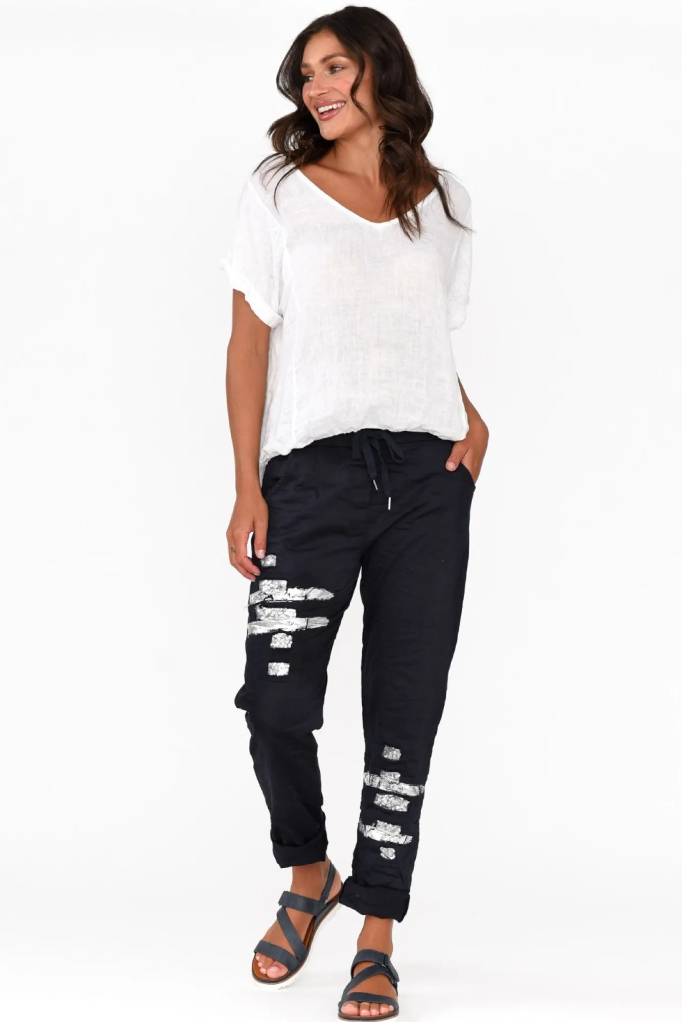 Fit: True To Size. Refer To Size & Fit Tab Below For Specific Size RecommendationNNfabric: 66% Viscose, 30% Cotton, 4% ElastaneNcrafted In Italy From Comfortable Lightweight And Stretchy Fabric Designed With No-Fuss Crushed Finish NNelasticated Waist With Adjustable Drawstring For The Perfect Fit NNversatile Straight Silhouette Tapers Towards The HemNNfaded Detailing Near The Seams Creates A Casual Look Nfour-Pocket Design – Two At The Front And Two At The Back NNreaches An Ankle Length – Can Be Cuffed For A Cropped Look NNNcare: Cool Gentle Hand Wash RecommendedNNcolour: Navy With Silver Foil And Sequin Embellishments