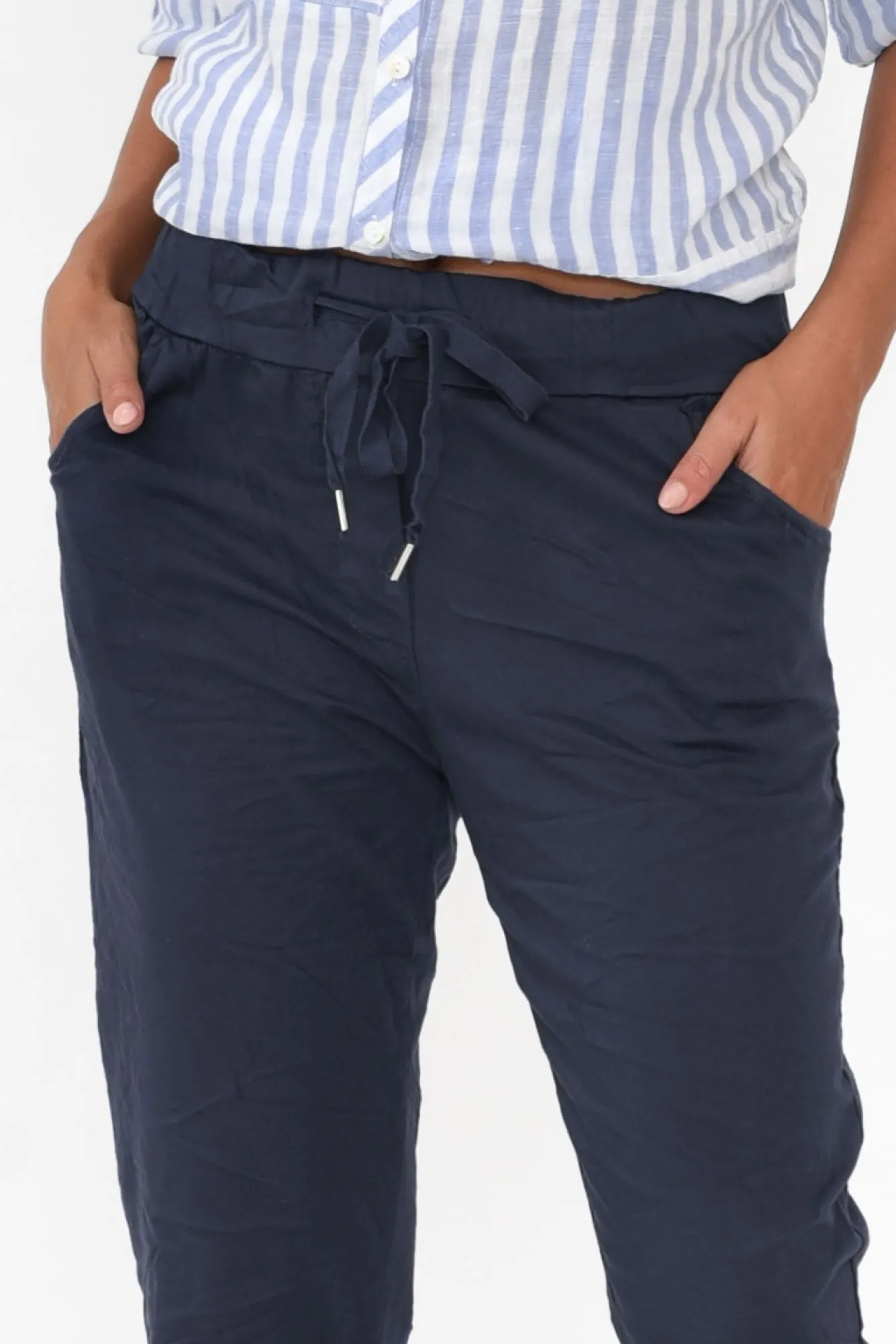 Fit: True To Size. Refer To Size & Fit Tab Below For Specific Size RecommendationNNfabric: 66% Viscose, 30% Cotton, 4% ElastaneNcomfortable Lightweight Cotton Blend With A Subtle Stretch And Crinkle TextureNNfeaturing An Elasticated Waist With An Adjustable Drawstring Nstraight Silhouette With A Slightly Tapered Hem – Wear Cuffed For A Casual Look!Nfaux Fly DetailNfunctional Five-Pocket Design – Two Front Pockets, One Coin Pocket, Two Back PocketsNreaches Modern Cropped LengthNNNcare: Cool Gentle Machine Wash RecommendedNNcolour: True Navy Shade
