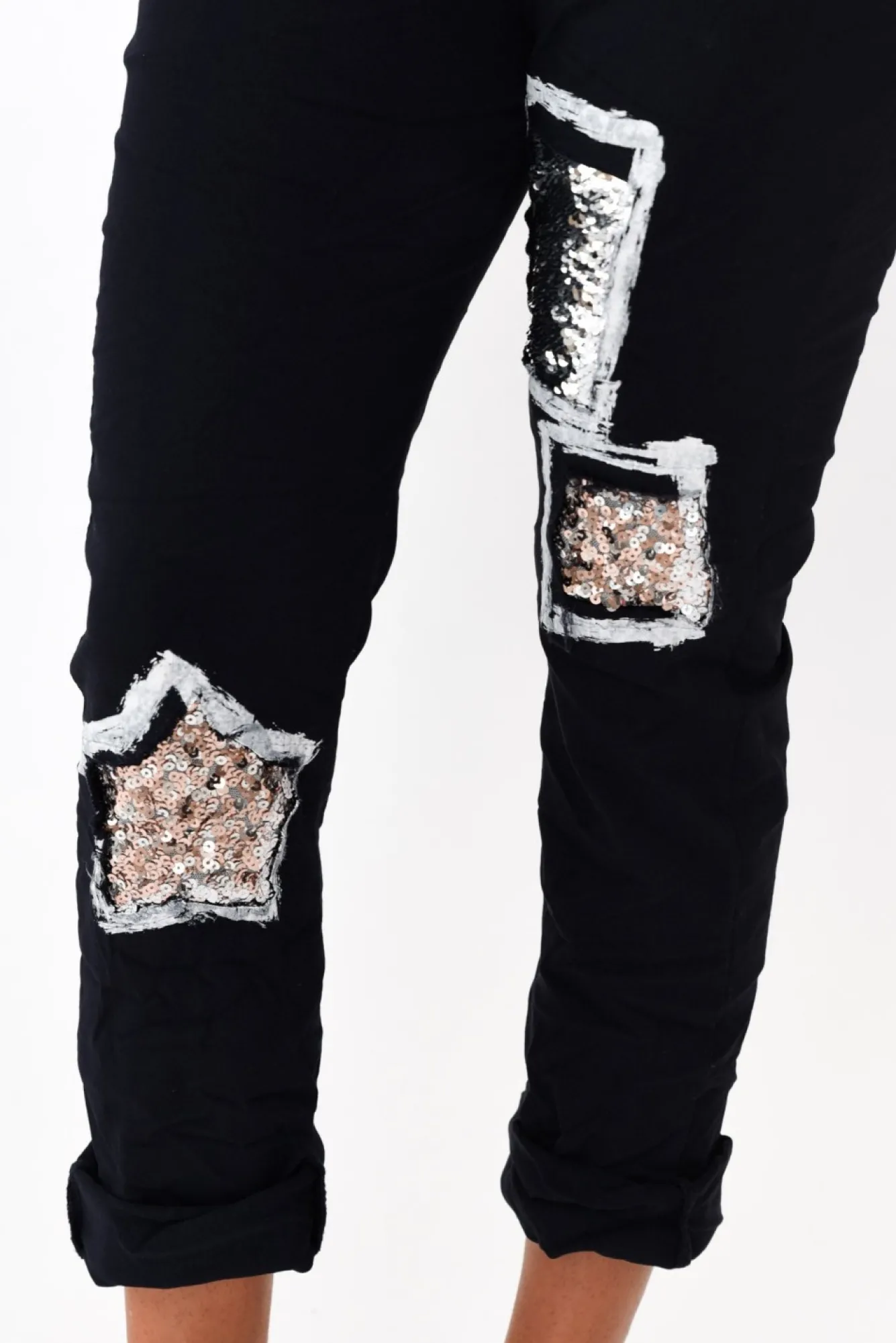 Fit: True To Size. Refer To Size & Fit Tab Below For Specific Size RecommendationNNfabric: 65% Viscose 30% Nylon 5% Elastane Ncomfortable Lightweight And Stretchy Fabric With A Smooth Hand Feel NNmade In ItalyNelasticated Waist With Adjustable DrawstringNstraight Silhouette Tapers At The Hem – Can Be Cuffed For A Cropped Casual Look!NNjogger Design Enhanced By Faux Fly DetailNtwo Handy Hip Pockets NNstraight Hem Reaches Ankle Length NNNcare: Cool Gentle Machine Wash RecommendedNNcolour: Deep Navy With Silver And Gold Sequin Patches Outlined By Paint Detail