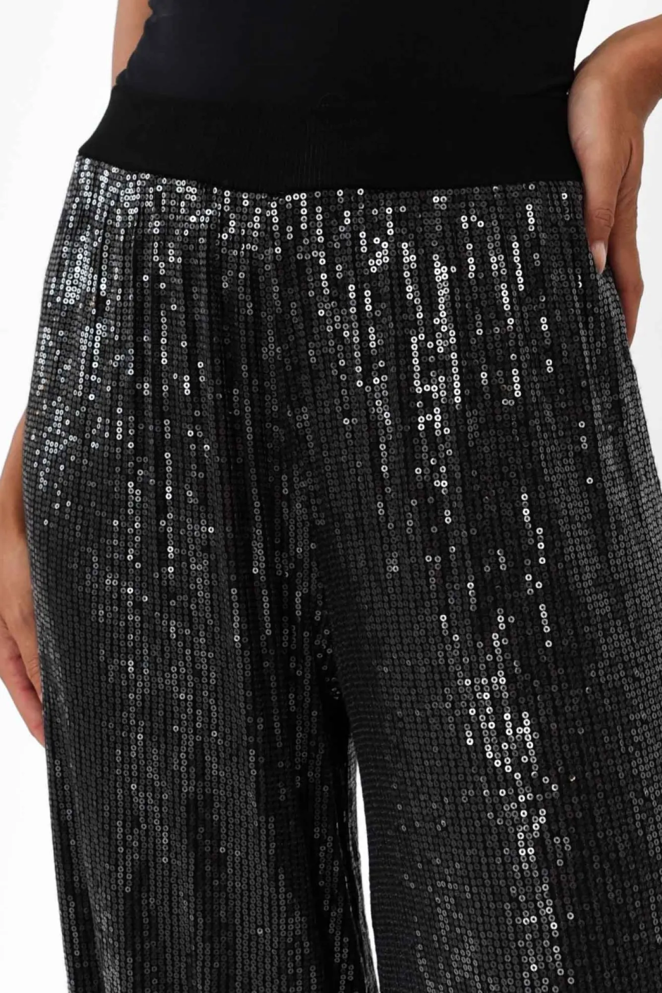 Fit: True To Size. Refer To Size & Fit Tab Below For Specific Size RecommendationNNfabric: 80% Viscose, 20% Polyester Na Fun Sequin Pant, Made In Italy From Lightweight And Stretchy Fabric NNribbed Elasticated Waist For Comfort And Support NNfabulous Wide-Leg SilhouetteNNunlined Design Nfalls To Ankle Length NNcare: Cool Gentle Hand Wash RecommendedNNcolour: Midnight Black With Matching Sparkling Sequins