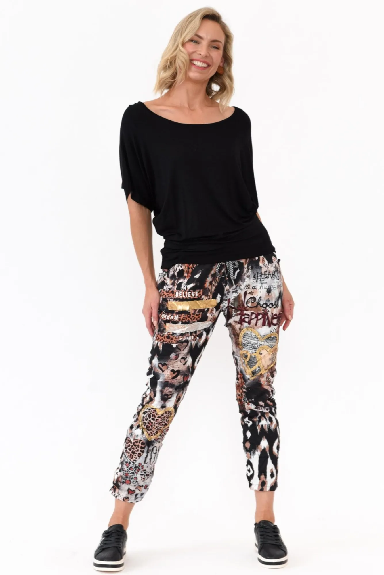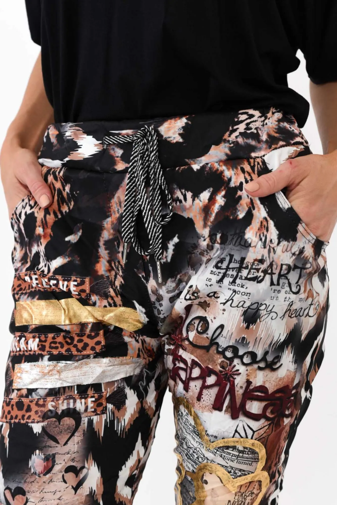 Fit: True To Size. Refer To Size & Fit Tab Below For Specific Size RecommendationNNfabric: 60% Viscose, 40% PolyesterNcrafted In Italy From Fuss-Free Crinkle Fabric With A Comfortable StretchNstretch Waist With DrawstringNelasticated Waistband Featuring Striped Metallic Drawstring TieNNeasy-To-Wear Straight Silhouette Tapers At The Hem – Wear Cuffed For A Casual Look!Nfaux Fly Detail Complemented By Two Functional Front Pockets Nreaches Above Ankle Length NNcare: Cool Gentle Hand Wash RecommendedNNcolour: Animal Print Overlayed With Stunning Graphics And Metallic Detailing