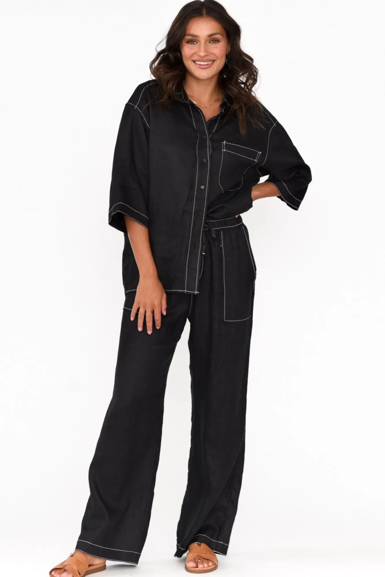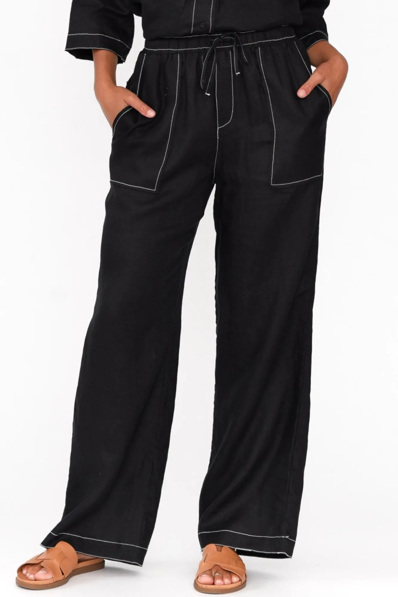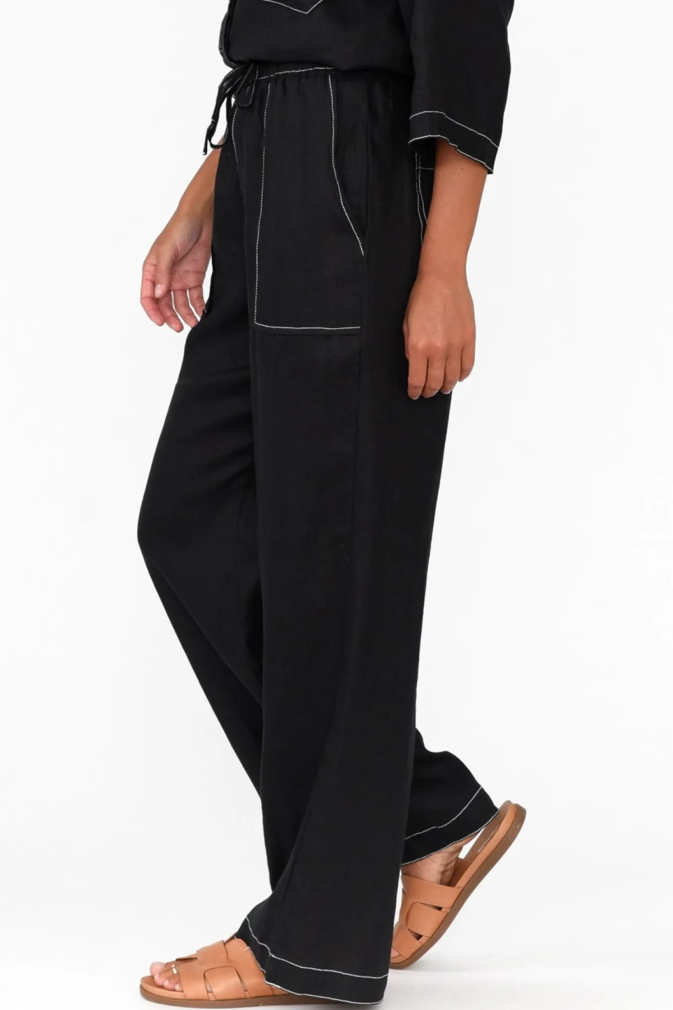 Fit: True To Size. Refer To Size & Fit Tab Below For Specific Size RecommendationNNfabric: 100% LinenNlovely Lightweight And Naturally Breathable Linen With A Structured, Woven Hand FeelNwide, Stretch Waistline With A Drawstring Detail For A Comfortable FitNNcontrast Stitching Throughout The Garment Gives This Style A Unique EdgeNwide Leg SilhouetteNNfaux Fly Detail Nfour Pockets – Two At The Front, Two At The BackNfull-Length Falls Past The Ankles NNcare: Cool Gentle Hand Wash RecommendedNNcolour: Black With White Contrast Stitching