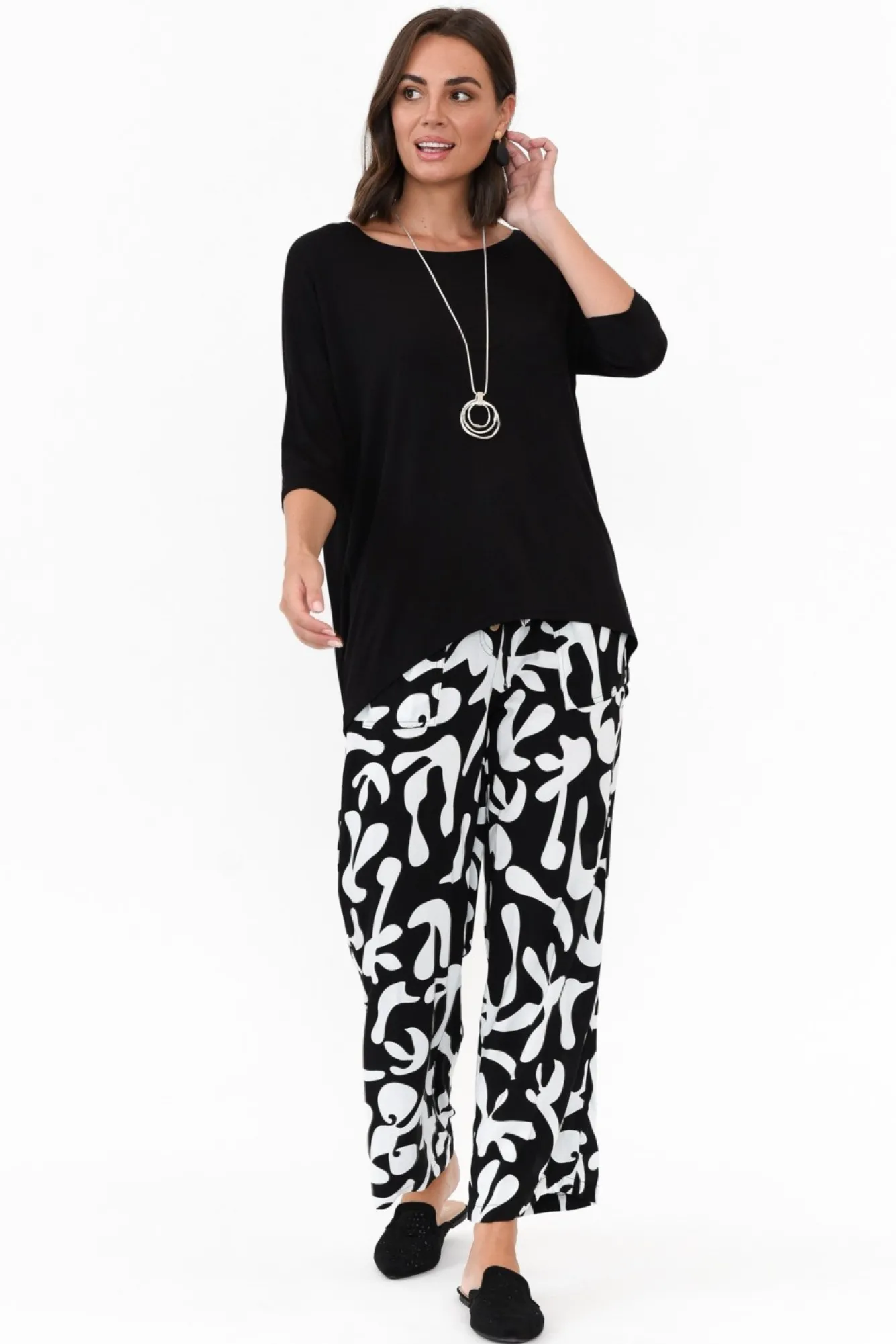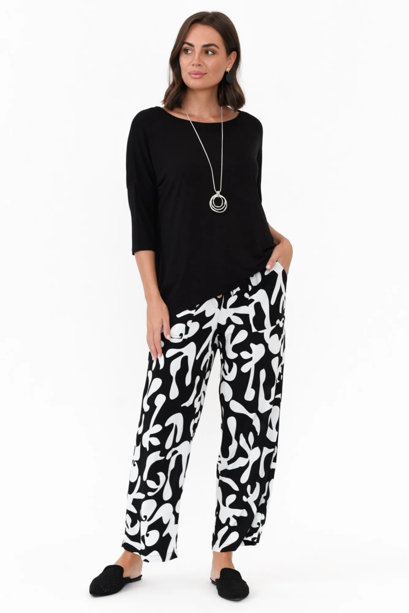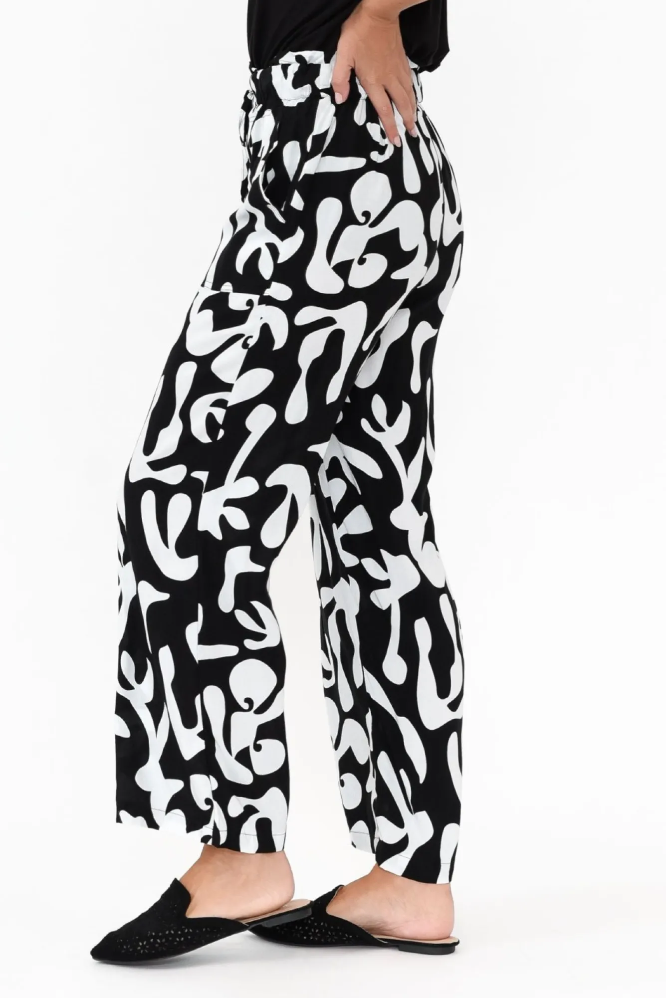Fit: True To Size. Refer To Size & Fit Tab Below For Specific Size RecommendationNNfabric: 100% RayonNsoft And Smooth, Lightweight, Non-Stretch Rayon FabricNNelasticated Paper Bag-Style Waistband With An Adjustable Drawstring Ncasual Design Elevated By Faux Button Fly DetailingNrelaxed Straight-Leg Silhouette Ntwo Generous Front PocketsNfalls To Ankle LengthNNcare: Cool Gentle Hand Wash RecommendedNNcolour: Striking Black And White Abstract Print