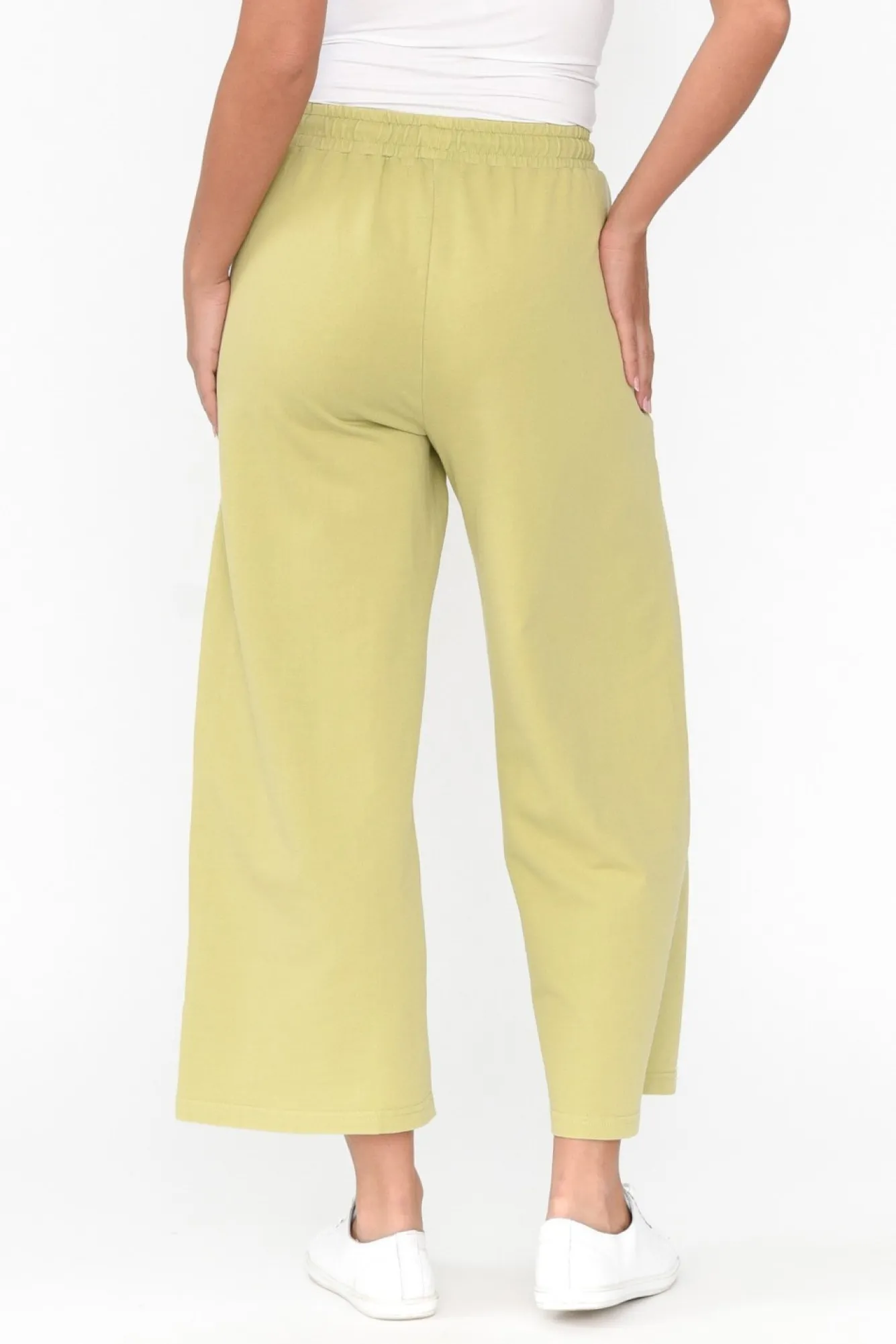 Fit: True To Size. Refer To Size & Fit Tab Below For Specific Size RecommendationNNfabric: Cotton / PolyesterNlightweight, Stretchy Cotton Blend With A Soft Handfeel And Unbrushed Fleece InnerNNruched Elastic Waistband With Drawstring Tie NNcropped Wide-Leg SilhouetteNNtwo Front Pockets With Feature Stitching DetailsNNNcare: Cool Gentle Machine Wash RecommendedNNcolour: Green With A Blue Drawstring