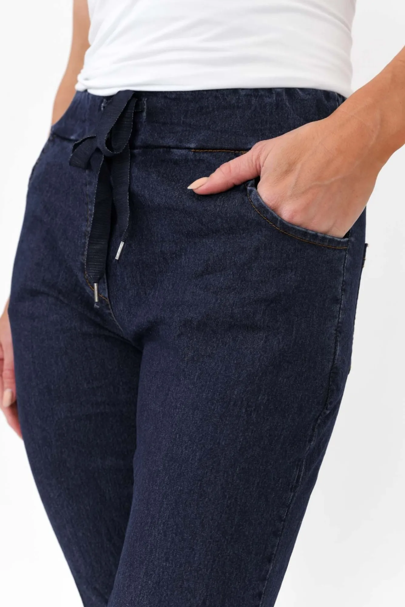 Fit: True To Size. Refer To Size & Fit Tab Below For Specific Size RecommendationNNfabric: 75% Cotton, 20% Polyester, 5% ElastaneNultra-Lightweight And Stretchy Cotton Blend With A Crisp, Smooth Hand Feel Nwear With A Relaxed Crushed Effect Or Steam For A Sleek LookNmade In ItalyNstretchy, Drawstring Waistband That Sits Just Below The Belly Button Nfaux Fly Detail Nversatile Straight Leg In A Relaxed FitNNfour Functional Pockets – Two At The Front, Two At The Back Nfull-Length Style Falls To The Ankles NNcare: Cool Gentle Machine Wash RecommendedNNcolour: Dark Wash Denim BlueNNnote: Please See Photos Rather Than Video For Most Accurate Colour.