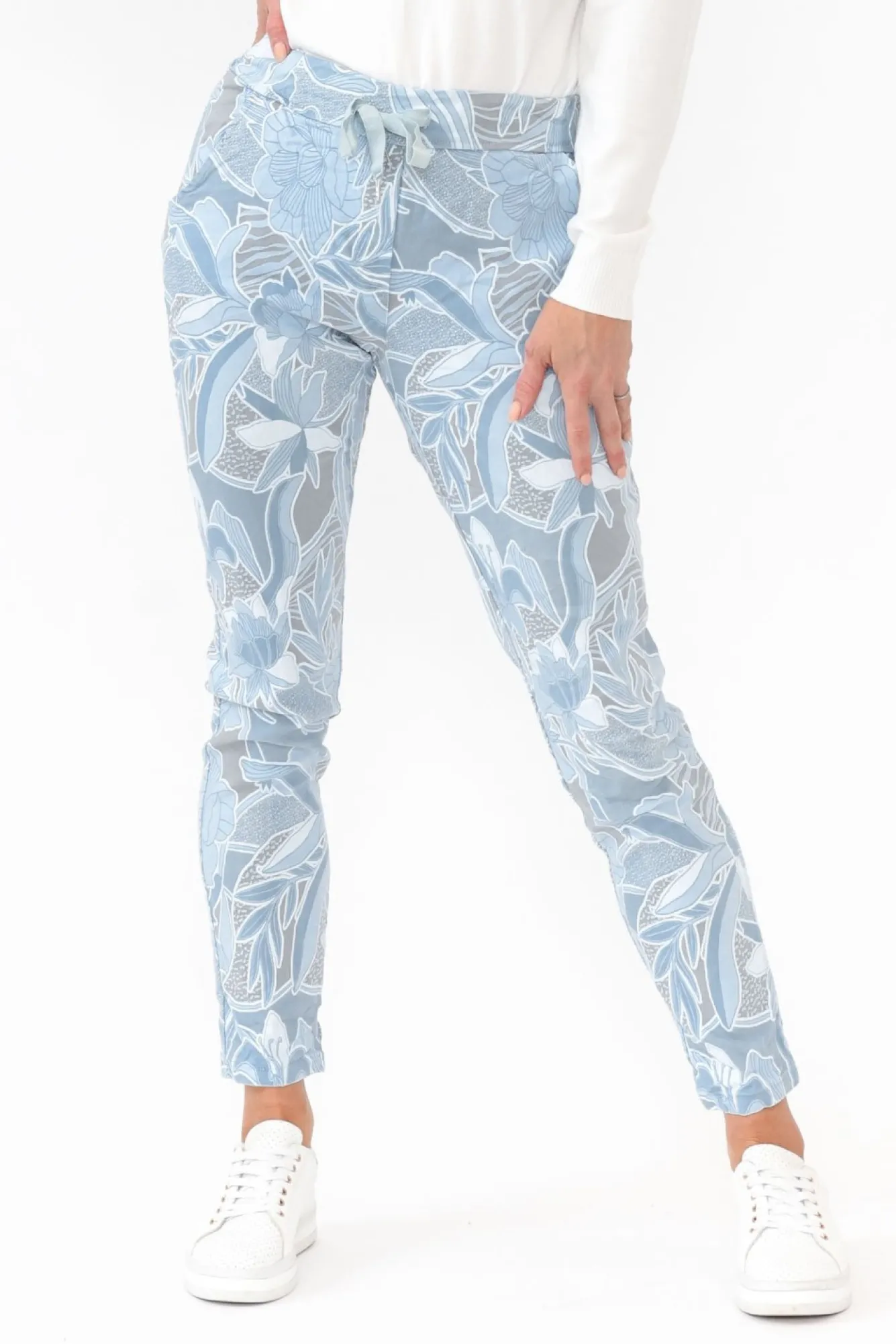 Fit: True To Size. Refer To Size & Fit Tab Below For Specific Size RecommendationNNfabric: 77% Viscose, 18% Polyamide, 5% ElastaneNlightweight And Stretchy Viscose Blend With A Crisp, Textured Hand Feel And A Fuss-Free Crinkled Texture NNmade In ItalyNstretch Waistband With A Drawstring For All-Day Comfort Nrelaxed, Straight Leg SilhouetteNNfour Functional Pockets – Two At The Front, Two At The BackNNfull-Length Falls To The AnklesNNNcare: Cool Gentle Machine Wash RecommendedNNcolour: Sky Blue With A Lovely Floral OverlayNNnote: Please See Photos Rather Than Video For Most Accurate Colour.