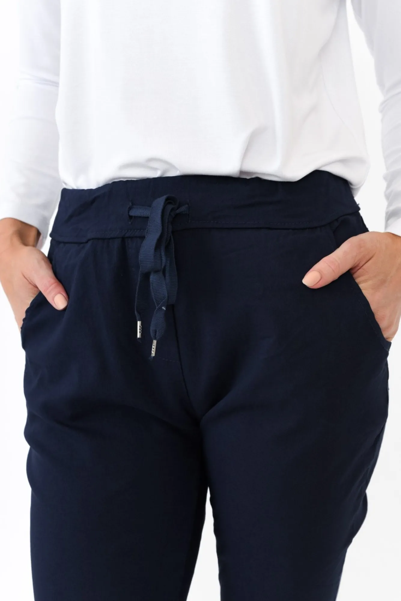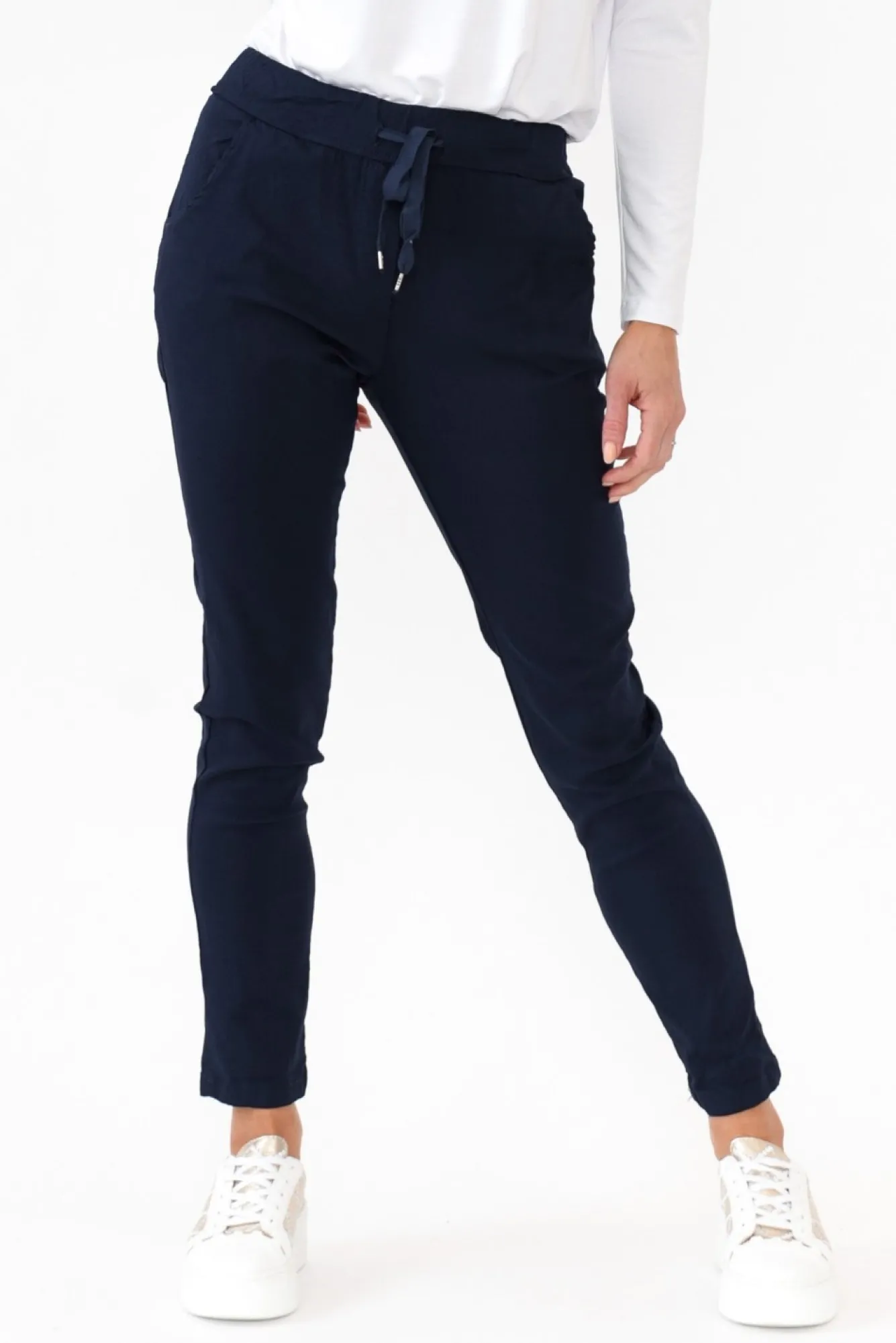 Fit: True To Size. Refer To Size & Fit Tab Below For Specific Size RecommendationNNfabric: 77% Viscose, 18% Nylon, 5% ElastaneNmade In Italy From A Lightweight And Stretchy Crinkle Fabric With A Textured Hand Feel Nwear With A Relaxed Crushed Effect Or Steam For A Sleek LookNstretchy, Ruched Elastic Waistband With A Drawstring Complemented By A Faux FlyNmid-Rise Waist Sits Just Below The NavelNstraight Leg Silhouette Offers Limitless Styling Possibilities!NNfour Functional Pockets – Two At The Front, Two At The Back Nfull Length Falls To The Ankle NNcare: Cool Gentle Machine Wash RecommendedNNcolour: True Navy Blue
