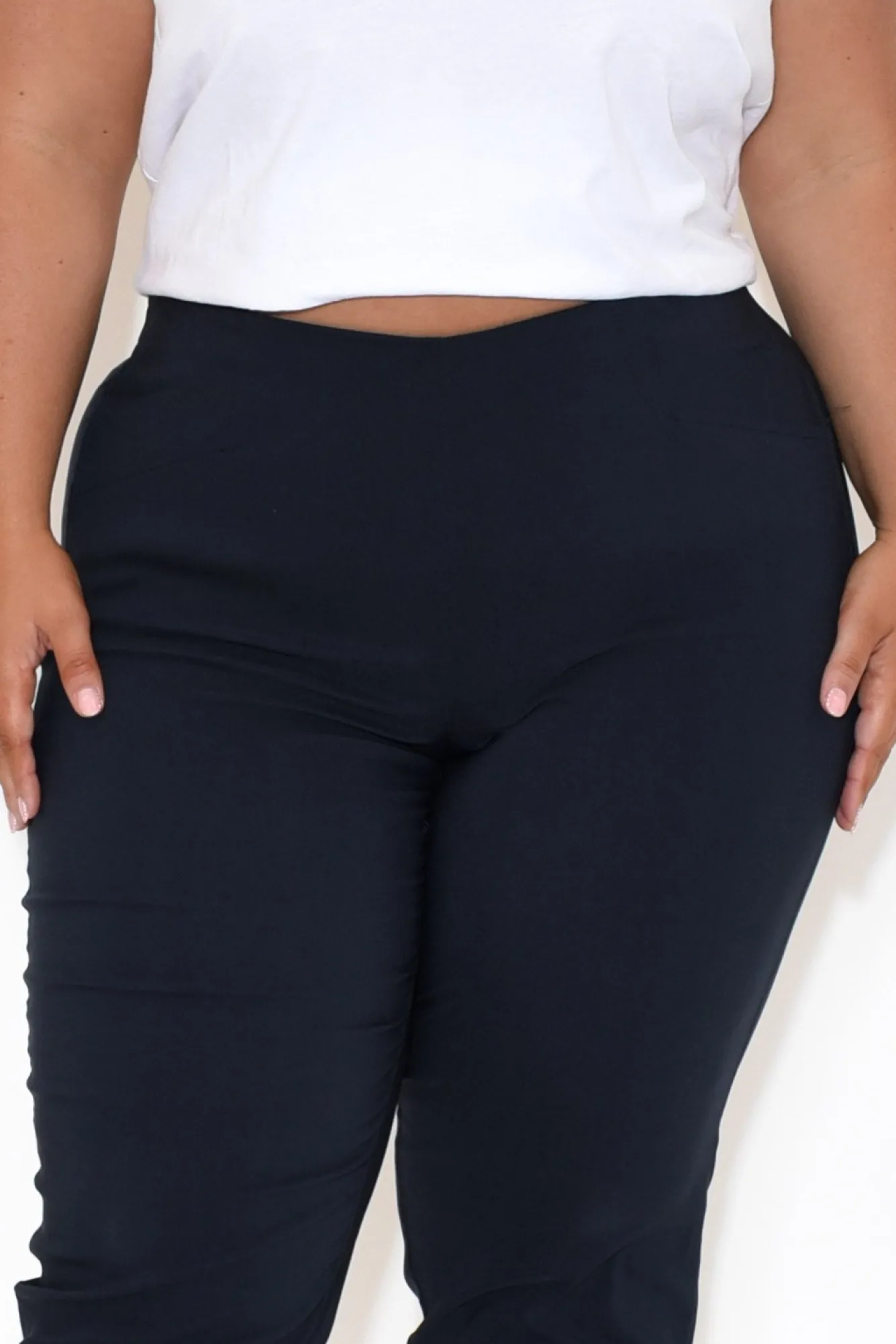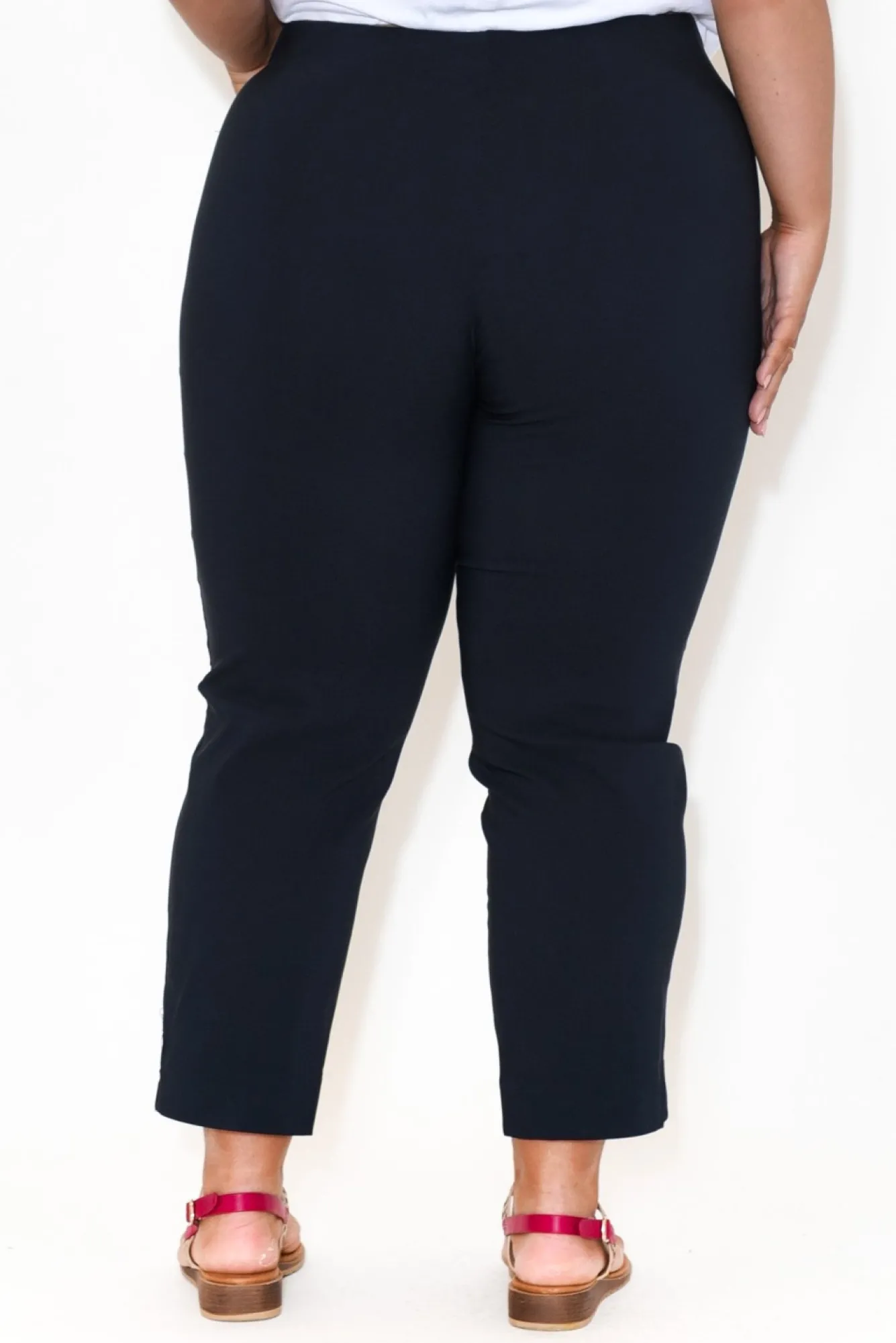 Fit: True. Refer To Size & Fit Tab Below For Specific Size Recommendation NNfabric: 65% Viscose, 30% Nylon, 5% ElastaneNlightweight, Breathable, Silky Stretch Fabric Nelastic On The Back Of The Pant, Leaving The Front Without Elastic Creates A Very Flattering And Elegant Look Ntwo Structural Front PocketsNstraight Leg Ncropped LengthNNcare: Cool Gentle Hand Wash RecommendedNNcolour: Classic Navy Shade