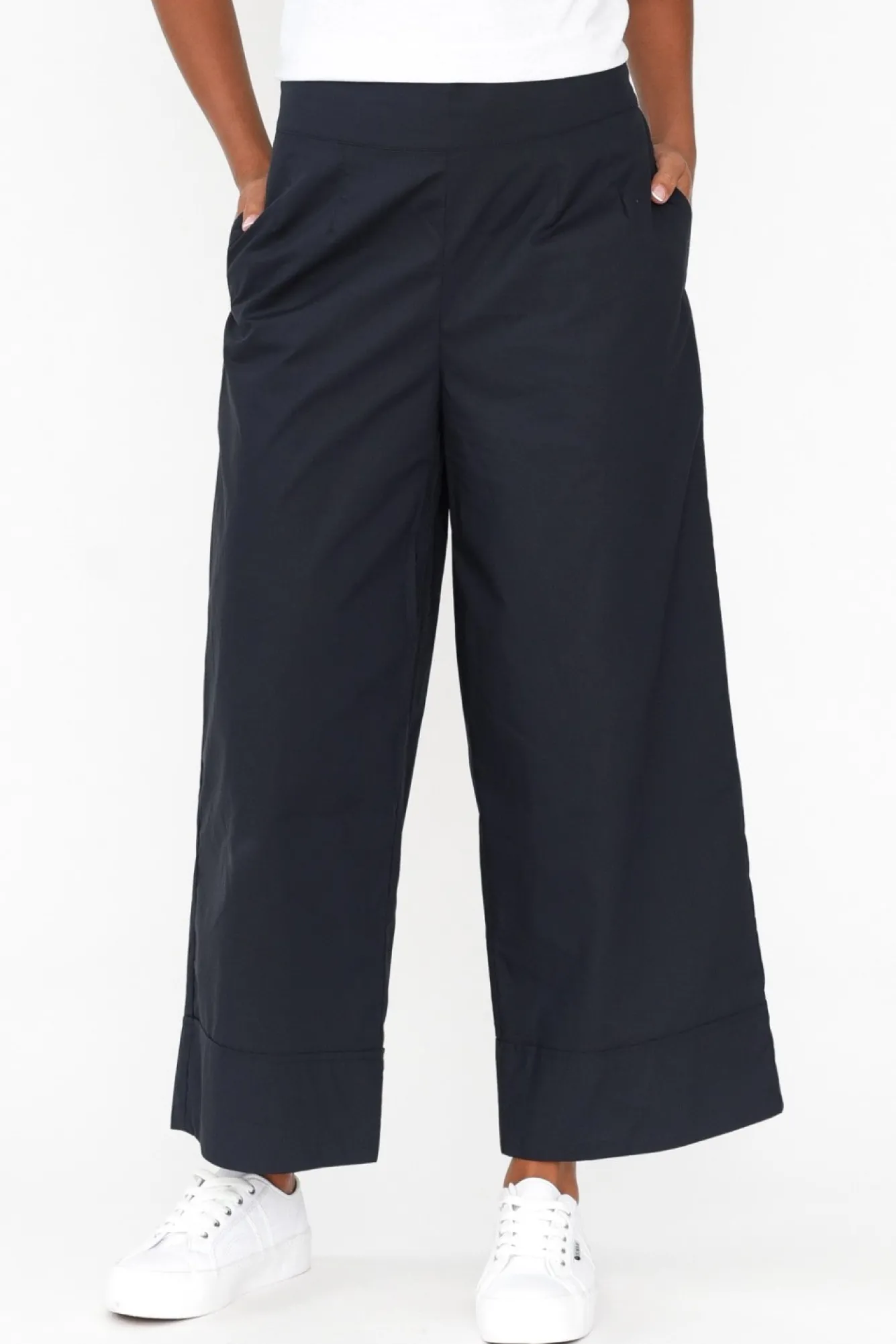 Fit: True To Size. Refer To Size & Fit Tab Below For Specific Size Recommendation NNfabric: 100% CottonNmidweight, Non-Stretch Cotton Offers A Beautifully Breathable And Soft Finish Ncomfortable, Stretchy Waistband Is Ruched At The Back And And Flat At The Front For A Sleek LookNtwo Practical Hip PocketsNchic Wide Leg Fit Falls To A Cropped LengthNNcare: Cool Gentle Machine Wash RecommendedNNcolour: Navy Blue