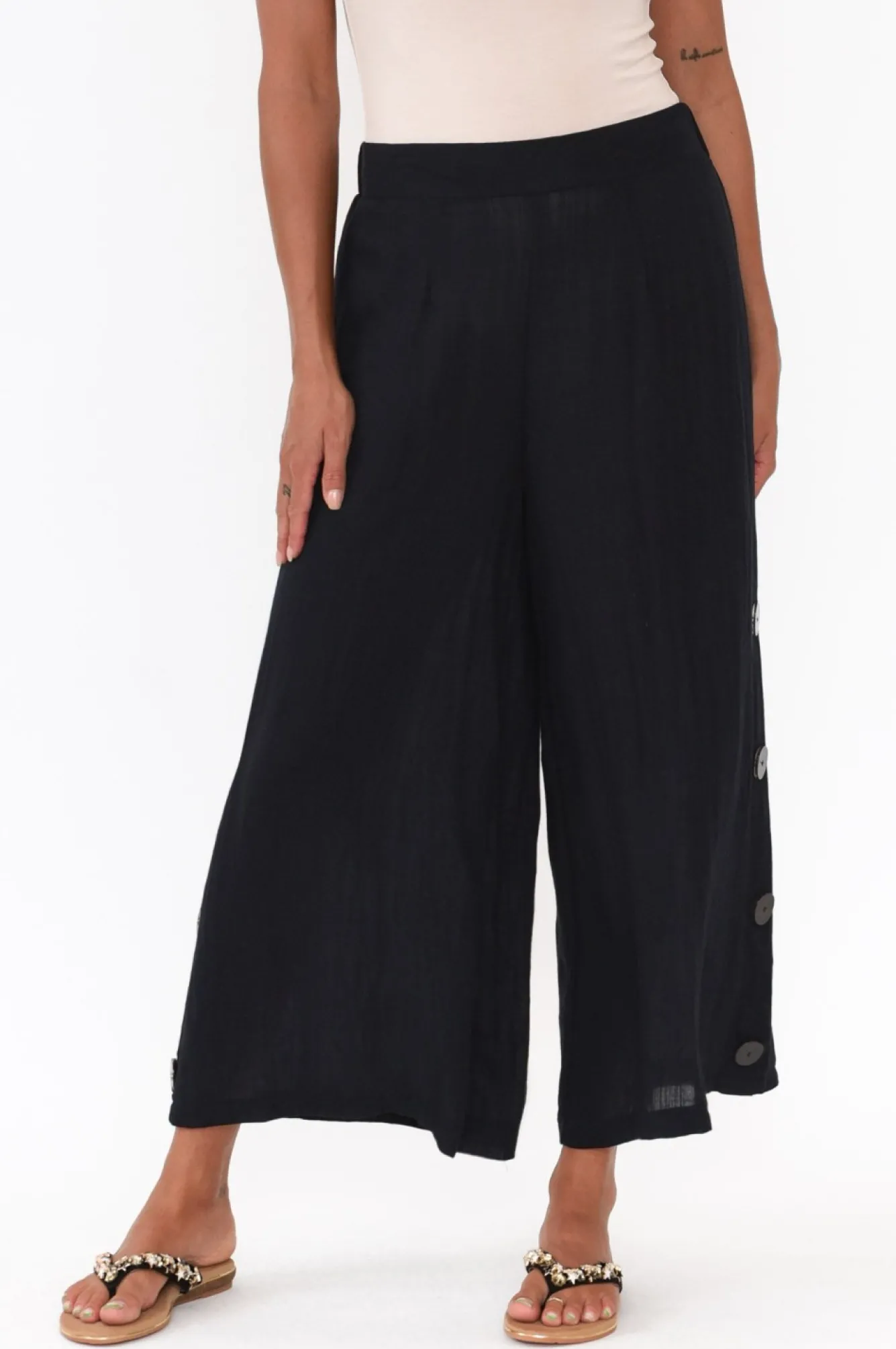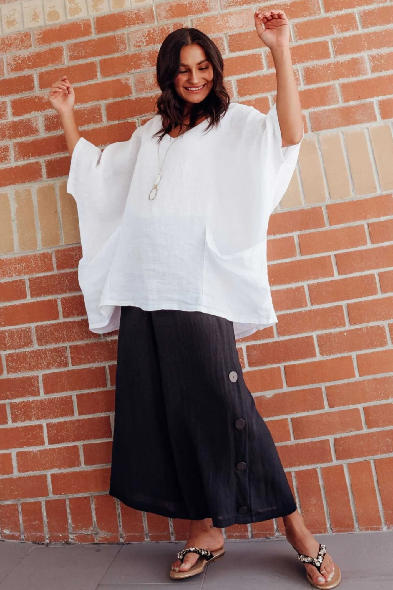 Fit: True To Size. Refer To Size & Fit Tab Below For Specific Size Recommendation NNfabric: Linen/Rayon BlendNlightweight, Non-Stretch Blend That Gives The Linen Look With A Soft Rayon Hand Feel Nflat Non-Stretch Waist Front With Stretchy Elastic Back For A Comfortable And Sleek LookNlarge Fixed Button Details At The Side NNwide Leg Silhouette – Easy To Move In And Perfectly Breezy For Warmer WeatherNNstraight Hem Falls To A Cropped Length NNcare: Cool Gentle Hand Wash RecommendedNNcolour: Classic Black Shade