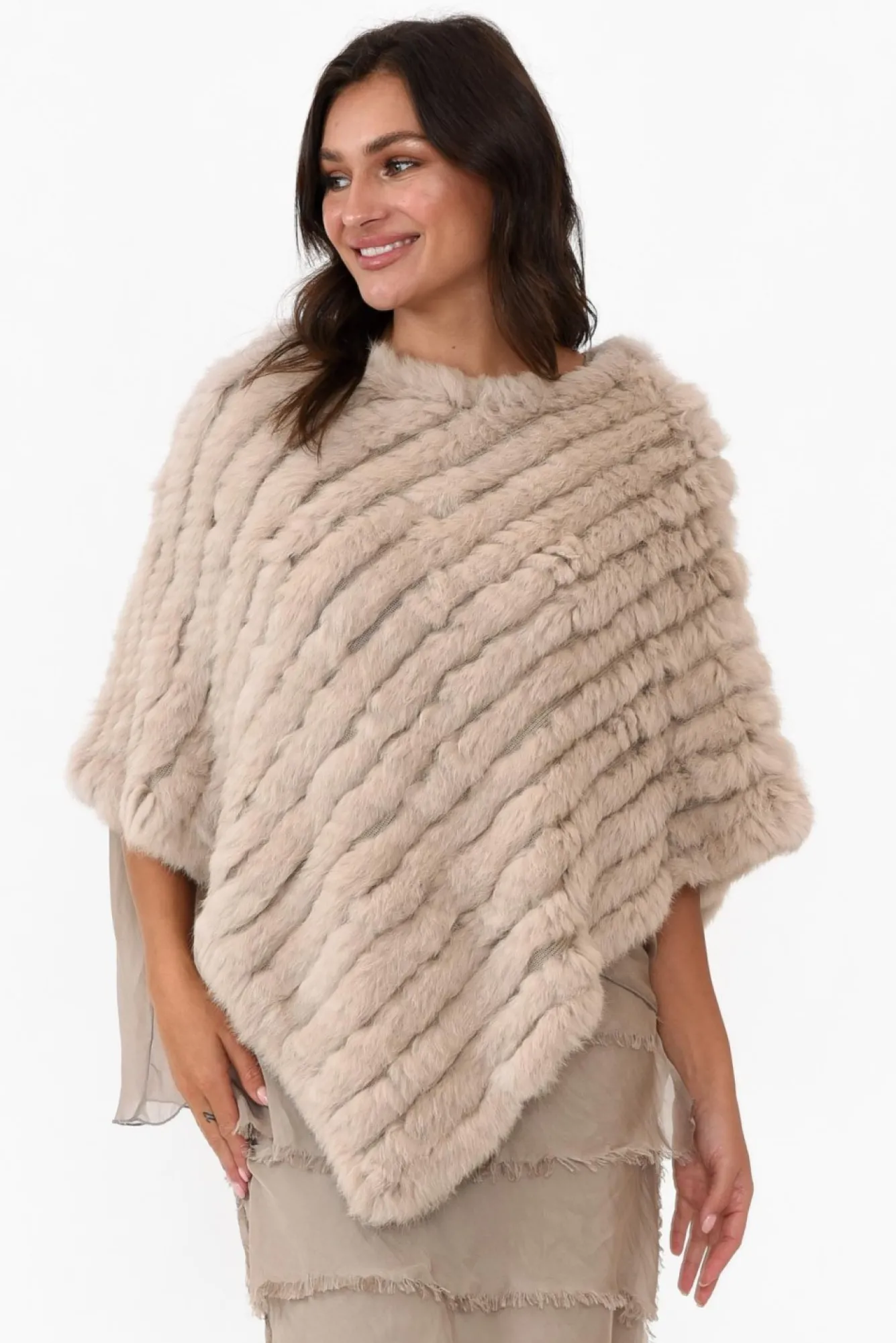 Fit: True To Size. Refer To Size & Fit Tab Below For Specific Size RecommendationNNfabric: Knitting: 100% Acrylic, Fur: 100% FurNlightweight, Stretchy Knit Poncho Adorned With Ultra-Soft Fur Arranged In An Elegant Diagonal Stripe Pattern Nthis Garment Is Designed Using Responsibly Sourced Rabbit FurNclassic Round Neckline NNtriangle Cut Hem In A True Poncho Style Creates A Flattering Draped SilhouetteNfalls To A Delicate Hip Length NNcare: To Be Cleaned By Fur Specialists OnlyNNcolour: Modern Stone White Hue