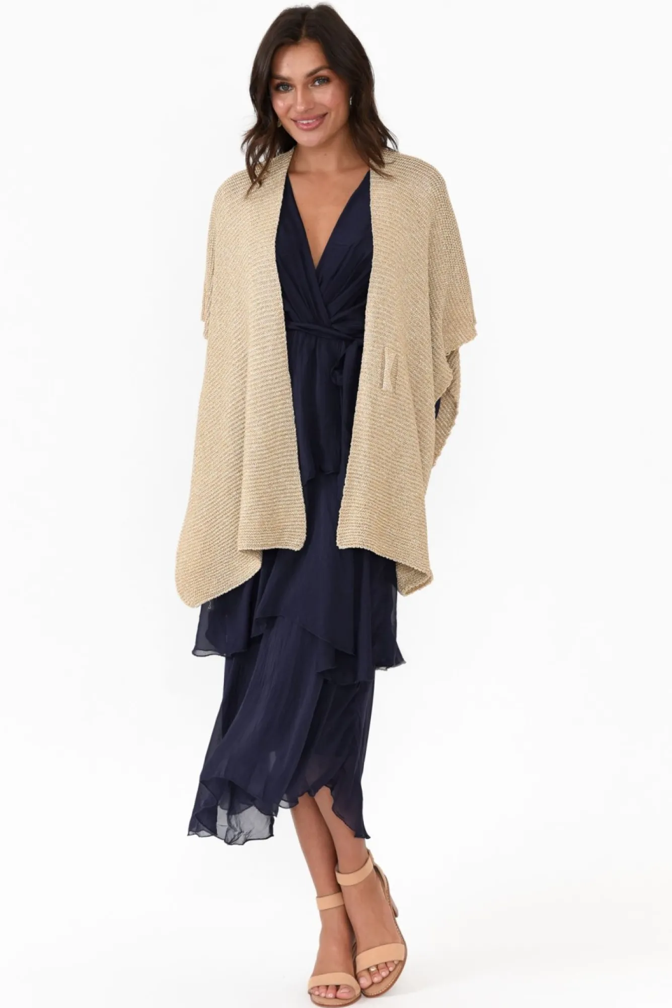 Fit: True To Size. Refer To Size & Fit Tab Below For Specific Size RecommendationNNfabric: 80% Viscose, 20% Metallic FibresNstretchy, Knit Fabric With A Ribbed, Woven Hand Feel And Statement Metallic Thread Throughout Nopen Square-Cut Shawl Designed To Be Draped Over The ShouldersNsecure With The Front Loop To Fasten The Garment And Create A Lovely Asymmetric Look Ndraped Silhouette Falls Below The Hips NNcare: Cool Gentle Hand Wash RecommendedNNcolour: Metallic Gold