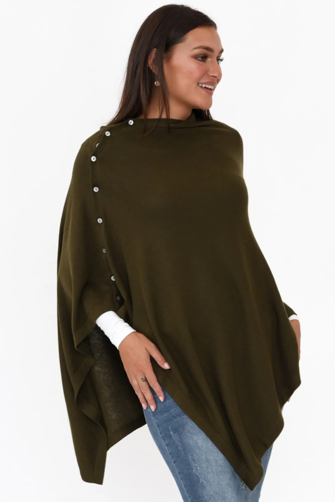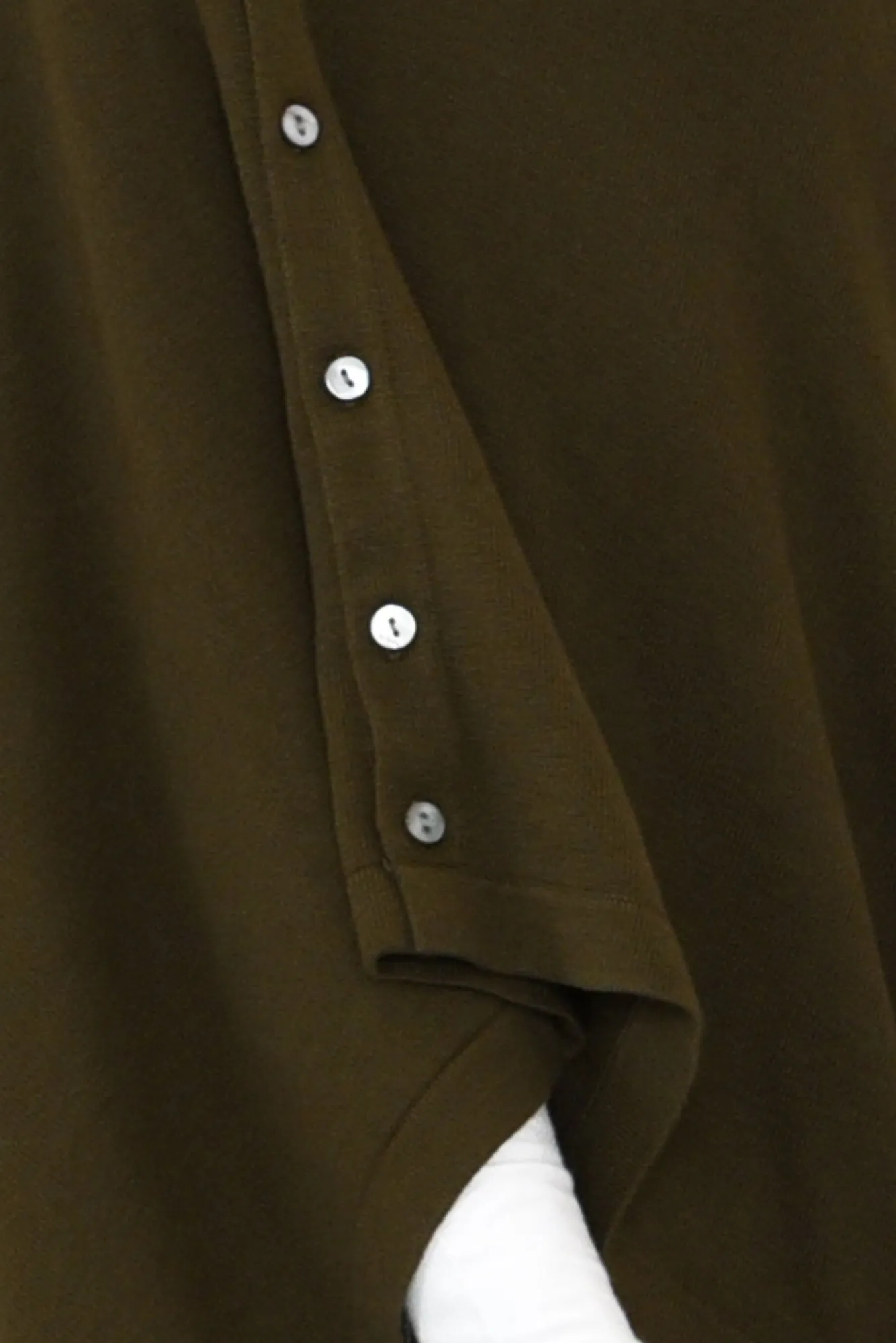 Fit: True To Size. Refer To Size & Fit Tab Below For Specific Size Recommendation NNfabric: 60% Cotton, 20% Modal, 20% ViscoseNmidweight, Soft, And Stretchy Convertible PonchoNfunctional Buttons Down The Side Allow This Garment To Be Styled As A Poncho, Wrap Or ThrowNangled High Neckline Folds Over Creating A Turtleneck Like LookNopen Style Poncho With No Armholes NNwhen Worn As A Poncho The Hem Comes To A Point At The Front And BackNbelow Hip-LengthNNcare: Cool Gentle Hand Wash RecommendedNNcolour: Dark Khaki Shade