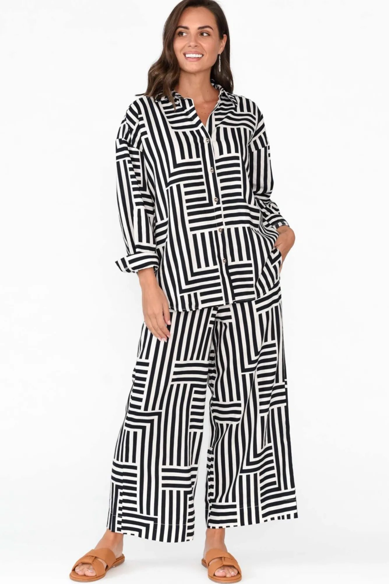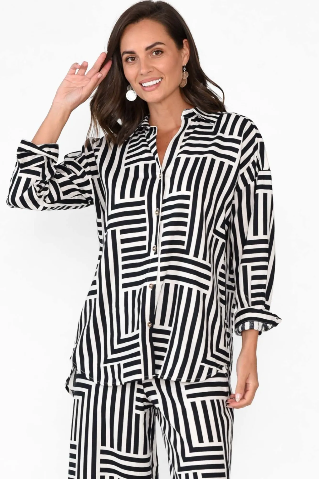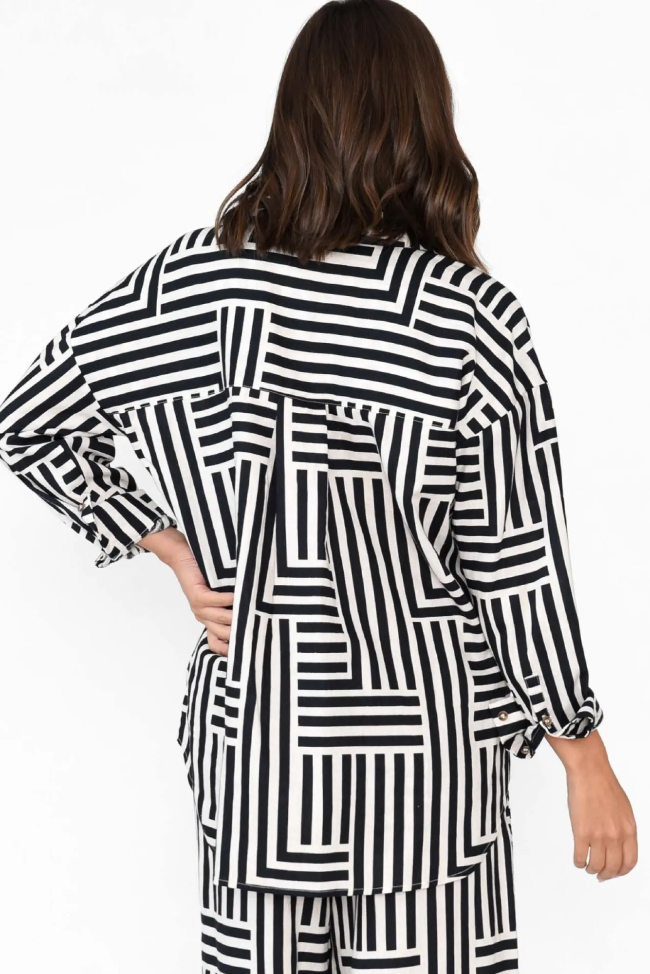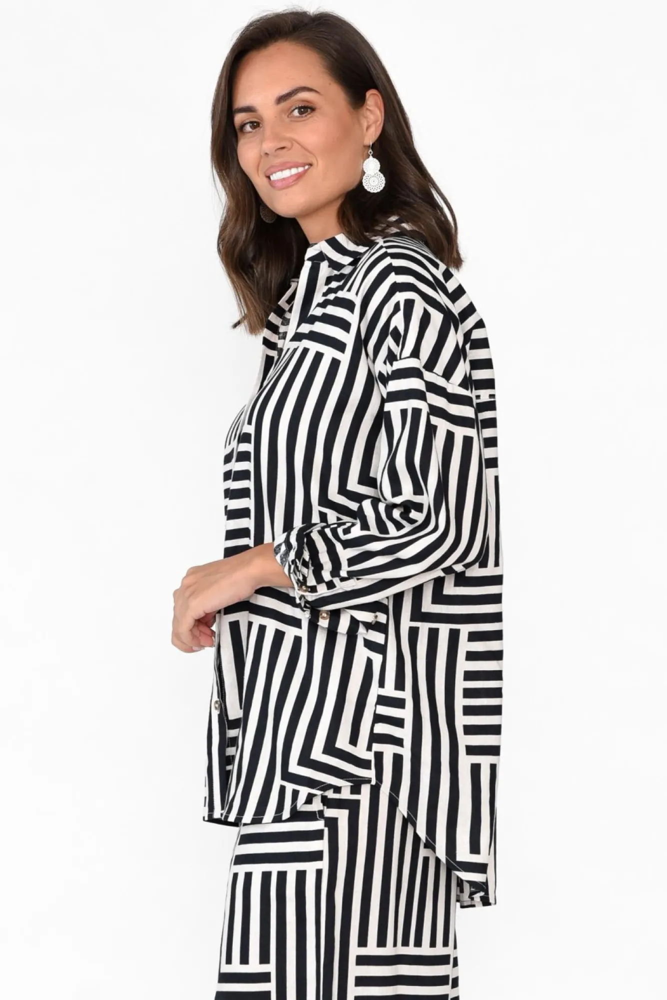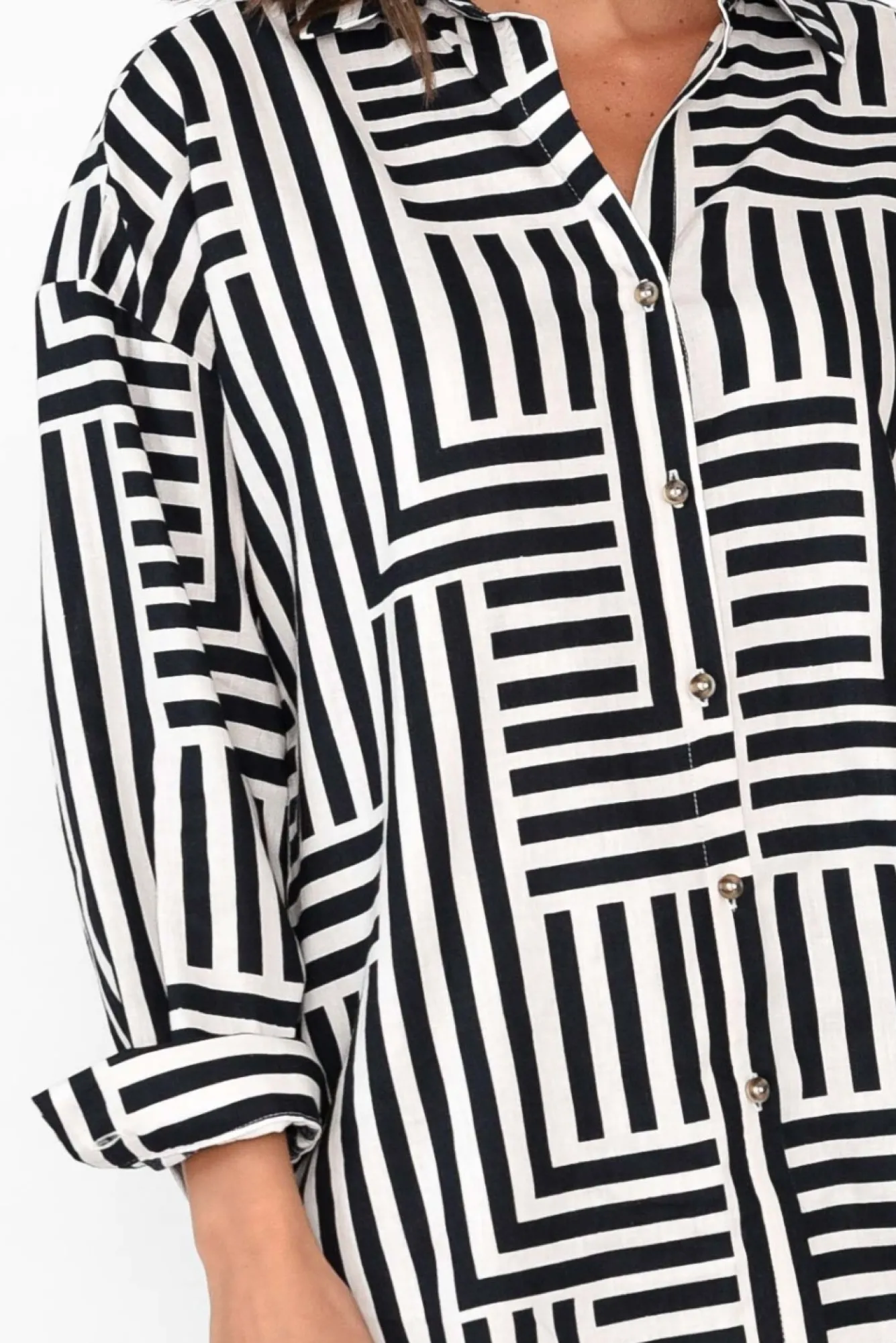 Fit: True To Size. Refer To Size & Fit Tab Below For Specific Size RecommendationNNfabric: 89% Lyocell, 11% Linen Nlightweight, Non-Stretch Fabric With A Luxuriously Soft And Smooth Hand FeelNsoft Collar Flows To A Button FrontNfull-Length Sleeves Finished With A Sleek, Wide Button CuffNflattering Straight SilhouetteNNhi-Lo Hem Falls Just Below The Hips For Added CoverageNNcare: Cool Gentle Machine Wash RecommendedNNcolour: Black Geo Stripe Print With A White Base