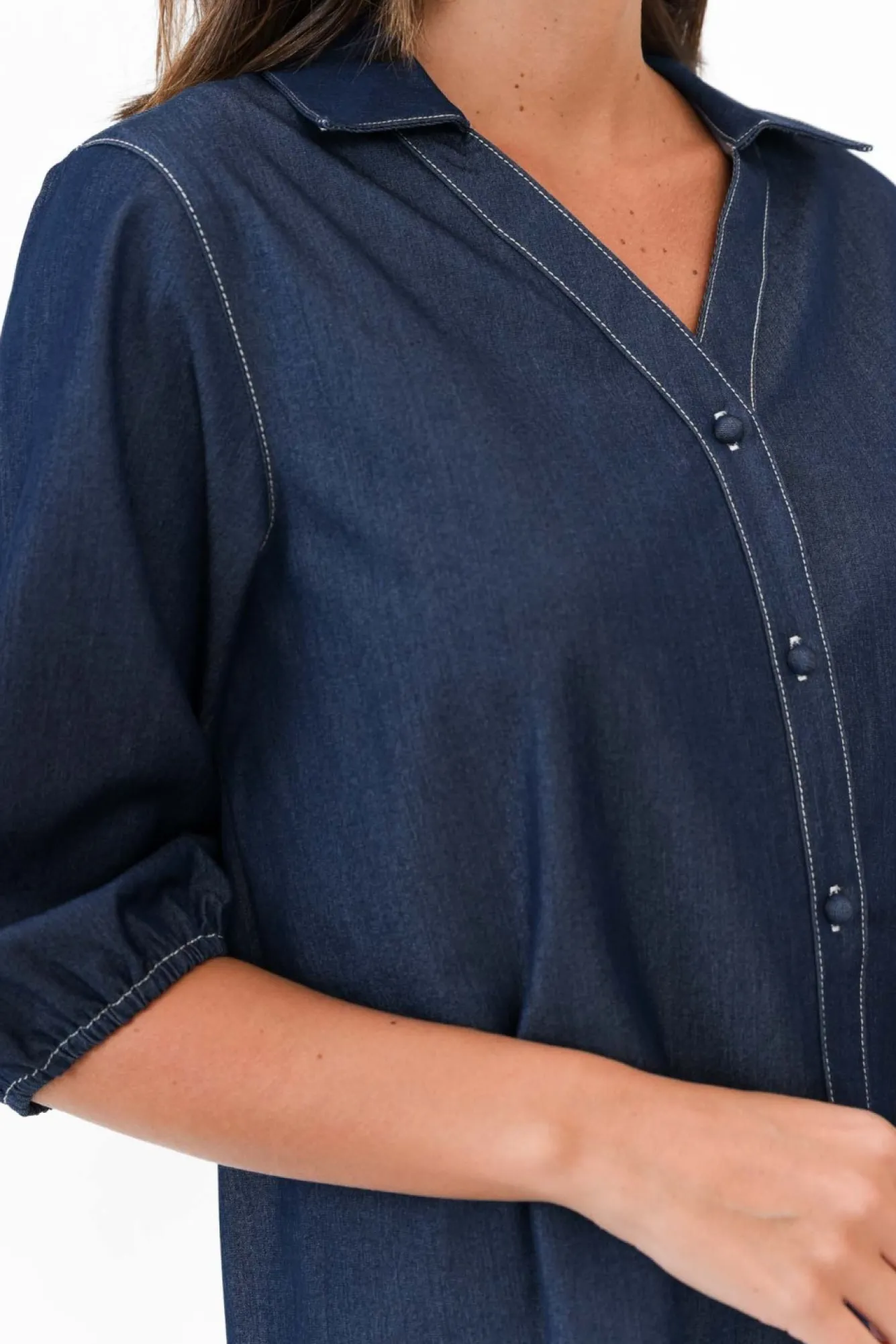 Fit: True To Size. Refer To Size & Fit Tab Below For Specific Size RecommendationNNfabric: 75% Tencel, 20% Rayon, 5% SpandexNlightweight, Non-Stretch Fabric With A Lovely Soft Hand Feel And Denim Look FinishNcollared Neckline Flows To A Button Front NNcontrast Stitching Throughout Elevates This StyleNhalf-Length Puff Sleeves With A Loose Elastic CuffNNstraight Silhouette Flows Over CurvesNNhi-Lo Hem Provides More Coverage At The Back With Splits At The Sides For Ease Of MovementNhip-Skimming LengthNNcare: Cool Gentle Hand Wash RecommendedNNcolour: Washed Denim Blue