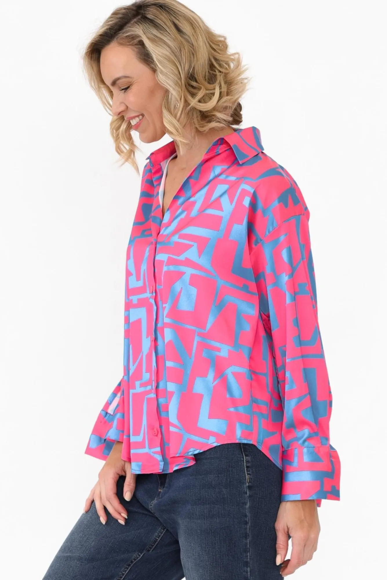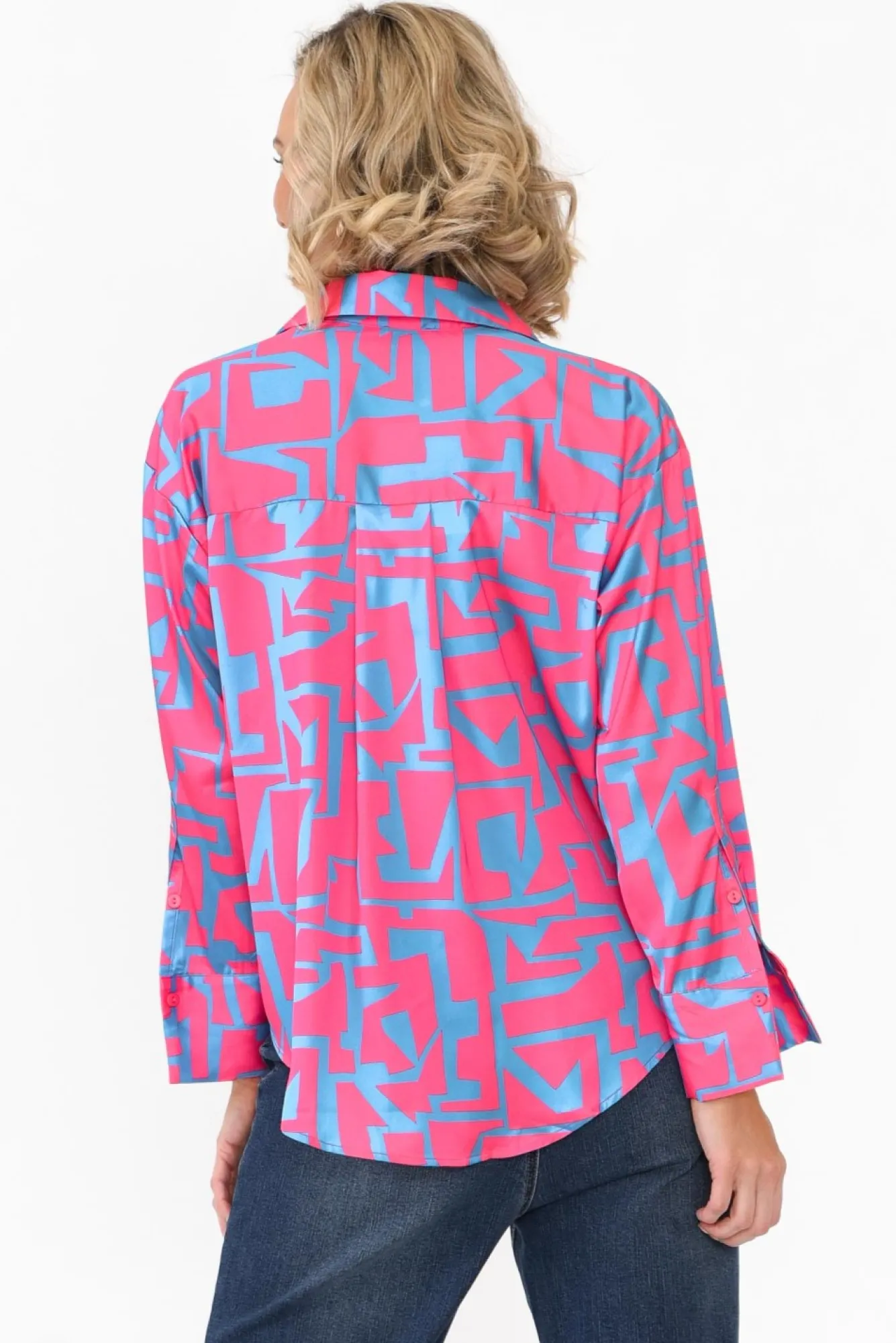 Fit: True To Size. Refer To Size & Fit Tab Below For Specific Size RecommendationNNfabric: 97% Polyester, 3% ElastaneNlightweight, Non-Stretch And Silky Soft Fabric With An Elevated Satin FinishNcollared Neckline Complemented By A Button FrontNelegant Full-Length Sleeves With A Button Cuff Neveryday Straight Silhouette In A Relaxed FitNcurved Hemline Falls To A Below-Hip Length NNcare: Cool Gentle Hand Wash RecommendedNNcolour Hot Pink Adorned With A Blue Geometric Pattern