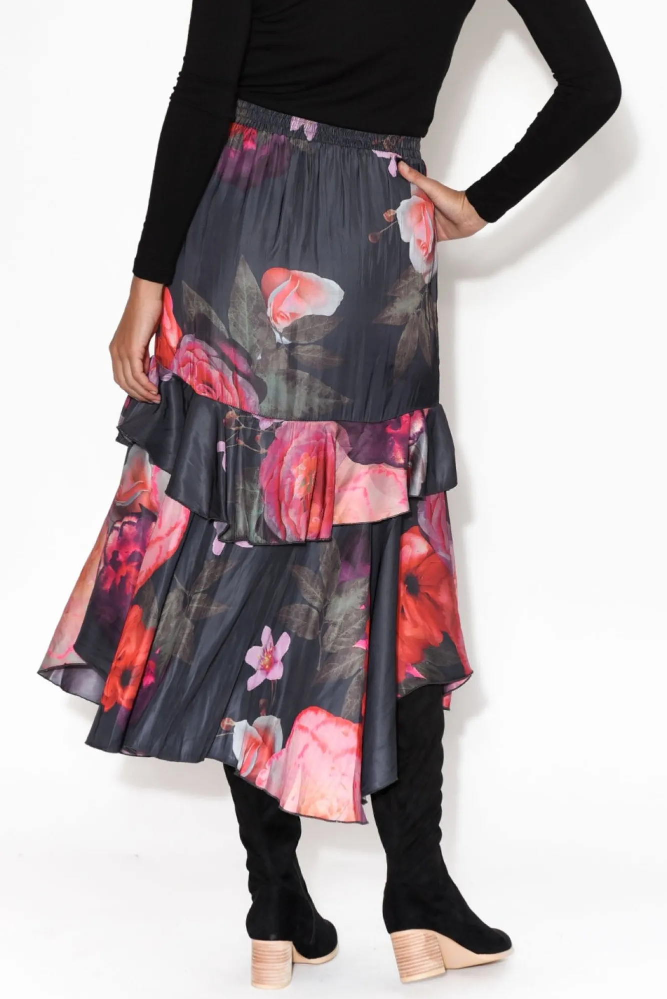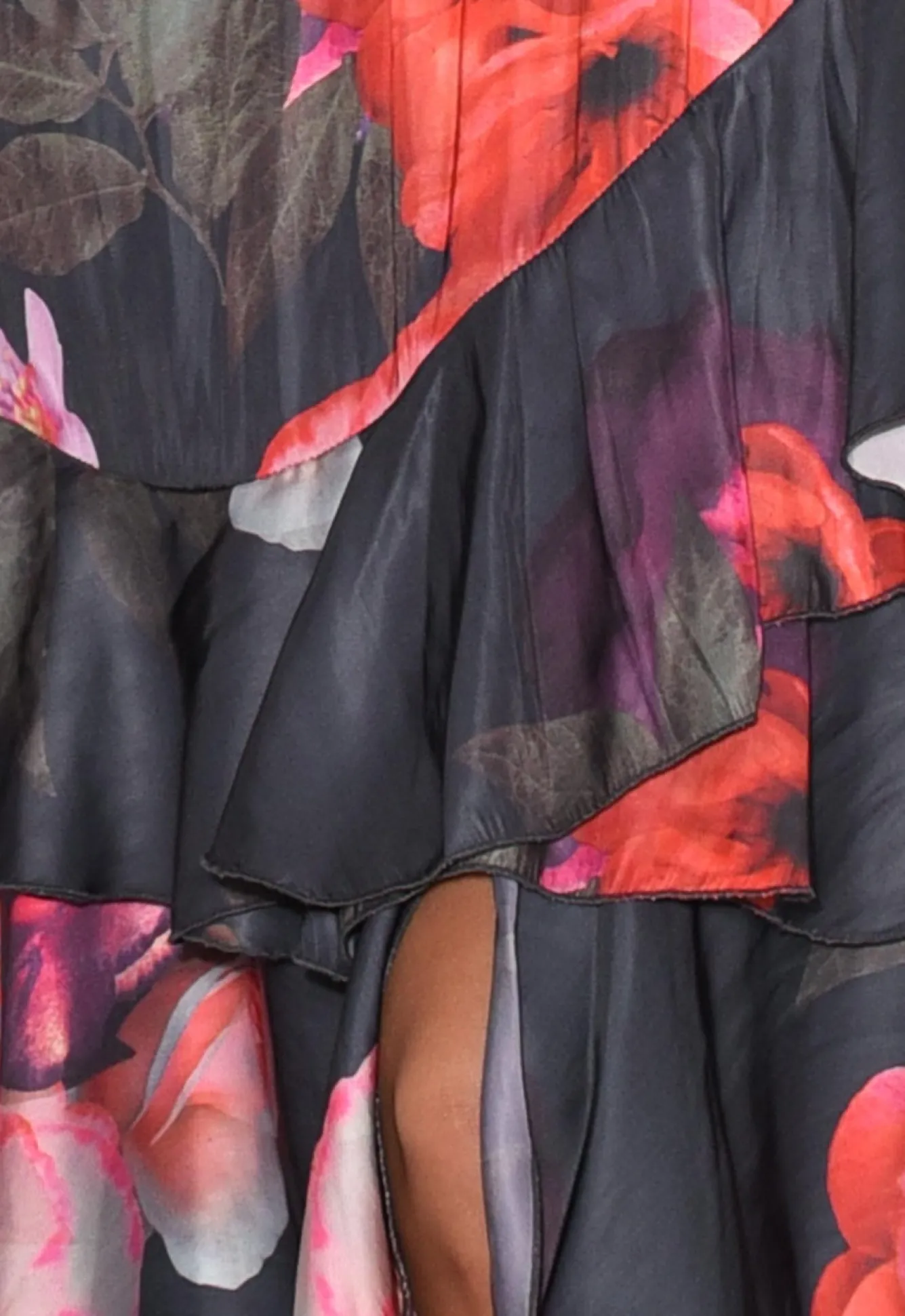 Fit: True To Size. Refer To Size & Fit Tab Below For Specific Size Recommendation NNfabric: 100% PolyesterNmidweight, Silky-Feeling, Non-Stretch Polyester FabricNNruched Elastic Stretch WaistbandNNasymmetric Ruffle Frilled Tiers Nfloaty A-Line Silhouette Flows Over CurvesNNsmall Slit At The Hemline For Easy MovementNNbelow-Knee LengthNNcare: Cool Gentle Machine Wash RecommendedNNcolour: Dark Navy Shade With Large Pink And Purple Florals