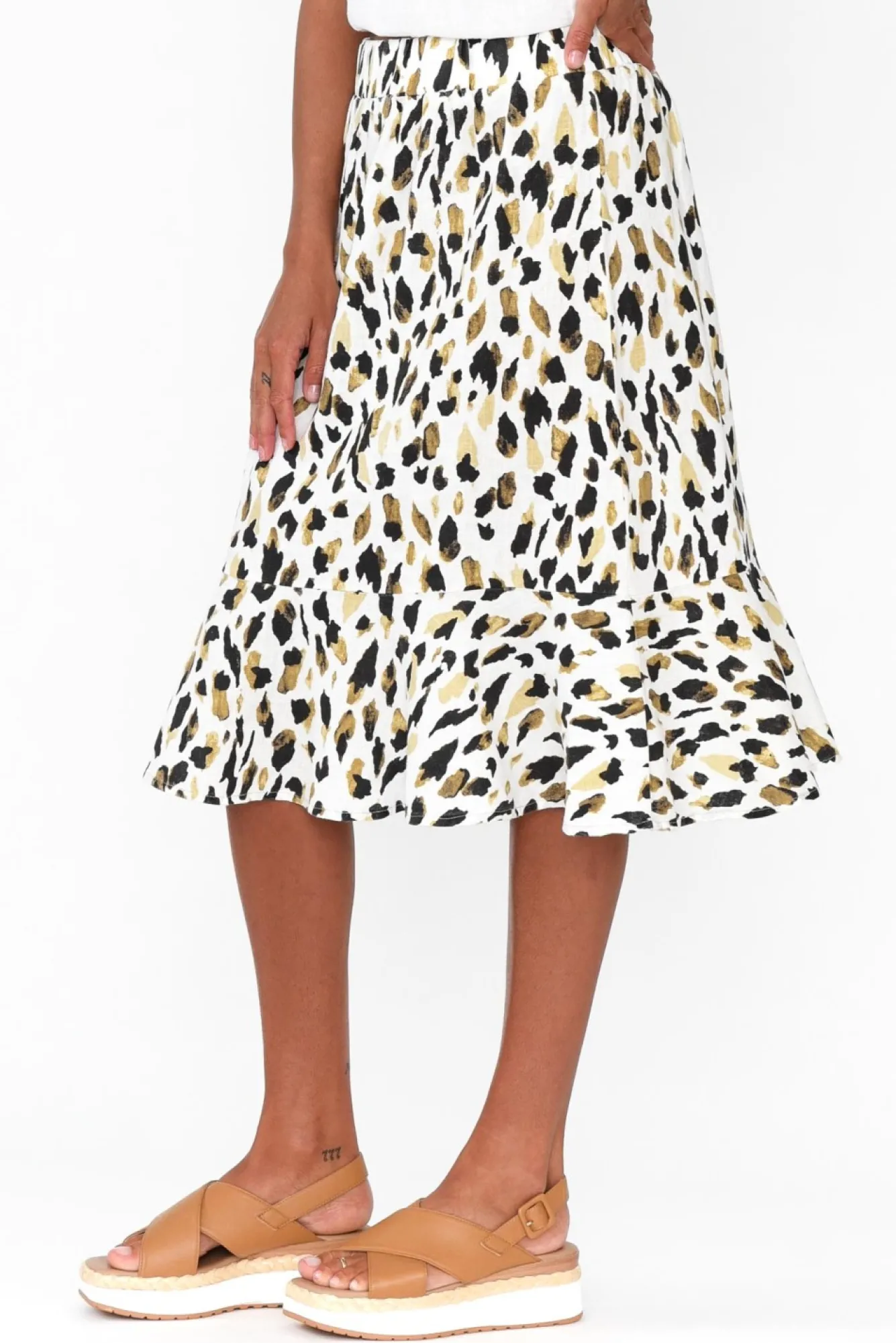 Fit: True To Size. Refer To Size & Fit Tab Below For Specific Size RecommendationNNfabric: 100% LinenNlightweight And Breathable Linen Skirt With A Classic Woven Hand FeelNstretchy, Ruched Waistband Sits At A Mid-Rise And Is Wide For A Supportive FeelNfeminine A-Line Silhouette For Ease Of MovementNNfrill Hem Falls To A Below-Knee LengthNNcare: Cool Gentle Hand Wash RecommendedNNcolour: White Base With A Yellow And Black Animal Print
