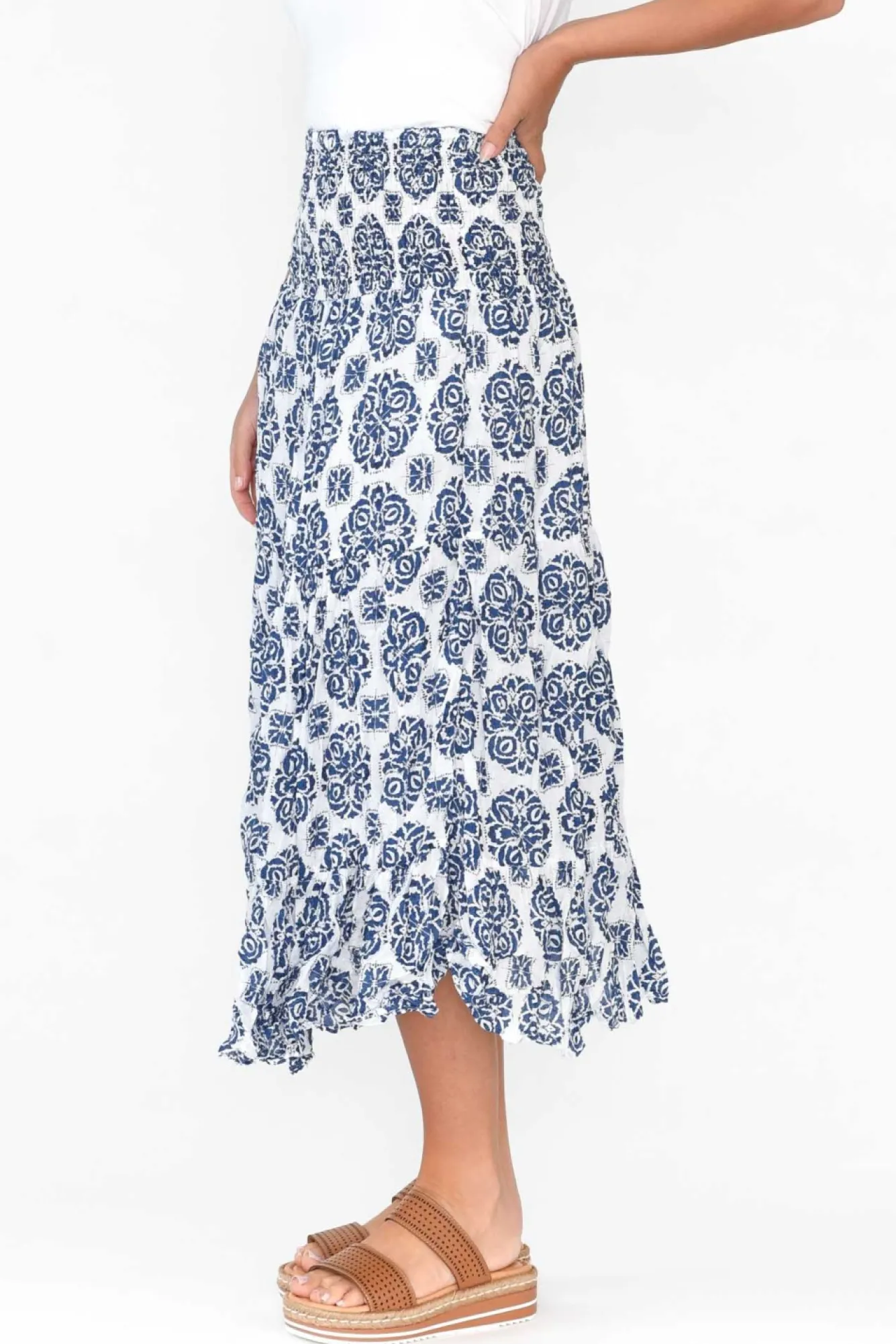 Fit: True To Size. Refer To Size & Fit Tab Below For Specific Size RecommendationNNfabric: 100% Cotton Nlightweight And Breathable Crinkle Cotton Skirt With A Lovely Woven, Non-Stretch Hand FeelNcrinkle Cotton Is The Ultimate Fuss-Free Fabric – Keep The Crinkle Effect By Storing Rolled UpNwide, Ruched, Elastic Waistband Supports The MidlineNNknee Length Lining For Additional CoverageNcan Be Worn High-Waisted For A Midi Length Or Lower For A Maxi Length NNa-Line Tiered Skirt Creates A Timeless, Polished LookNNcare: Cool Gentle Hand Wash RecommendedNNcolour: White Base With A Lovely Blue Damask Pattern