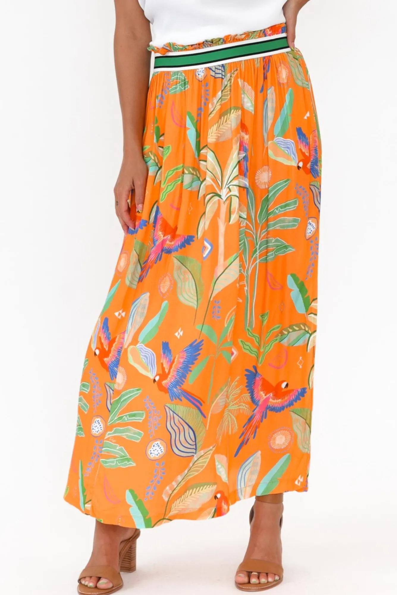 Fit: True To Size. Refer To Size & Fit Tab Below For Specific Size Recommendation NNfabric: 100% ViscoseNcrafted From Lightweight, Non-Stretch Fabric With An Ultra-Soft Hand Feel Ncomfortable Stretch Waist With Gorgeous Green And White Stripe Detailing Nrelaxed And Flowy A-Line SilhouetteNfeature 55Cm Front Split Located On The Left Side Of The Skirt Nstraight Hemline Falls To Classic Maxi Length NNNcare: Cool Gentle Machine Wash RecommendedNNcolour: Tangerine Base With Green Tropical Foliage And Birds