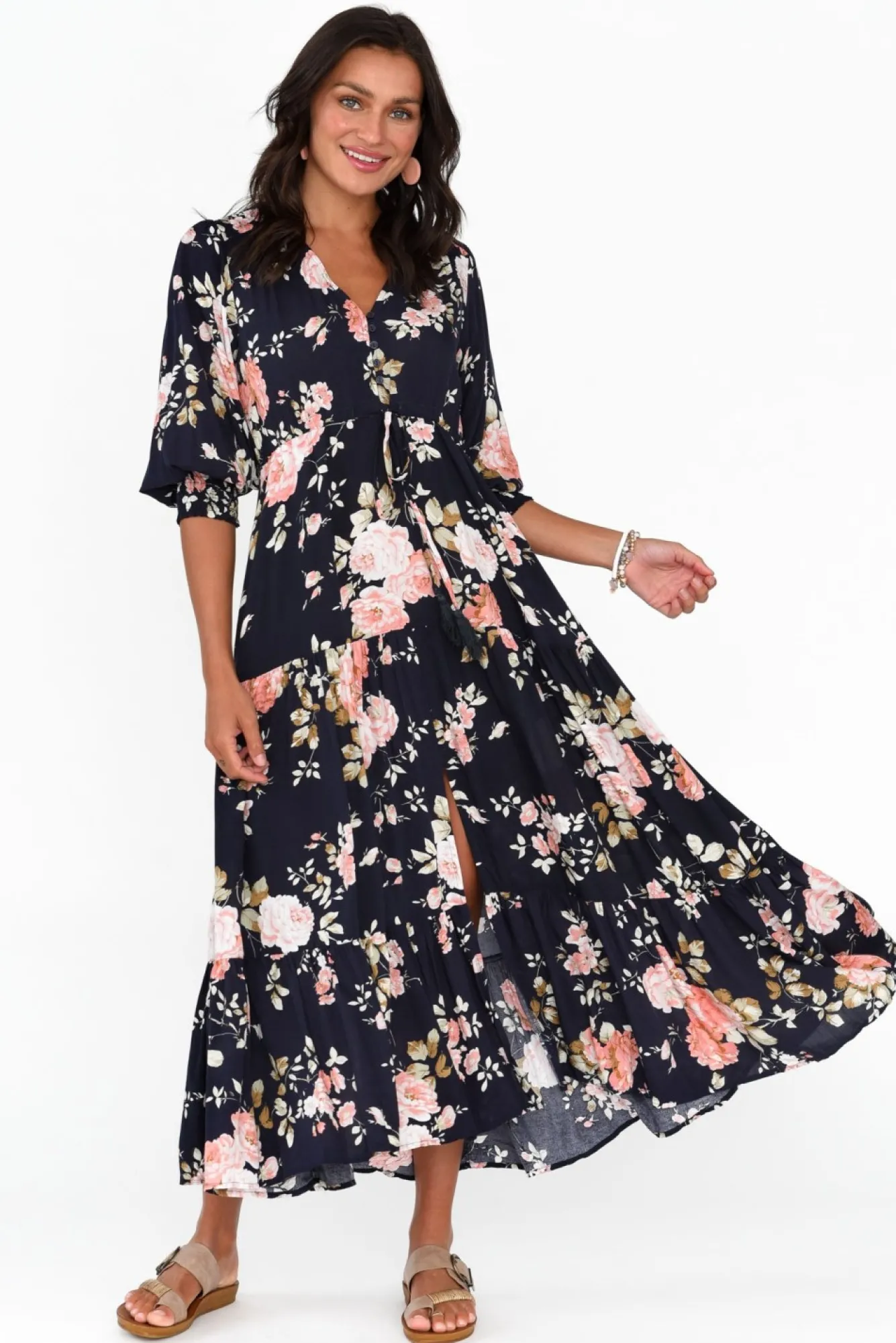 Sleeved Dresses<Silver Wishes Butler Navy Blossom Tie Maxi Dress