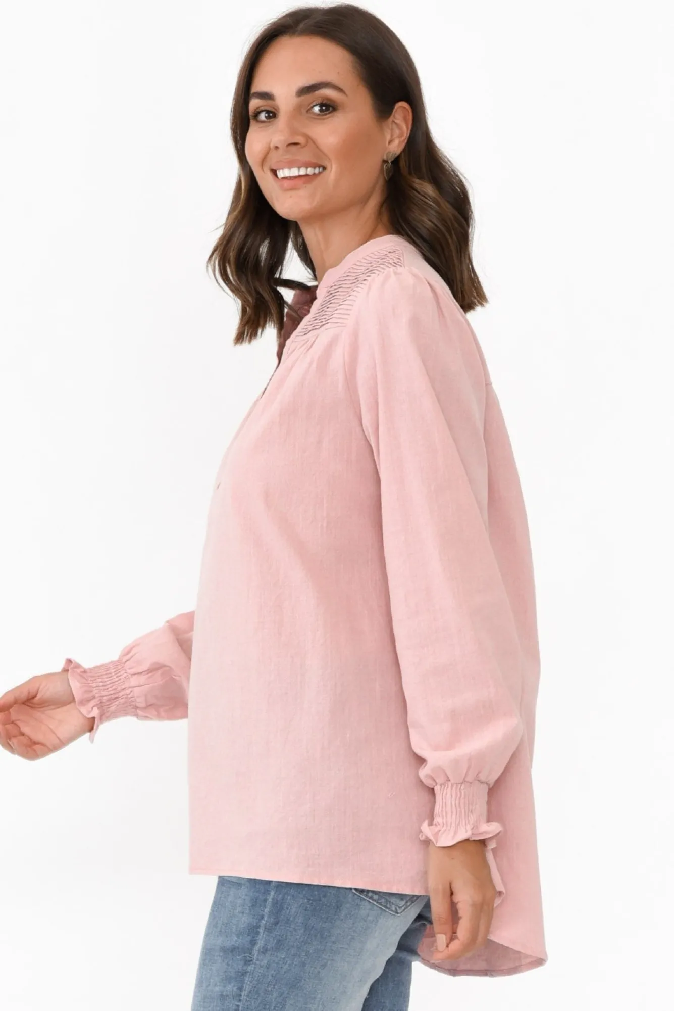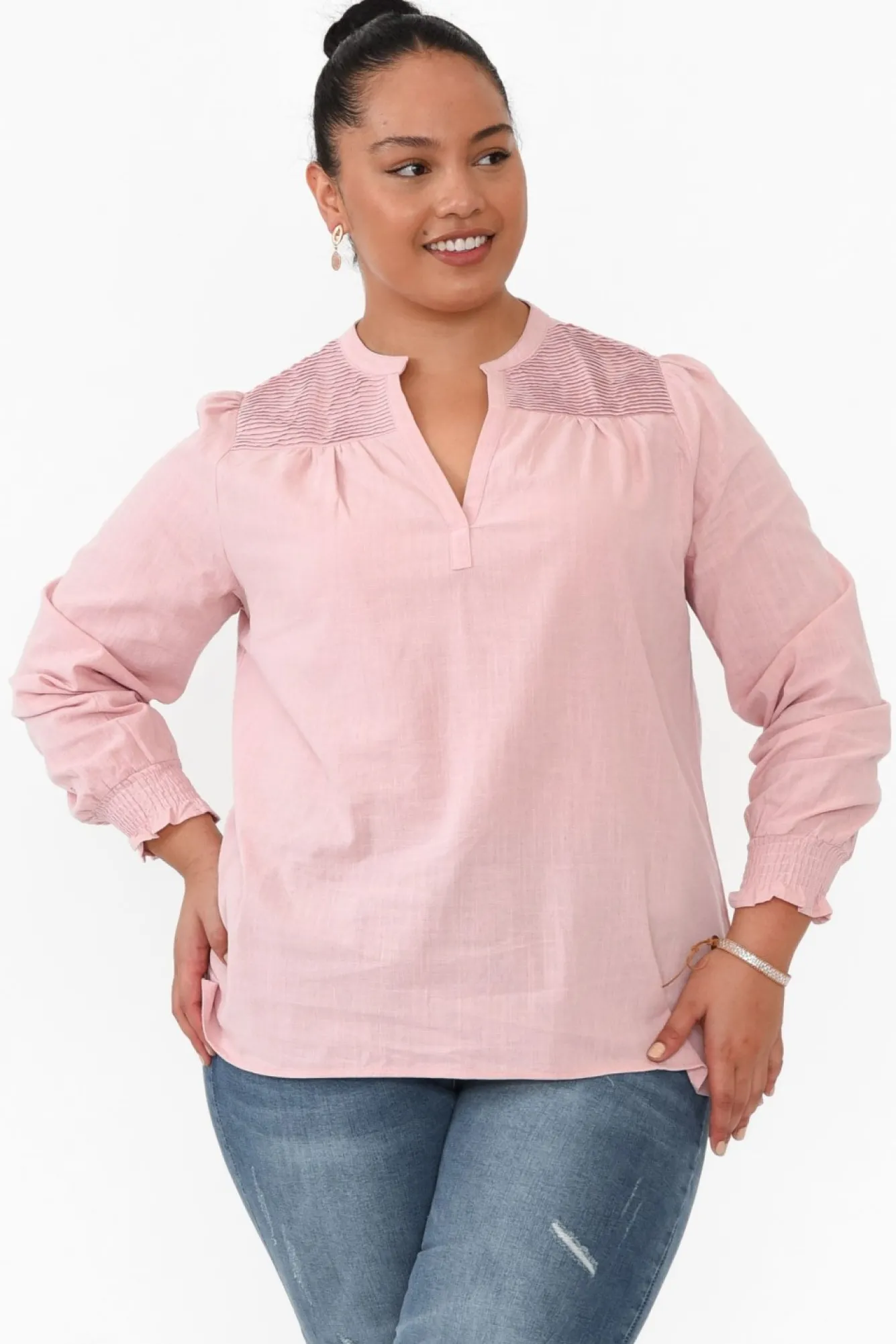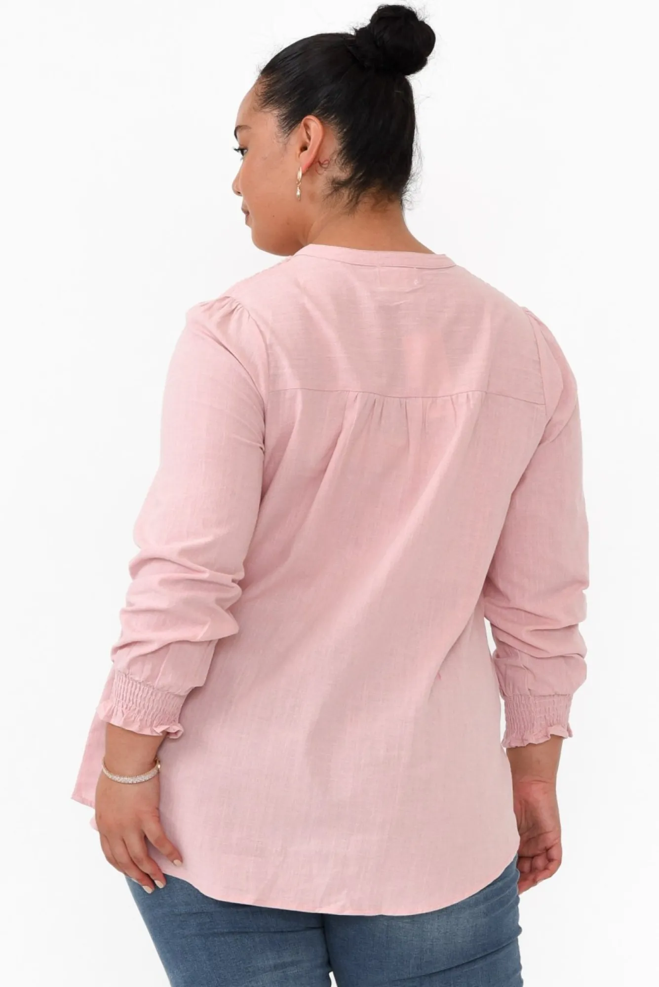 Fit: True To Size. Refer To Size & Fit Tab Below For Specific Size RecommendationNNfabric: 100% CottonNlightweight And Breathable Non-Stretch Cotton With A Subtle Textured Hand Feel NNclassic Rounded Neckline With A Deep Banded V Split Nfull-Length Sleeves With A Frilled Elasticated Cuff Npleated Feature Panel From The Shoulder To The BustNflattering A-Line Silhouette Flows Over The HipsNNslight Hi-Lo Hemline Is Straight At The Front And Curved At The BackNNhip-Skimming LengthNNcare: Cool Gentle Machine Wash RecommendedNNcolour: Dainty Blush Pink